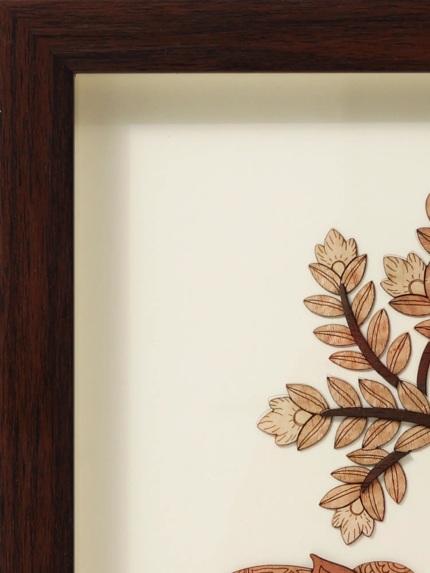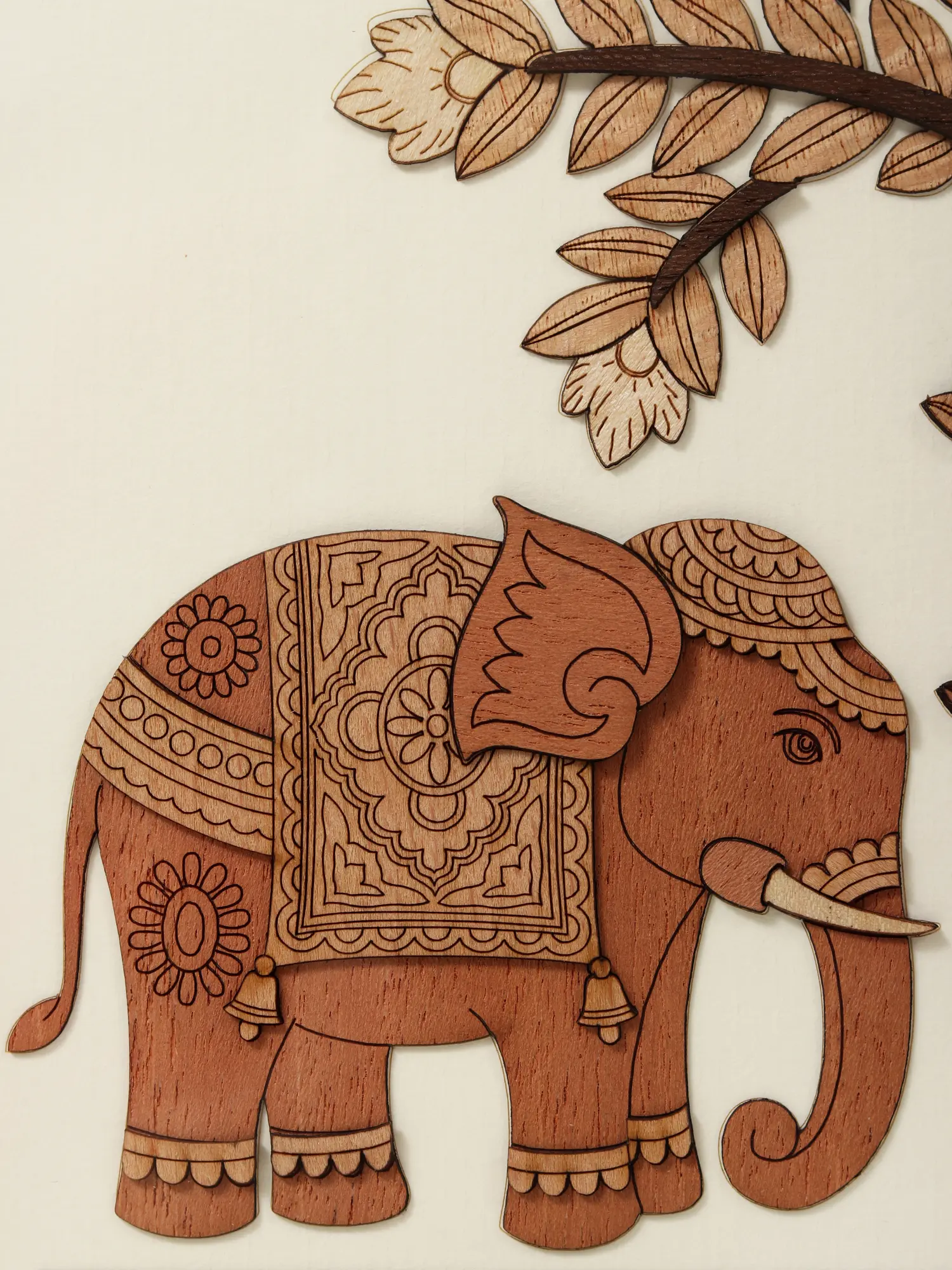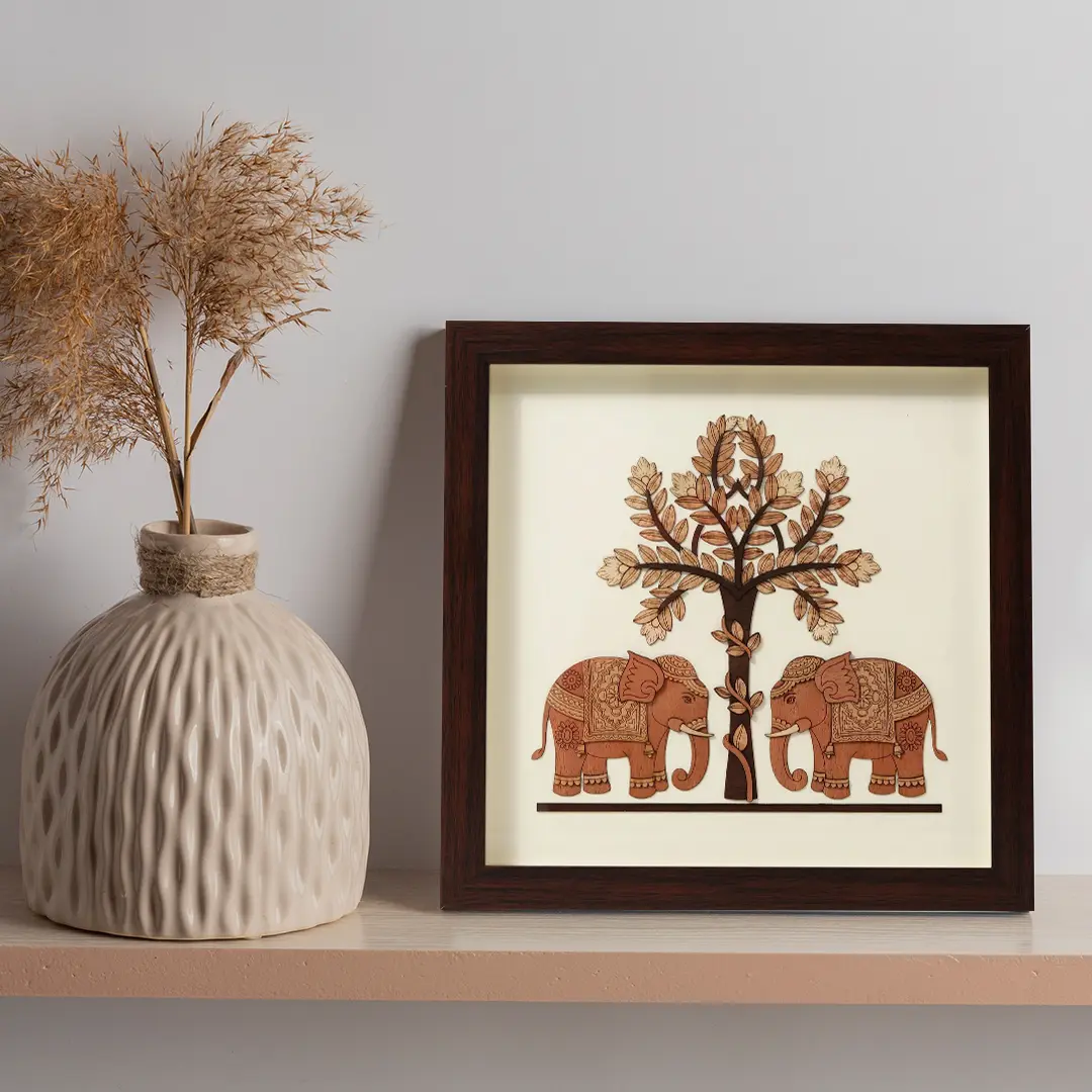 This Two Elephants Under the Tree Wood Art Wall Hanging is a stunning piece crafted using the Wooden Marquetry technique. This exquisite wall hanging features a tree with coiled vines at its center, skillfully surrounded by two beautifully depicted elephants. Wooden marquetry involves intricate inlay work with different wood veneers, showcasing the artisan's precision in creating detailed and harmonious designs.