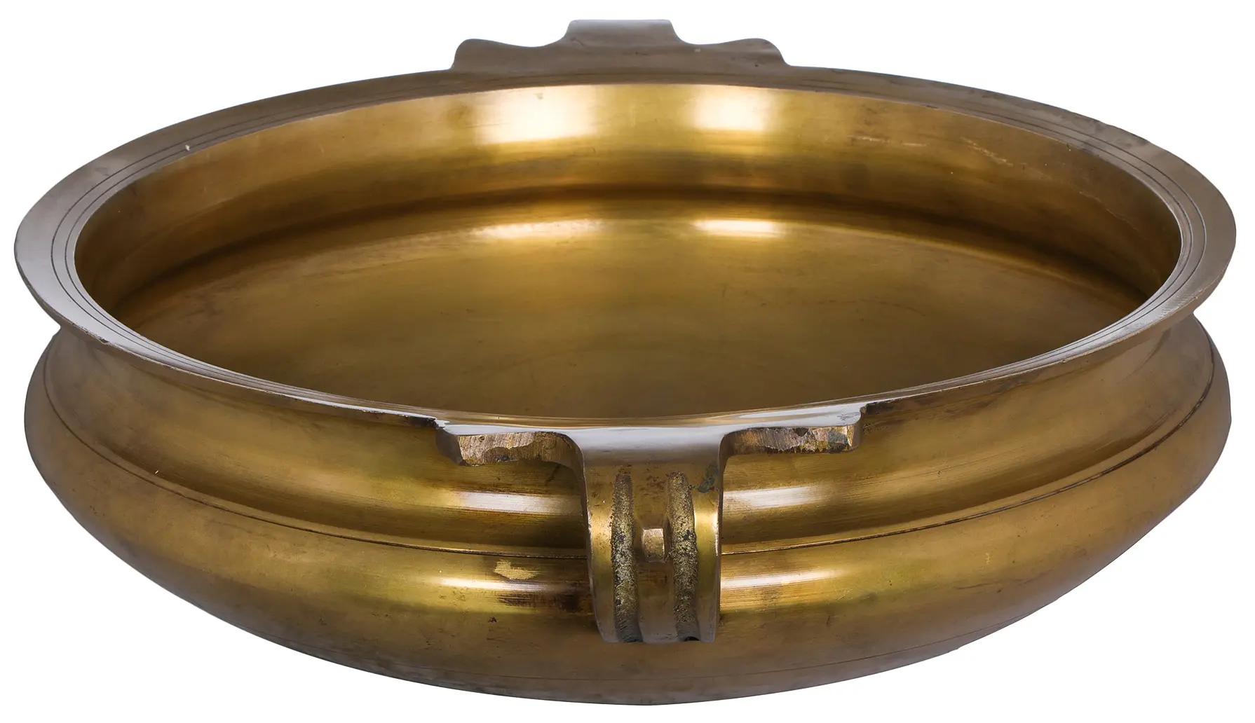 Invite the rich heritage and spiritual essence of Indian tradition into your home with this exquisite piece. More than just a decorative item, it is a symbol of reverence, prosperity, and culinary artistry. It speaks volumes of a bygone era, where craftsmanship was celebrated, and every object held a deeper meaning. The warm, golden hue of the brass emanates a sense of opulence and serenity, creating a captivating focal point in any room. Traditionally, this bowl was used in temples and homes to prepare "Prasadam" – a sacred offering of food. This offering is a symbol of devotion, gratitude, and nourishment, cooked with love and presented to the deities. Today, while its purpose can be diverse, it continues to embody that same spirit of sacredness and care. The intricate design of the handles, adds to its visual appeal, providing a sturdy grip and a touch of classical charm.