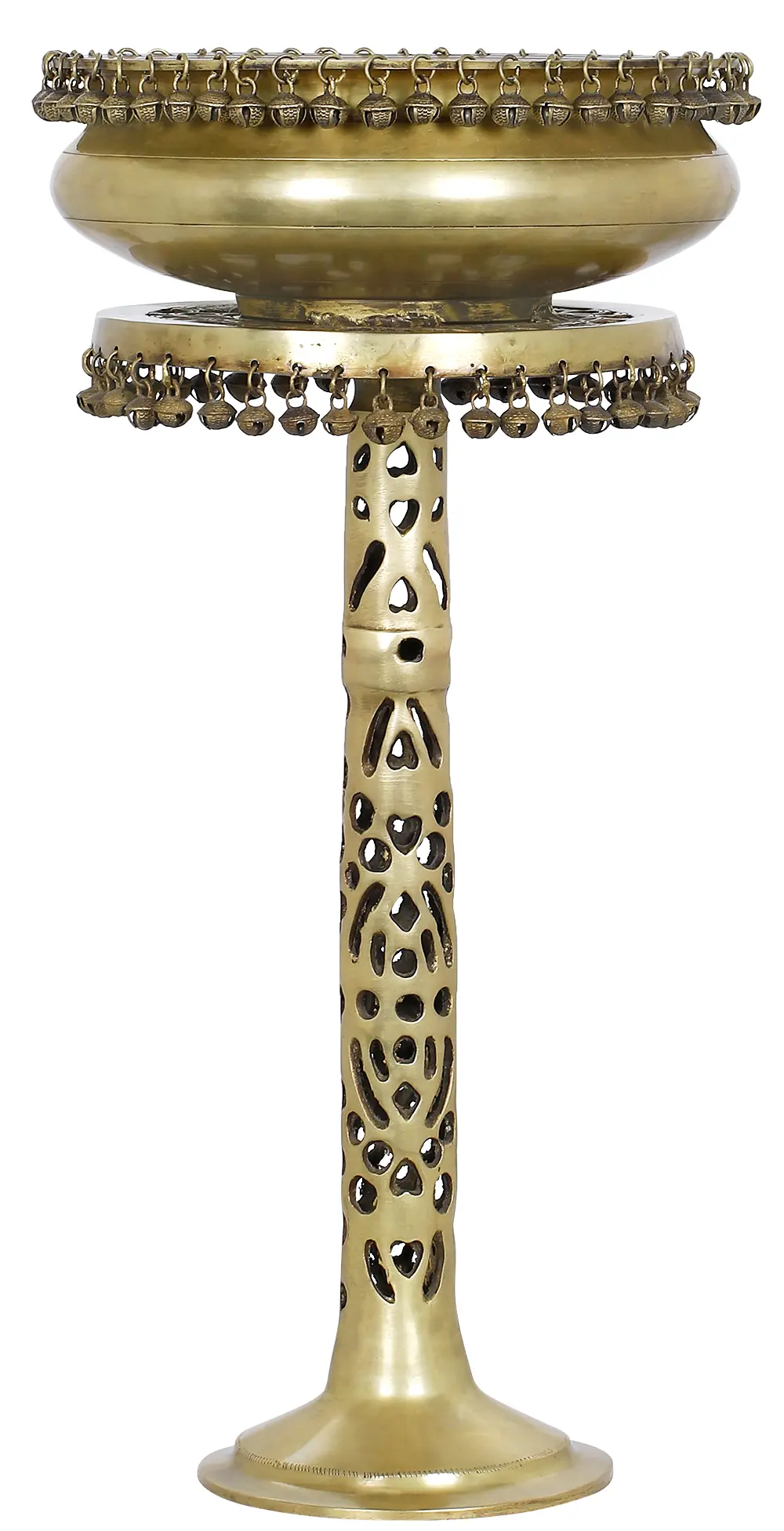 The most distinctive and an add-on feature to this sculpture is the long stand on which the urli is placed. The thick platform is carved in floral latticework and the edges are decorated with similar kind of dangling ghunghroos in a circular motion; the long and slender stick is carved in random yet defined cuts all over and rests on a small circular base. Any person can’t resist himself from buying it, after having a single visual to this enticing statue and its alluring carvings.