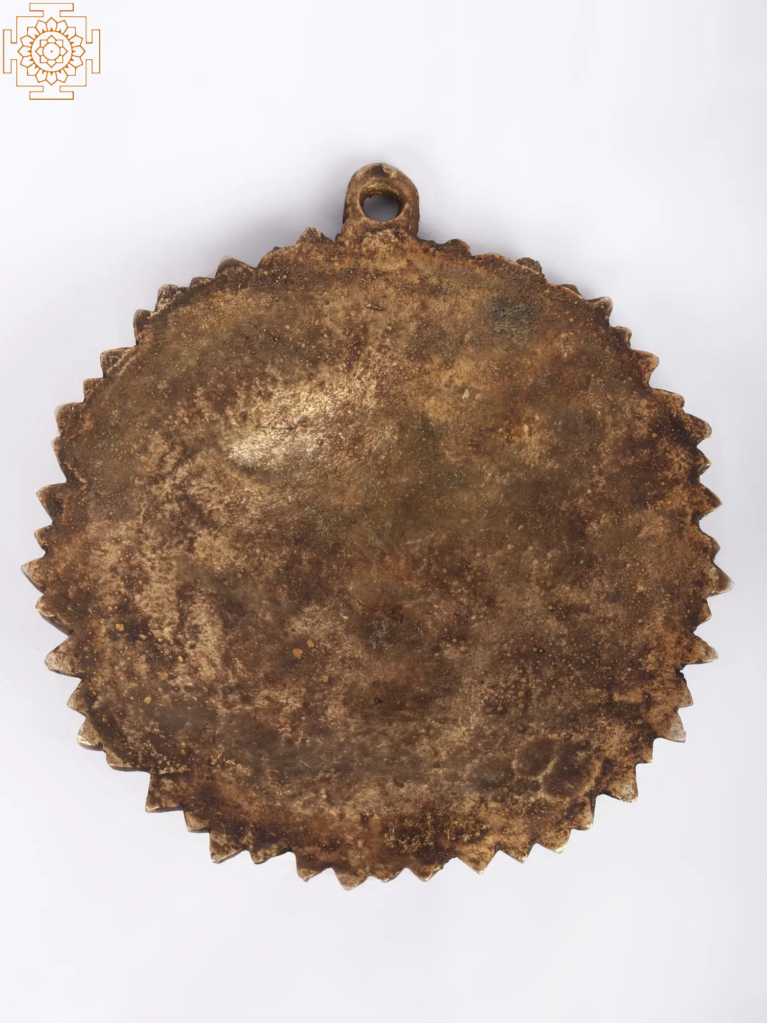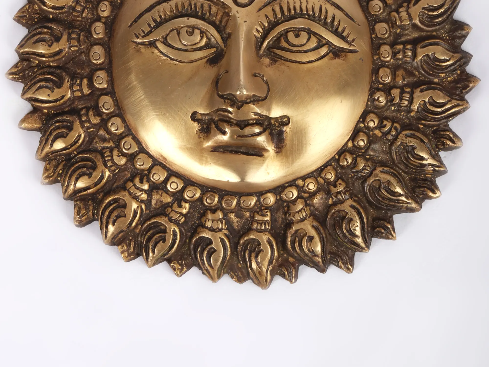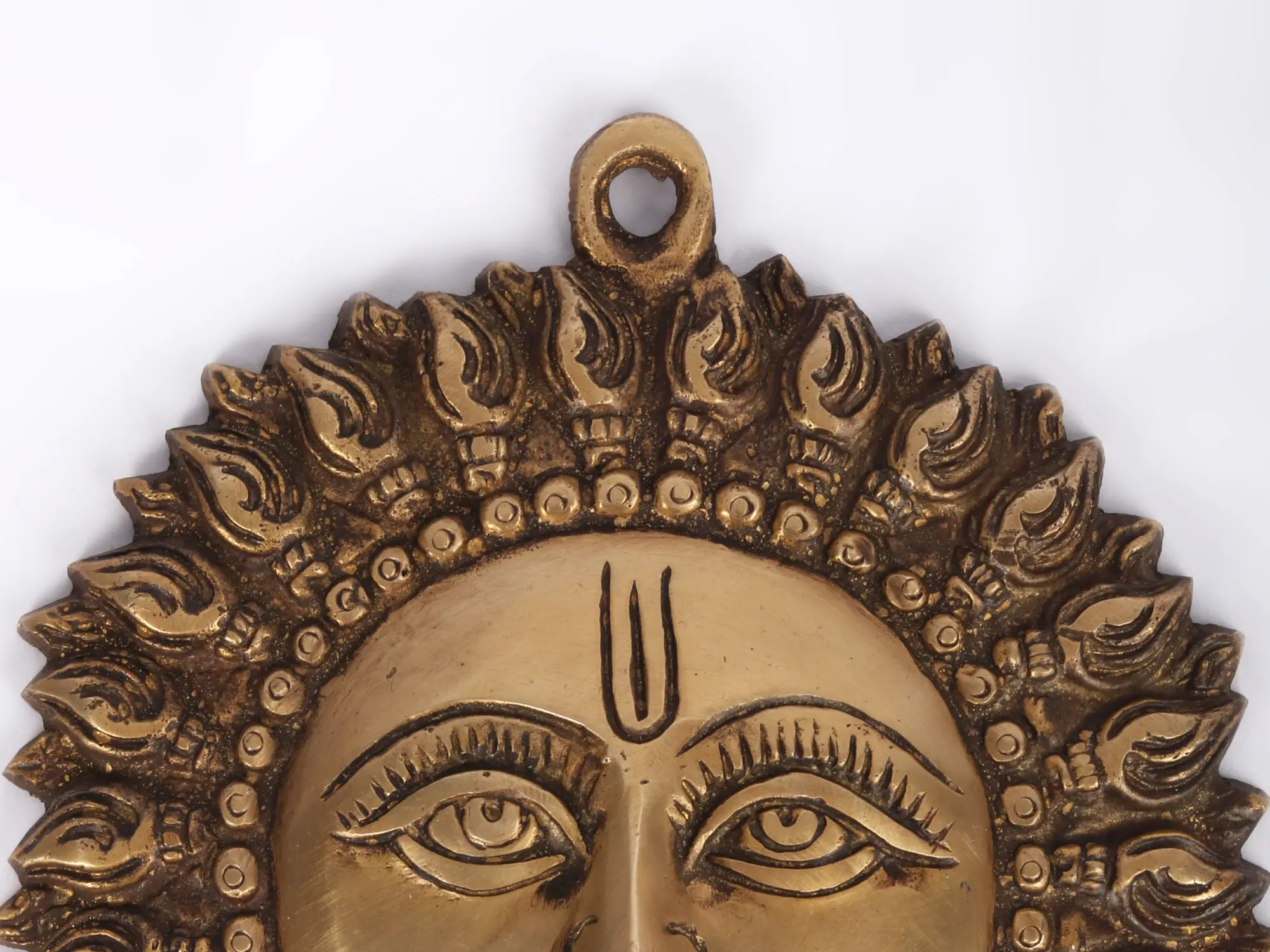 The glowing, heavily engraved aura around the face of the Sun God appears as if flames of fire are emanating from his handsome chubby face. With full cheeks, a firm chin, big sparkling eyes, deep eyebrows, a sharp nose, lovely lips, and sinduri Ram-Tilak on the forehead, he looks very attractive, he looks so awesome. The Sparkling golden brass handmade Vastu wall hanging of Surya Bhagwan is captivating. A suitable hollow opening has also been attached for hanging this unique showpiece on the walls of your dwelling to attract good fortunes and sound health.