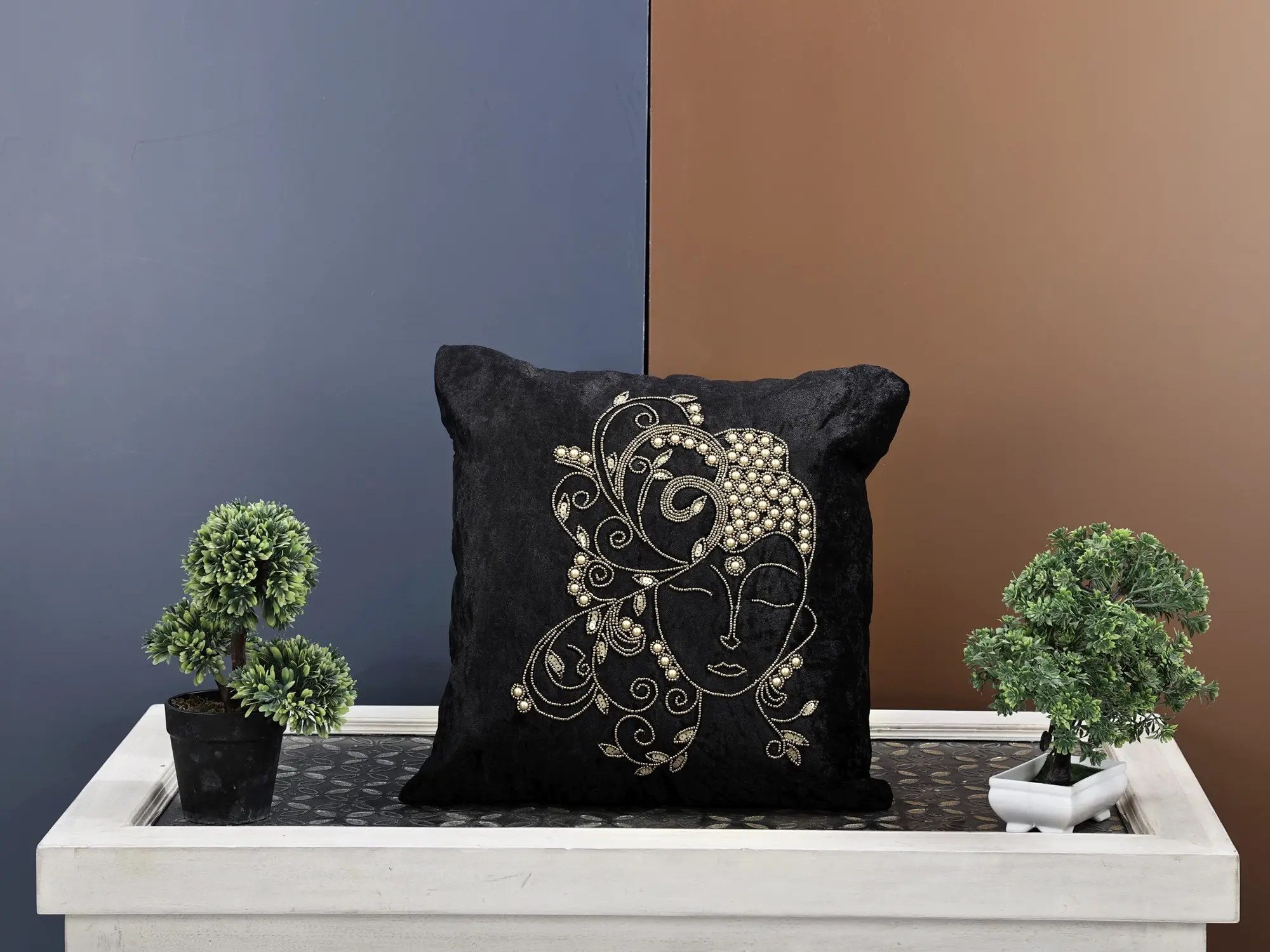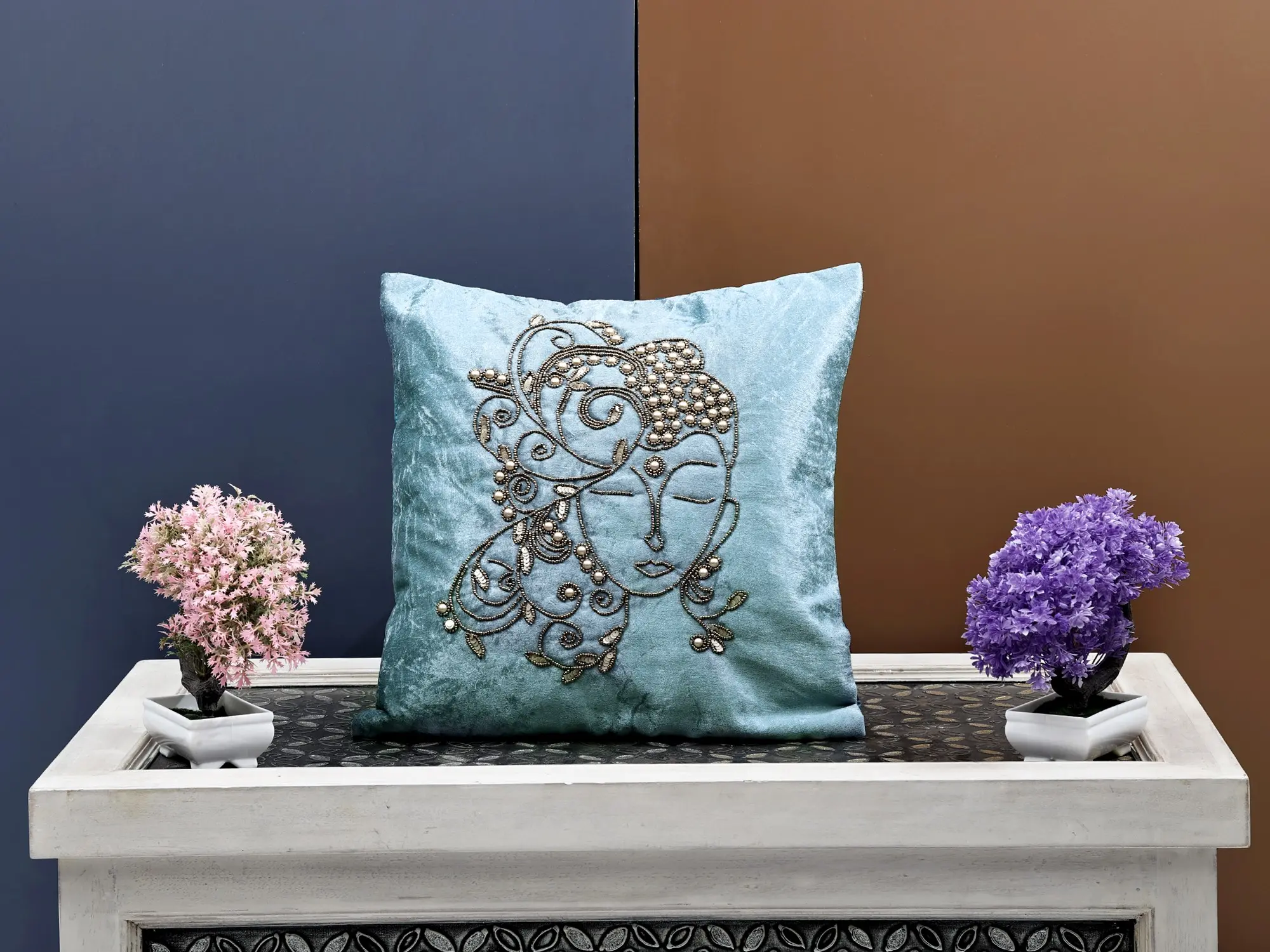 Immerse yourself in the tranquillity of our Velvet Hand Embroidered Buddha Cushion Cover, adorned with exquisite beadwork. This piece transcends mere decor, embodying a sense of peace and serenity inspired by Buddha's teachings. The velvet fabric, coupled with intricate hand embroidery and bead detailing, creates a tactile and visual masterpiece. Elevate your living space with this cushion cover that not only adds artistic flair but also serves as a reminder of mindfulness and enlightenment.