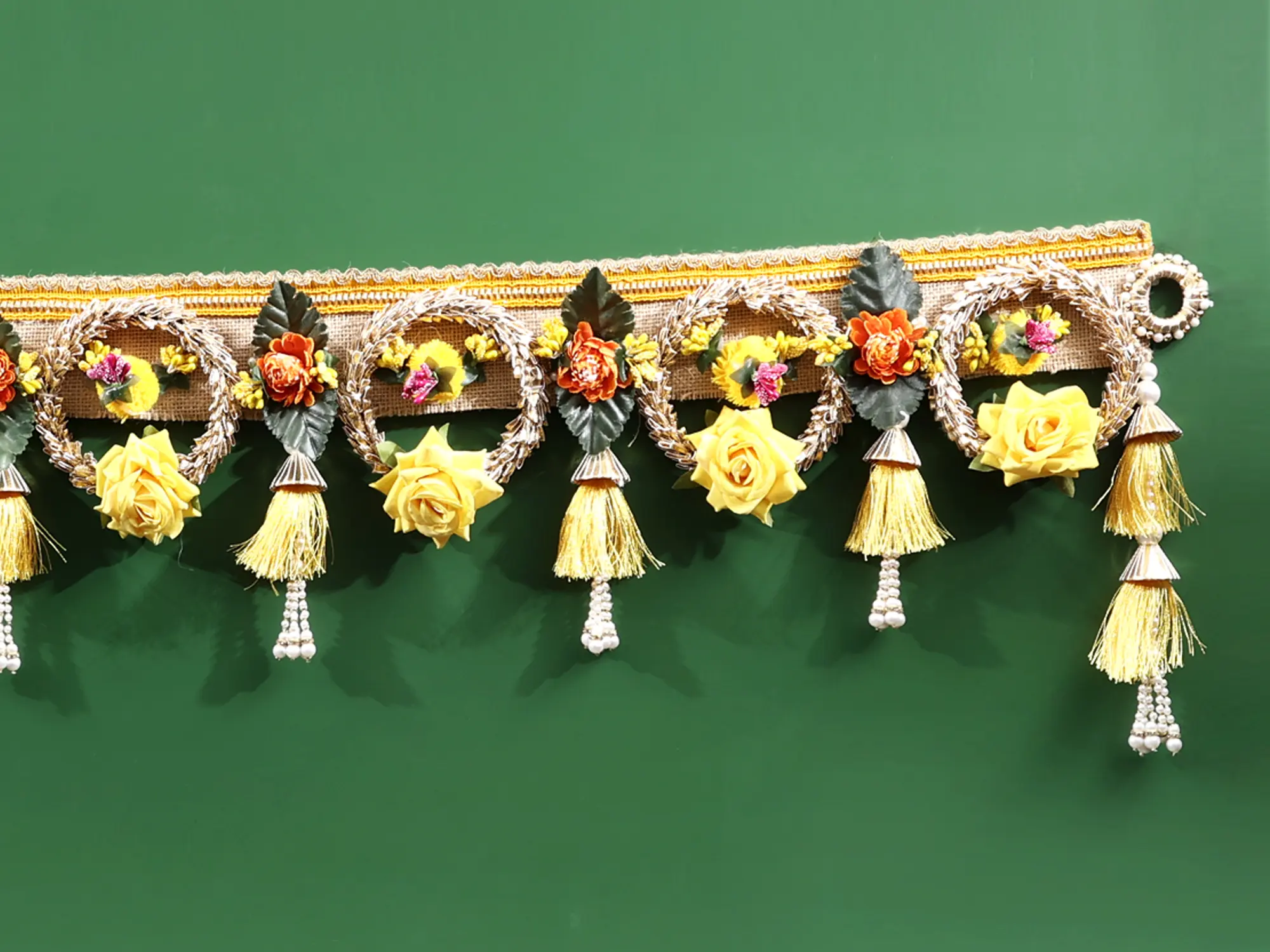 This Vibrant rose flower toran with tassels and beads, is known to enhance the look of the front of any house. This toran is a remarkable blend of beauty and charm that was painstakingly handcrafted using jute. The cheery beauty of the bright yellow rose blooms welcomes guests with an air of enthusiasm and optimism. The elaborately crafted tassels and beads give this door decor a sense of glitz and elegance. This toran is a wonderful ornamental item that also serves as a metaphor for friendliness and welcome. This stunning piece of art will enliven your home with its lively vitality and unmistakable beauty.