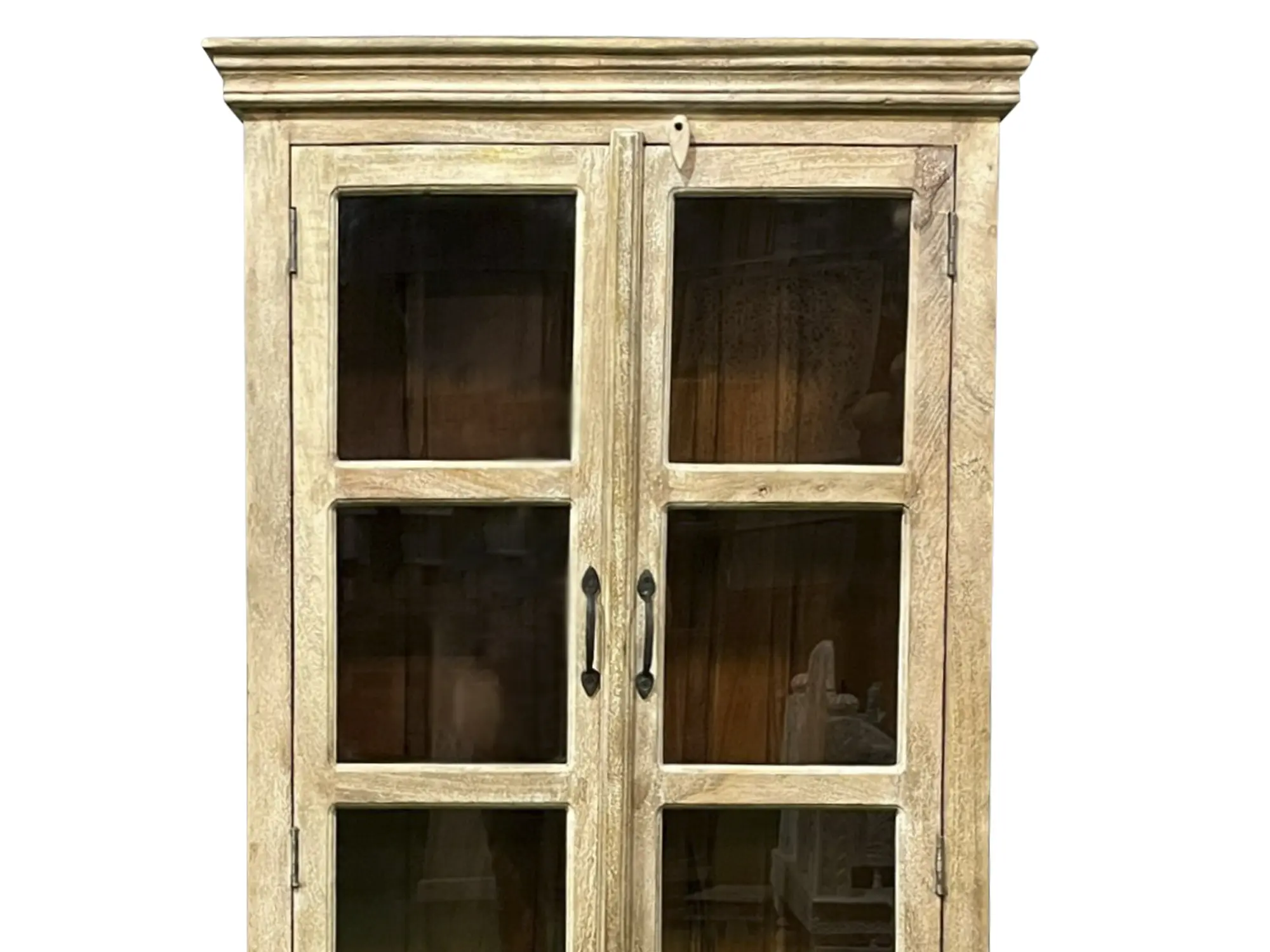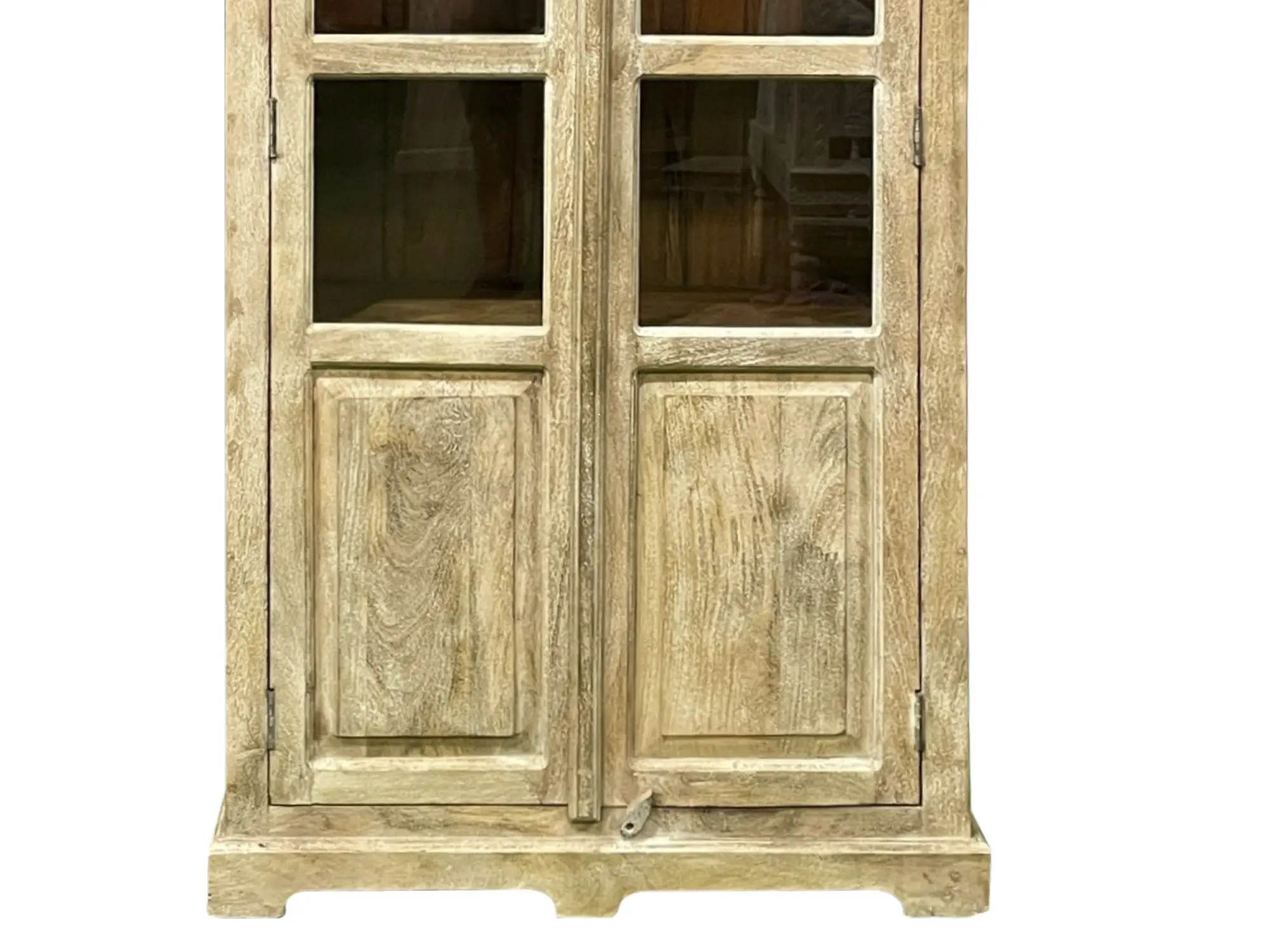 The cabinet boasts a classic silhouette that is enhanced by the natural grains and subtle imperfections of the mango wood. The wood's finish imparts a soft, aged look, adding to the overall vintage aesthetic. Glass-paneled doors provide a clear view of the contents, making it perfect for showcasing your favorite items while keeping them protected from dust. The dark, understated door handles complement the cabinet's vintage feel without being overpowering. Its raised base adds stability and a touch of sophistication, elevating the design while providing the foundation for years of reliable service.