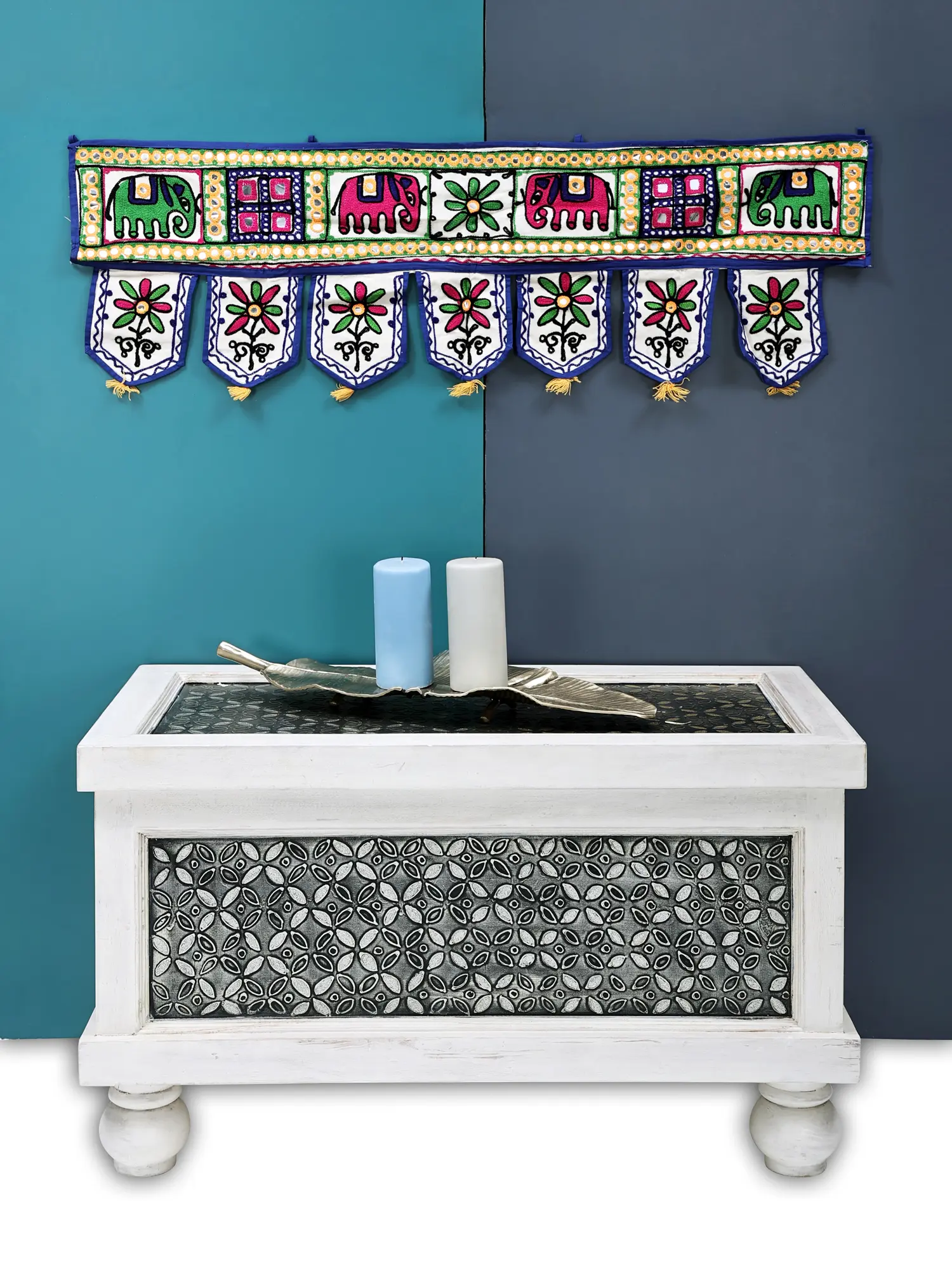 The design is a testament to meticulous craftsmanship. The main panel features a series of intricately embroidered motifs, drawing inspiration from rich cultural heritage. Playful elephants, rendered in lively shades of green and pink, stand out against the white backdrop, each detailed with subtle touches of yellow and orange. These majestic creatures are interspersed with decorative square panels, each outlined with a border of small, shimmering mirrors and colorful embroidery. The mirrors catch the light, adding a subtle sparkle and enhancing the overall opulence of the piece. The top edge is finished with a vibrant blue border, which also acts as a sturdy casing for the hanging loops, ensuring easy placement. Below the main panel, a cascade of seven pennant-shaped drops adds further visual interest. Each drop is adorned with a beautifully embroidered flower, featuring bold pink and green petals surrounding a central yellow and black accent. These floral designs are detailed with delicate black swirling patterns, reminiscent of traditional Indian folk art. Subtle yellow tassels grace the bottom of each flower motif, providing a final touch of rustic elegance and movement. The entire piece is bordered by a contrasting blue trim, unifying the design and adding a crisp finish.