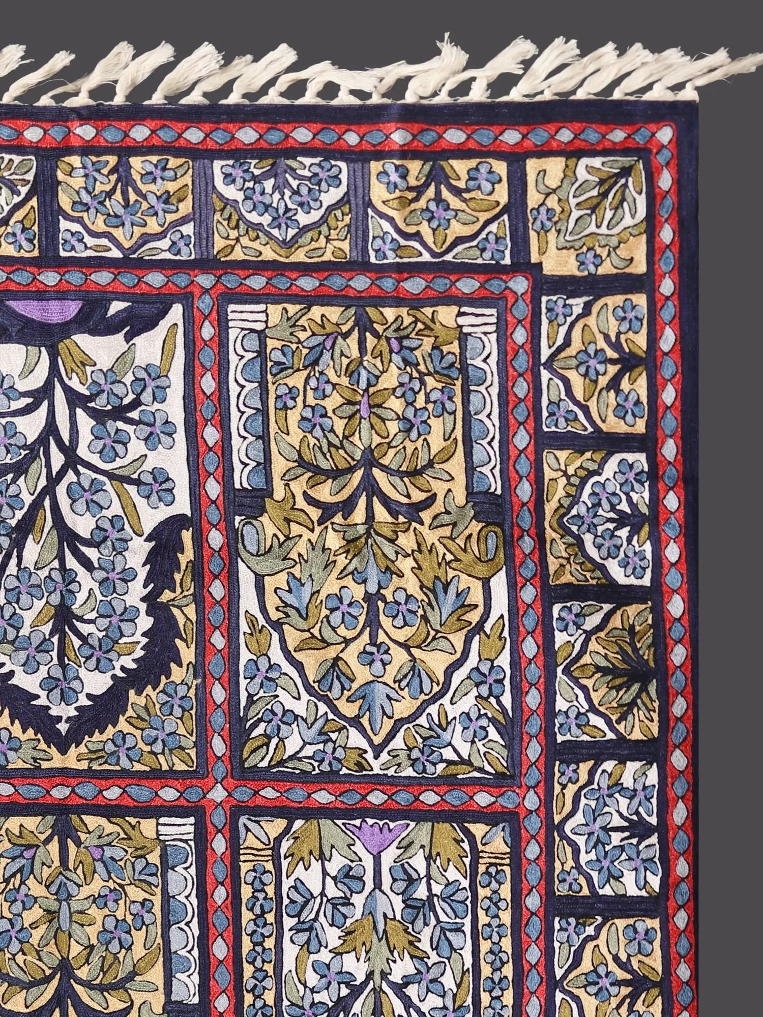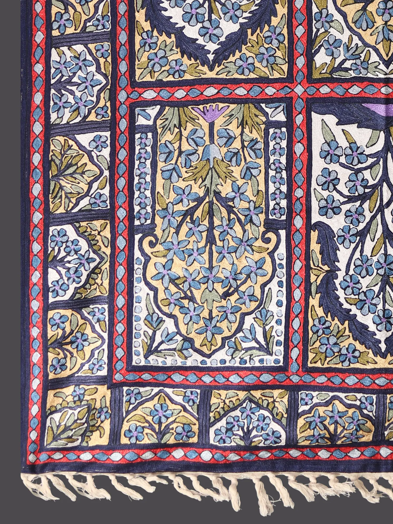This White & Blue Mughal Motifs Chainstitch Asana Carpet from Kashmir, adorned with tassels, epitomizes the timeless artistry of Kashmiri carpet making. Celebrating the region's rich heritage, this piece showcases Mughal motifs and intricate chain stitch craftsmanship. The design, reminiscent of Persian tiles found in mosques, features trees resembling those in the heavenly landscapes.