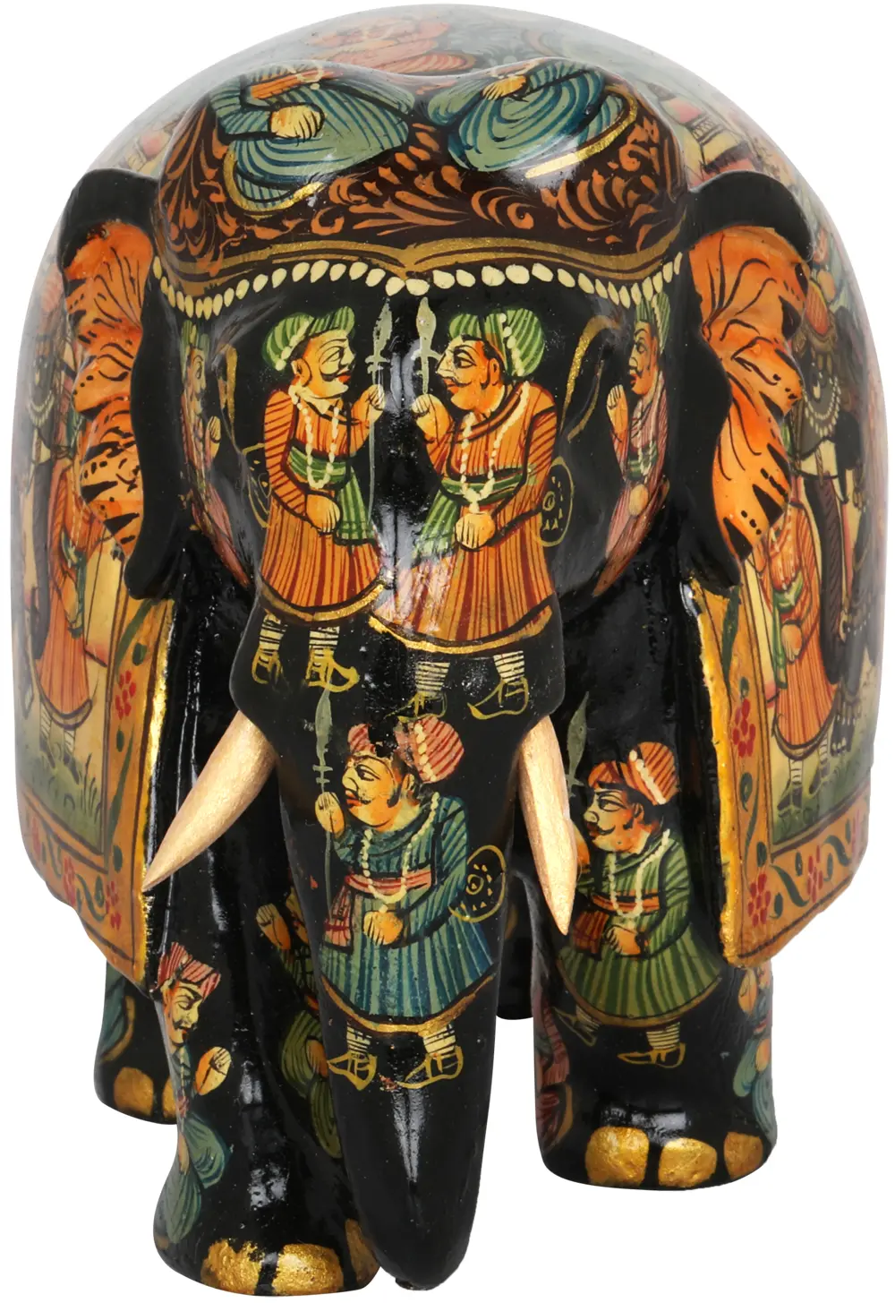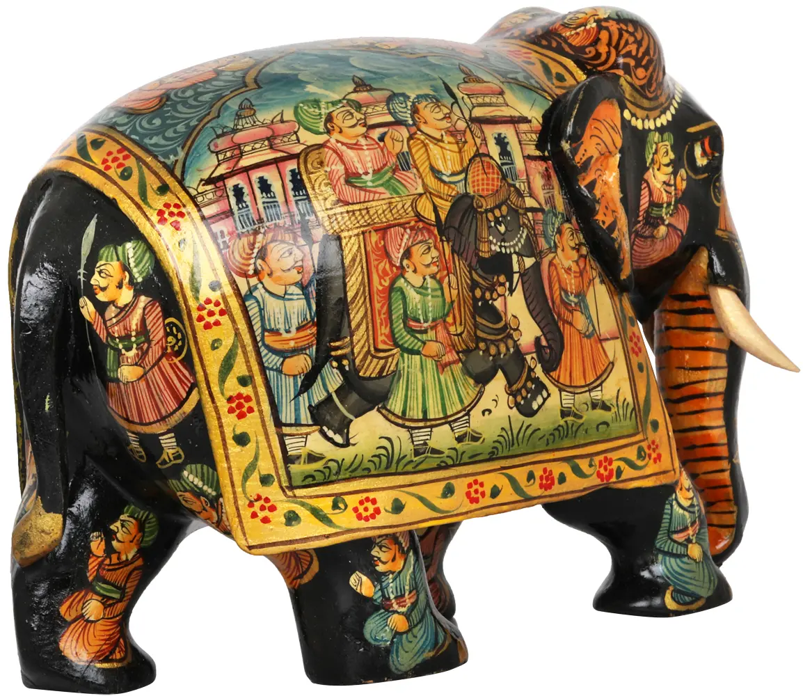 What truly sets this piece apart is the intricate miniature painting that adorns its surface. The vibrant colors and meticulously detailed scenes depict a royal procession, capturing the essence of regal grandeur and historical storytelling. Every brushstroke reflects the dedication of the artisan, creating a rich tapestry of patterns and images that evoke a sense of wonder. The attention to detail is astounding, from the ornate embellishments on the elephant's head to the expressions on the figures depicted in the royal journey scene.