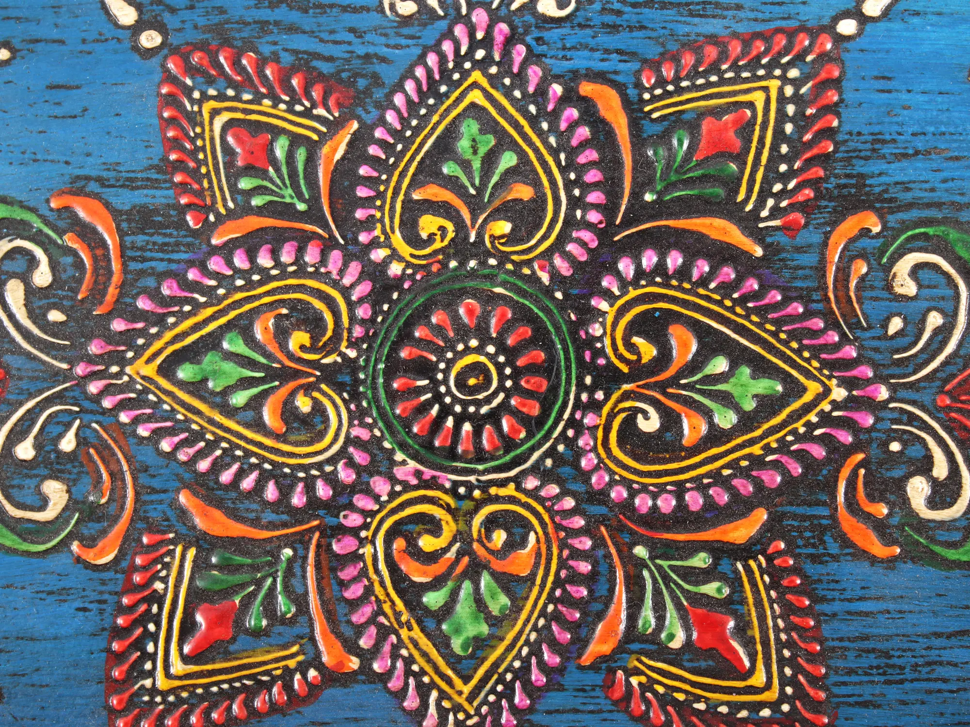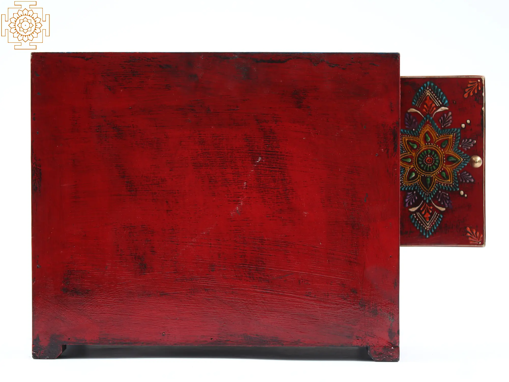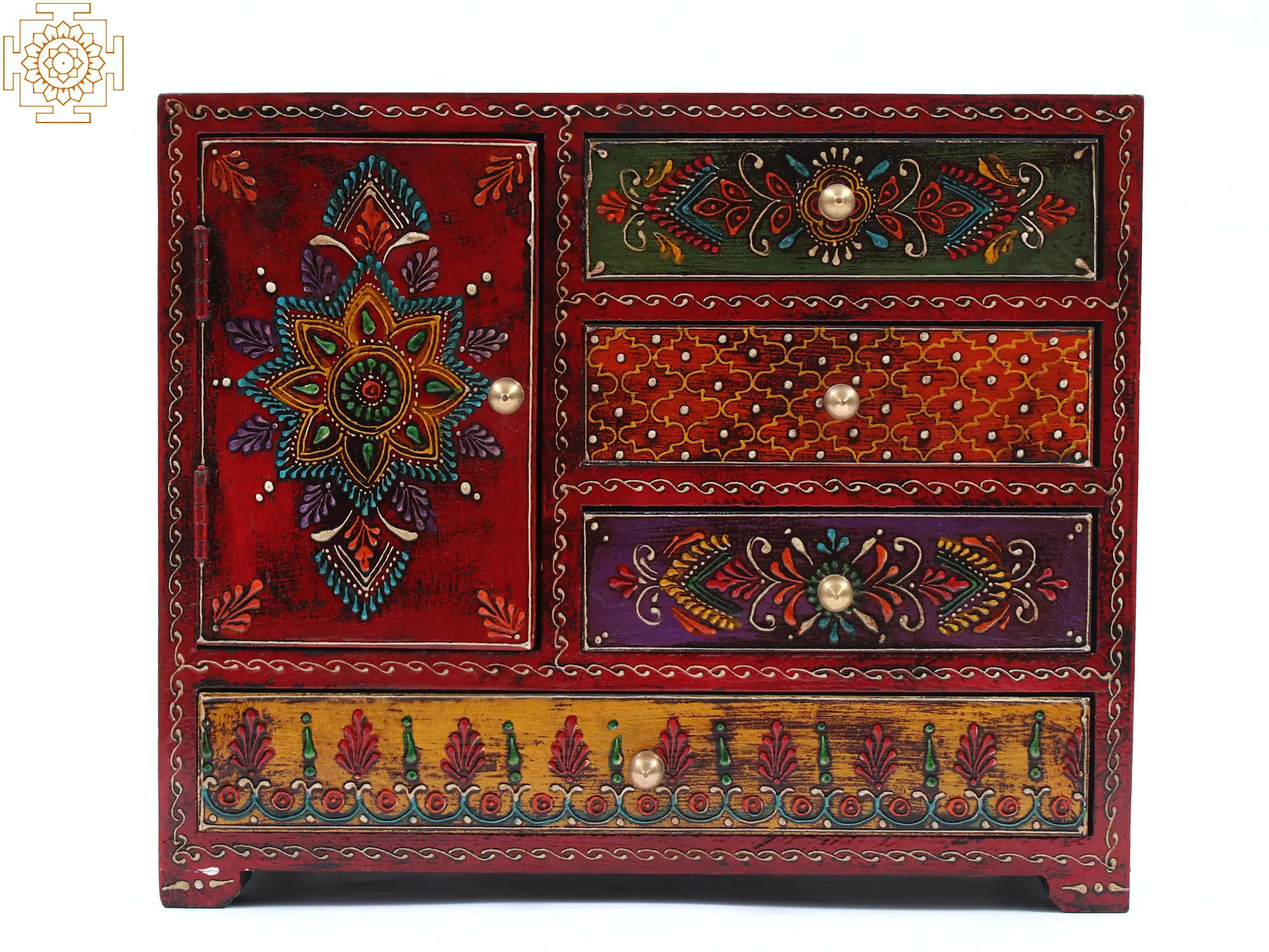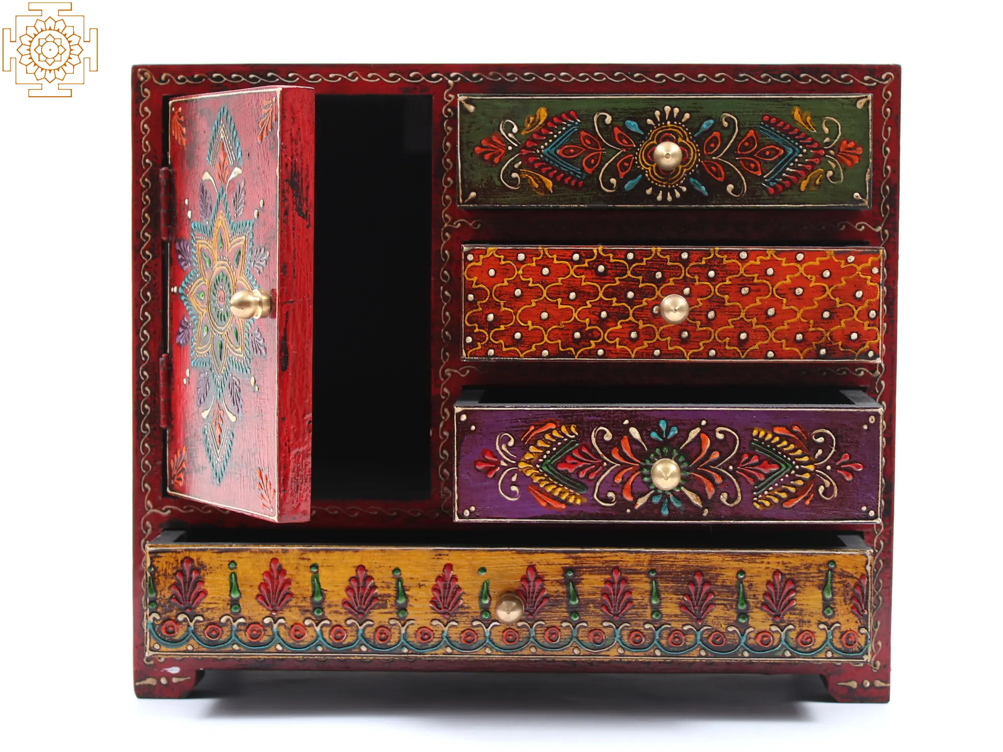 This square-shaped Wooden Small Chest Drawer is a miniature work of art. It has three beautifully painted drawers and one door cabinet. This drawer's design is small and features a vibrant blend of floral motifs. The colours utilised for the background and graphics are all bright, instilling a sense of joy in the viewer. This drawer functions as both an art piece and a functional piece. It can be utilised as a jewellery area as well as a part of house decor.