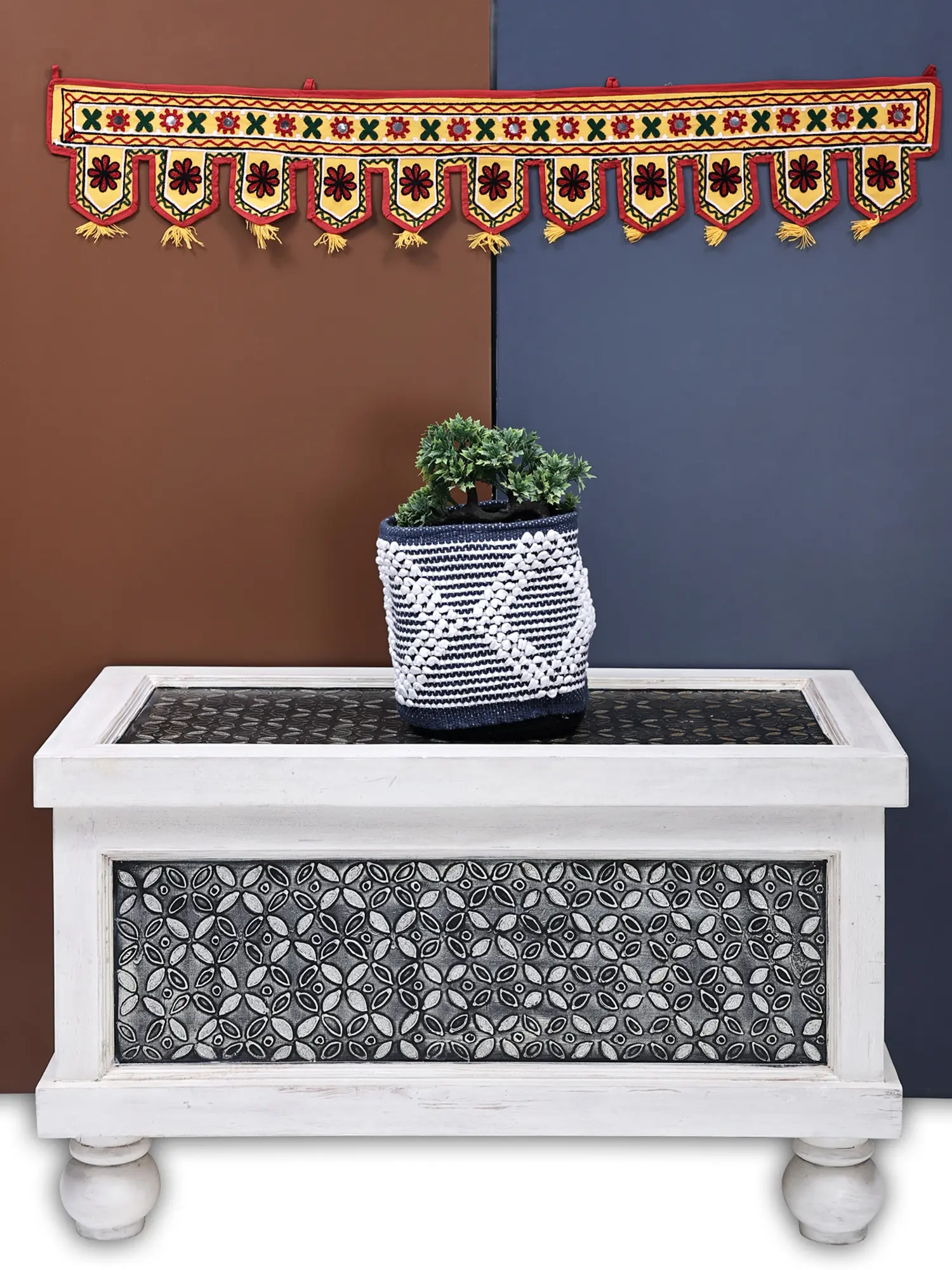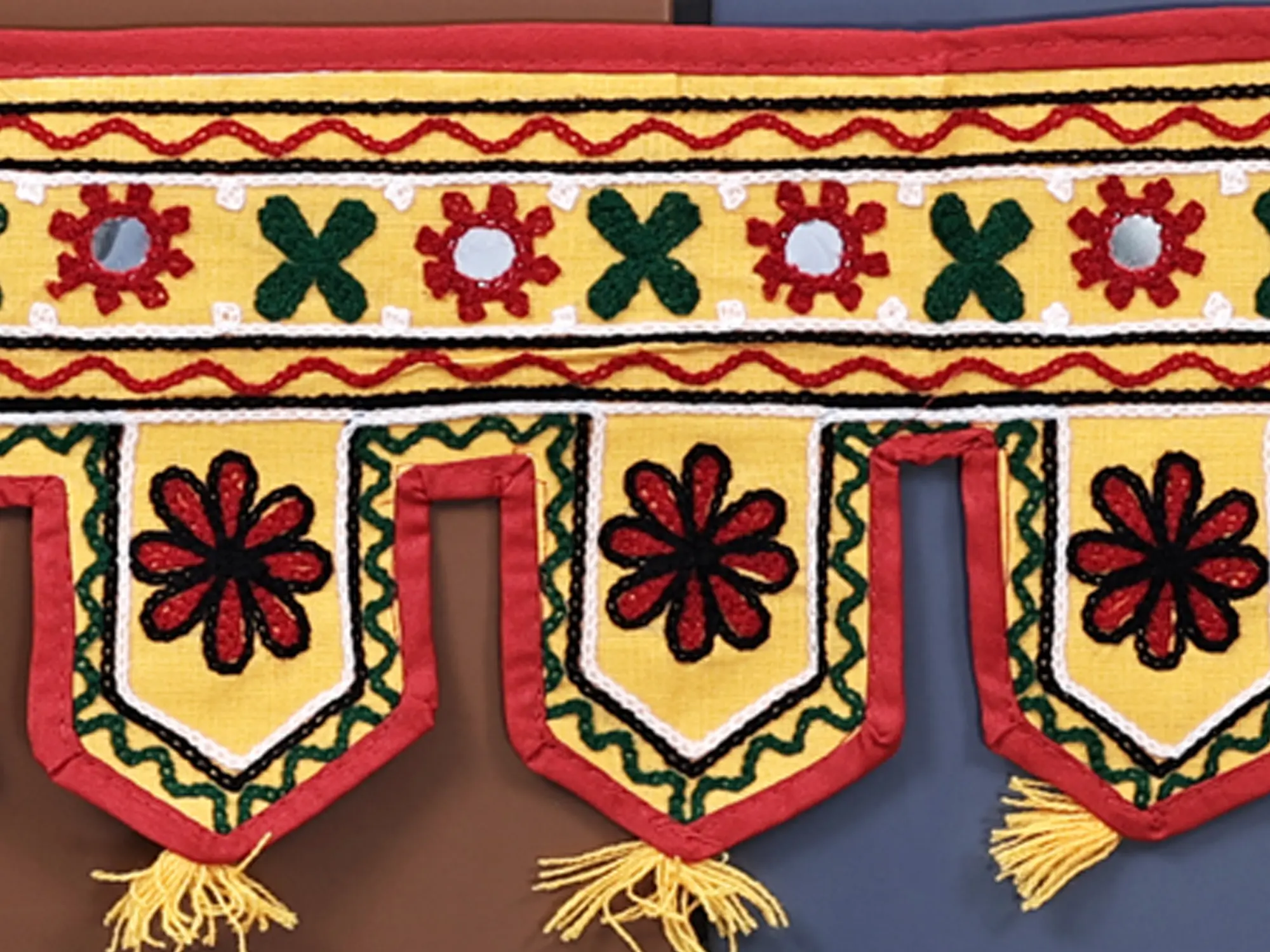 Whether your home décor leans towards minimalist, bohemian, or traditional styles, this toran will effortlessly complement your existing aesthetic. Its timeless design ensures it remains a beautiful addition to your home throughout the year, transcending seasonal trends. Hang it above your front door to greet guests with warmth and style, or use it to adorn an interior doorway to add a touch of charm to any room. The neutral yellow base and bold embroidered accents make it easy to incorporate into various color palettes.