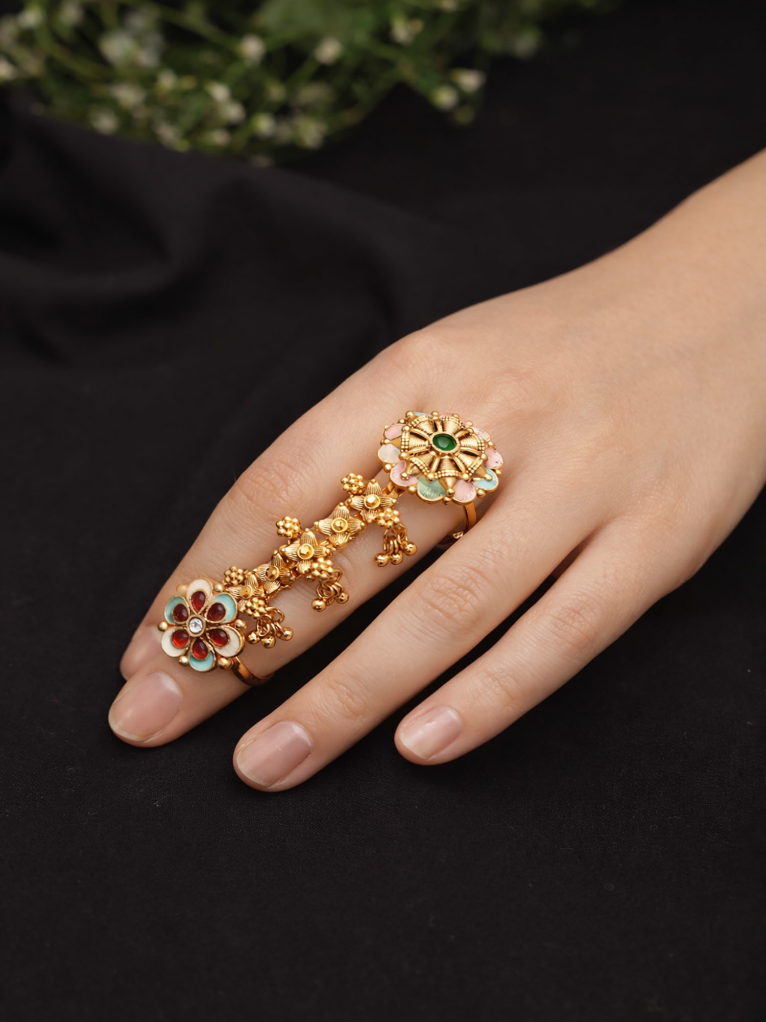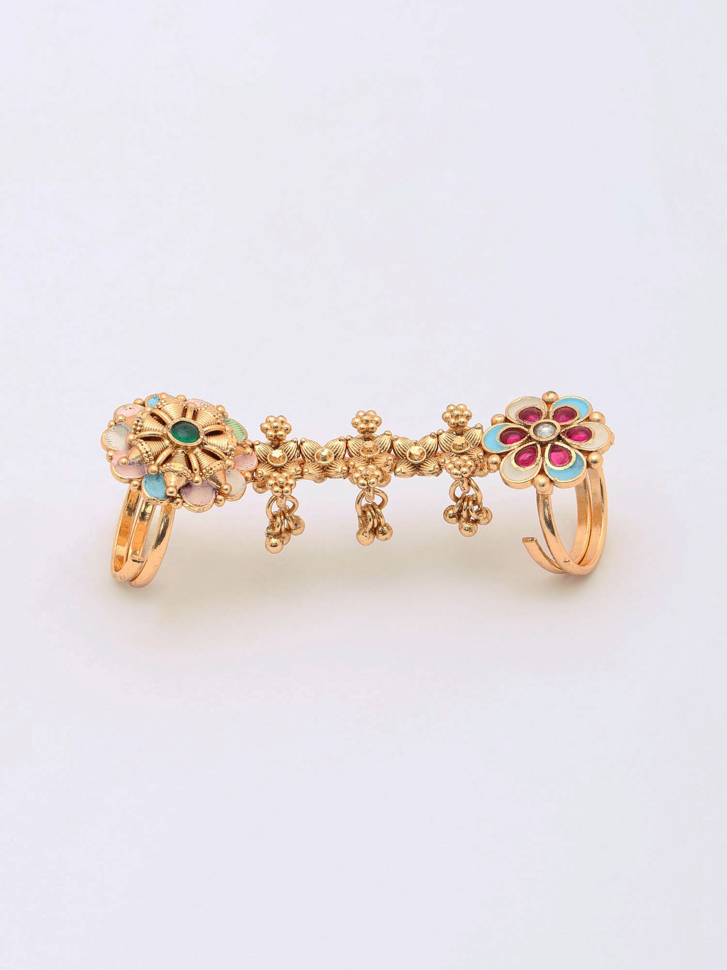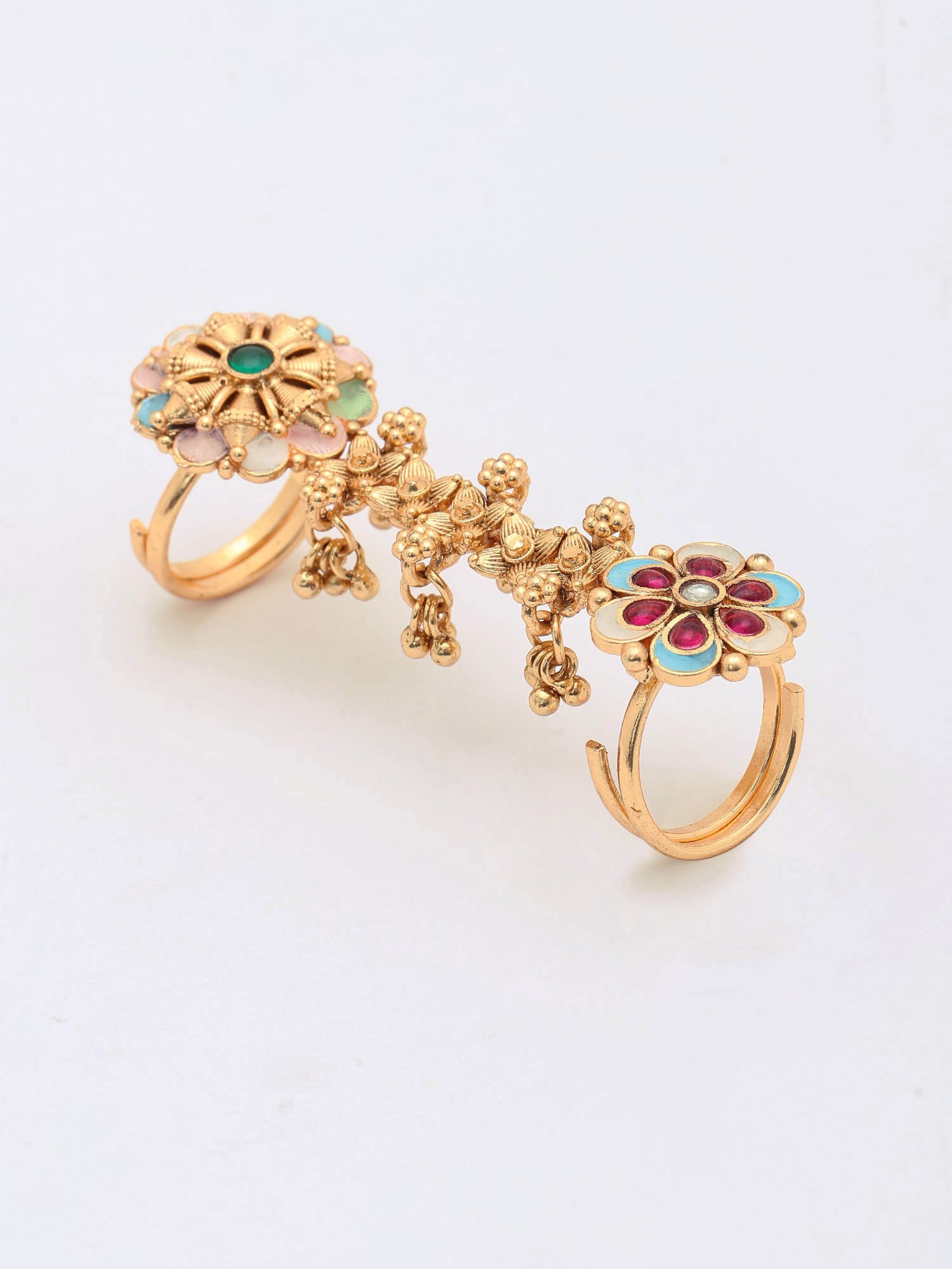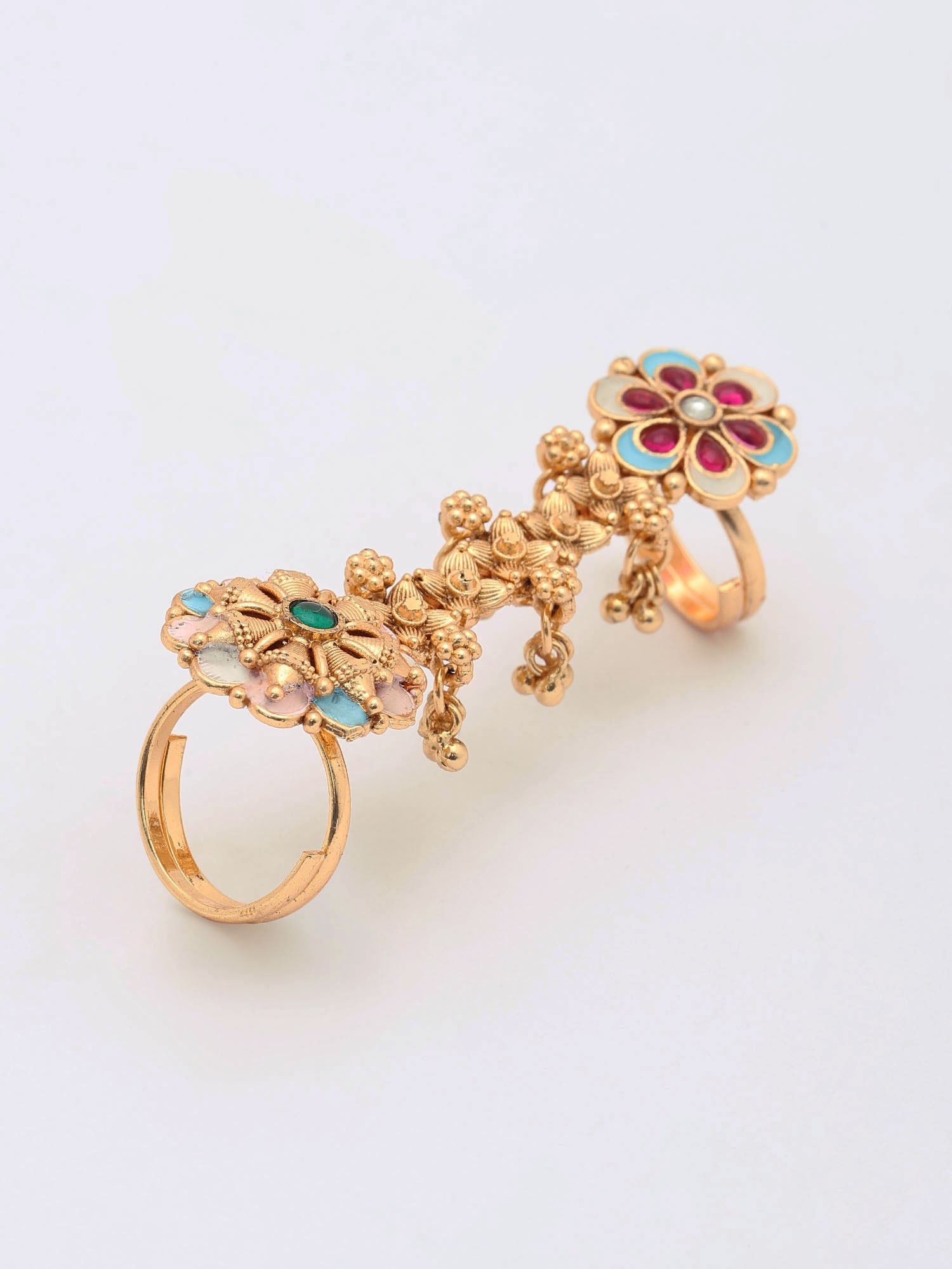Floral Design Meenakari Adjustable Long Finger Ring (Double Ring)