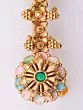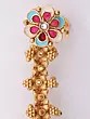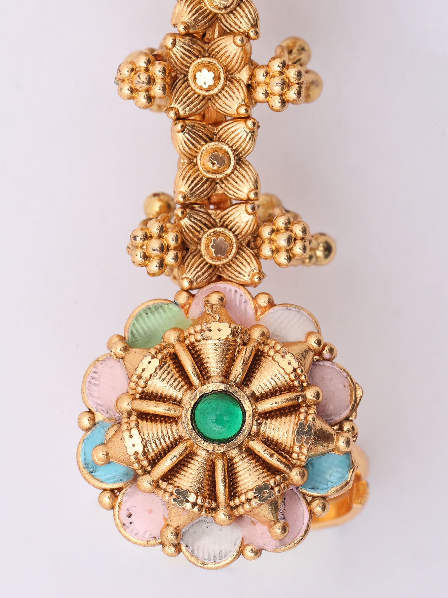 Forged from the finest brass, each element of this creation speaks of meticulous attention to detail and enduring quality. Skilled artisans have painstakingly shaped and polished the metal, imbuing it with a warm, lustrous glow. The intricate floral motifs and delicate bead drops are a testament to traditional techniques, reflecting a dedication to the art of fine jewelry making.