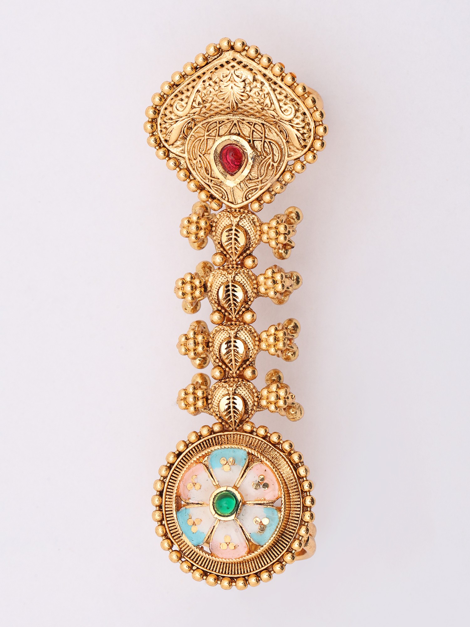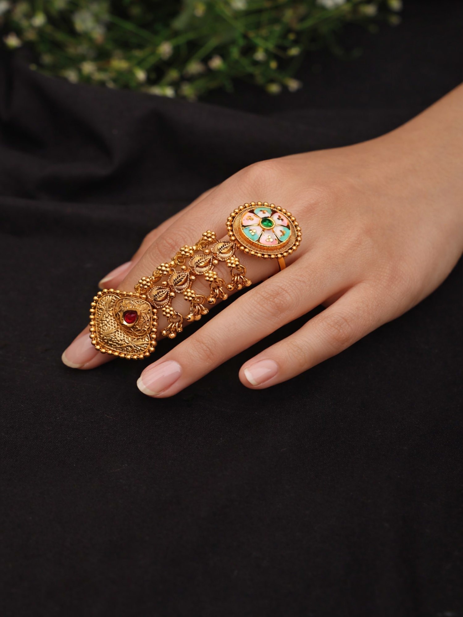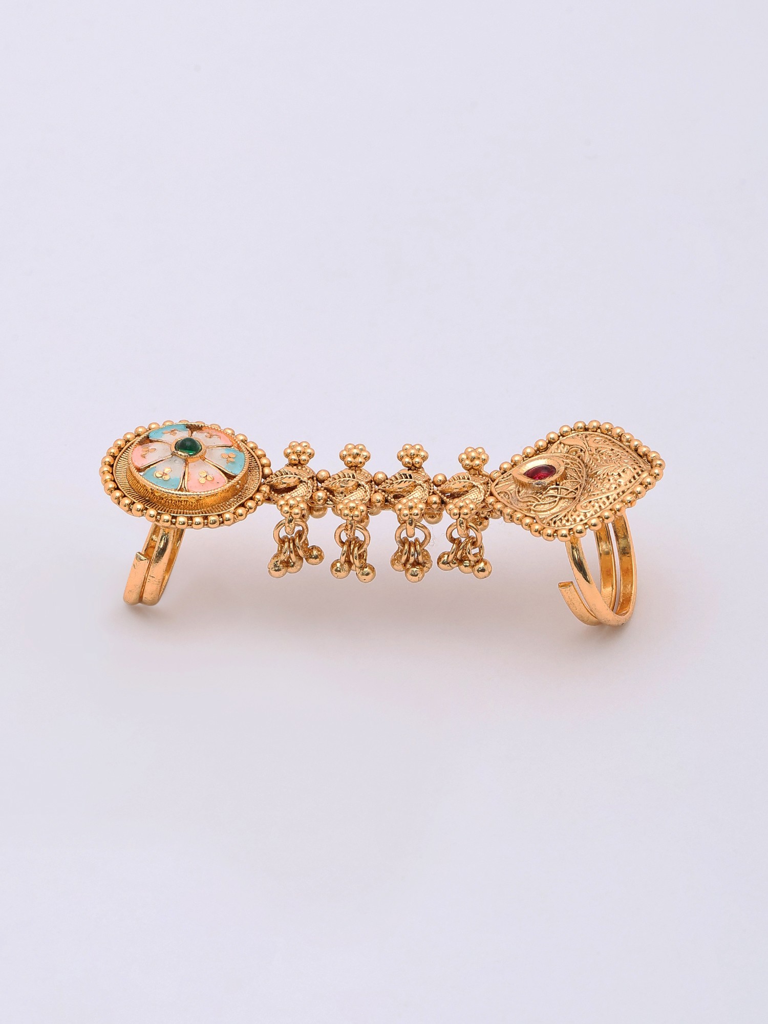 This style of multi-finger ring often draws inspiration from traditional Indian jewelry, where elaborate designs symbolize prosperity and auspiciousness. The combination of metallicwork and colorful enamel evokes a rich cultural tapestry, connecting you to centuries of artisanal heritage and a celebration of feminine adornment. You will feel a sense of timeless elegance when wearing this piece.