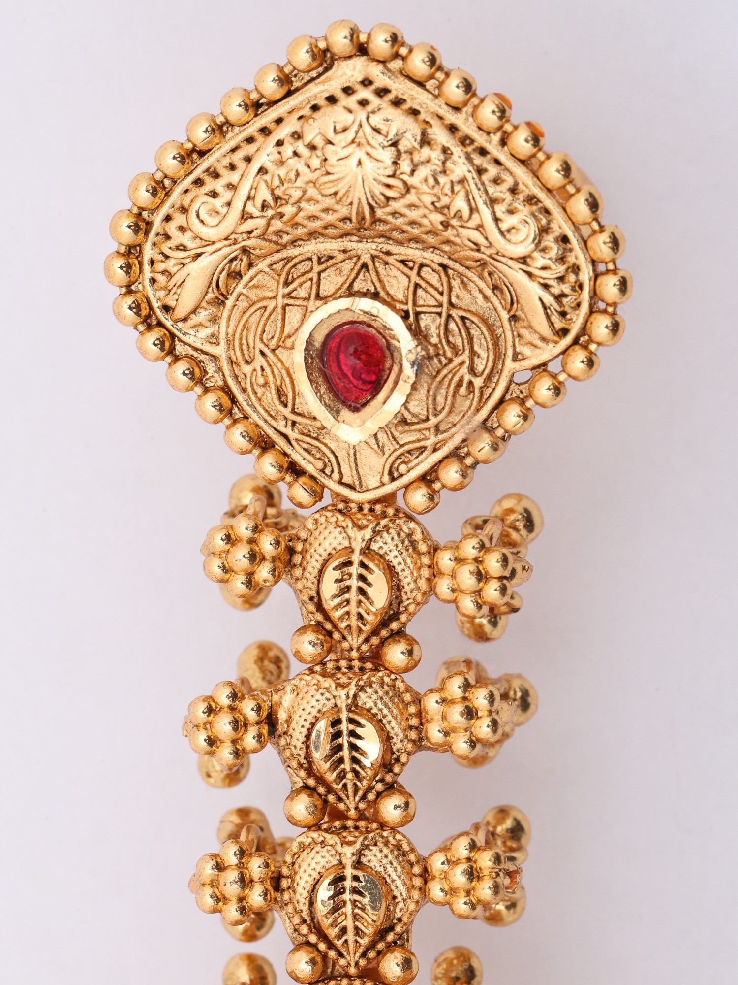 Intricate leaf motifs and beadwork extend across multiple fingers, creating a dynamic look.