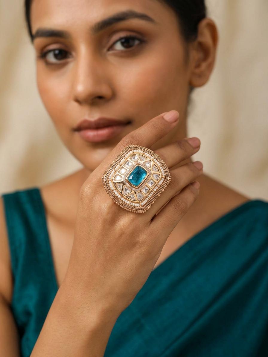 Adjustable Kundan Ring with Honeycomb Design