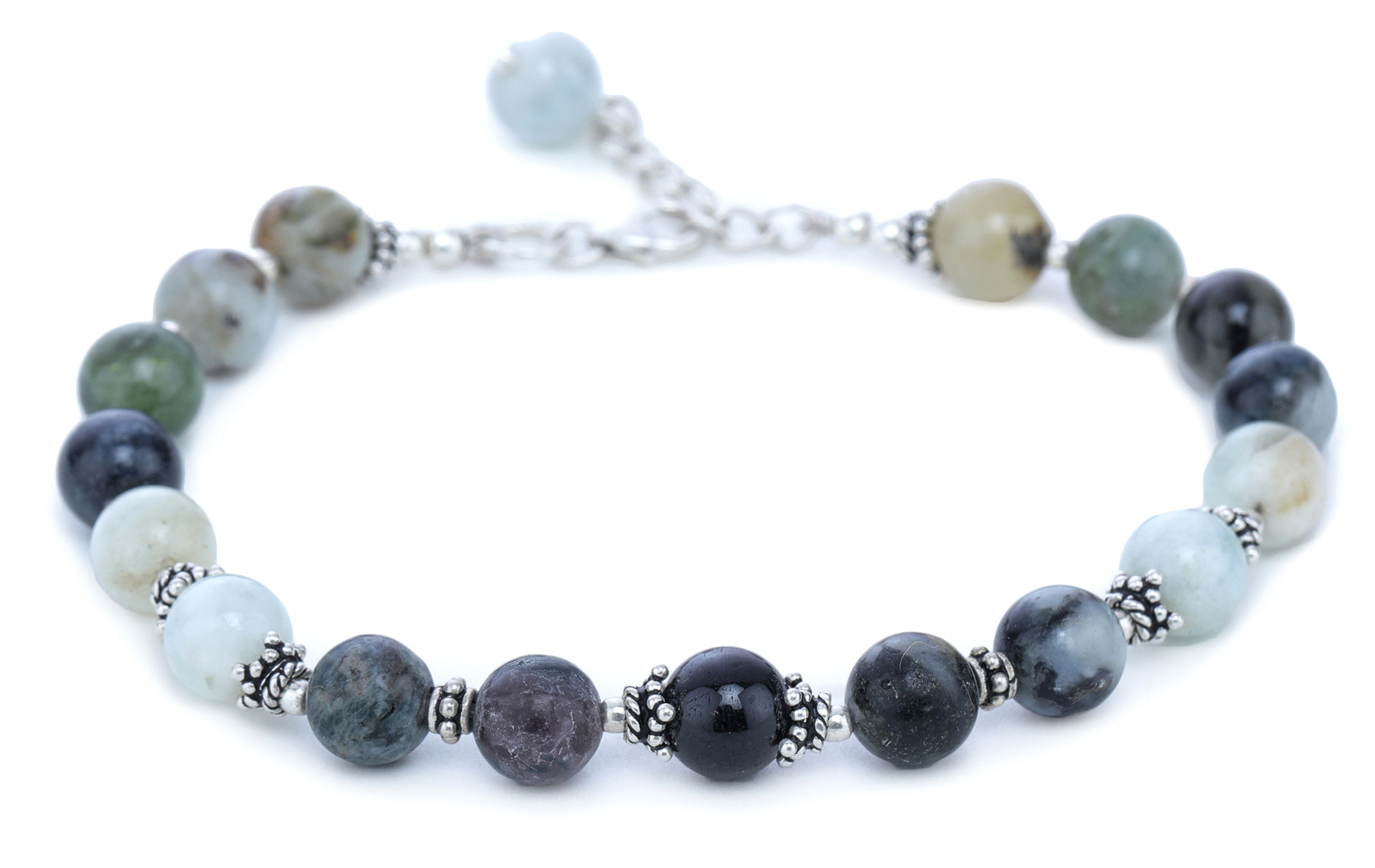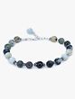 Adorn your wrist with the subtle beauty of nature. This bracelet features a captivating array of carefully selected agate beads, each displaying its own unique pattern and hue. From milky blues to deep greens and blacks, the color palette is reminiscent of a serene landscape, blending seamlessly to create a harmonious and grounding piece. The organic variations within the agate stones make each bracelet a one-of-a-kind treasure.