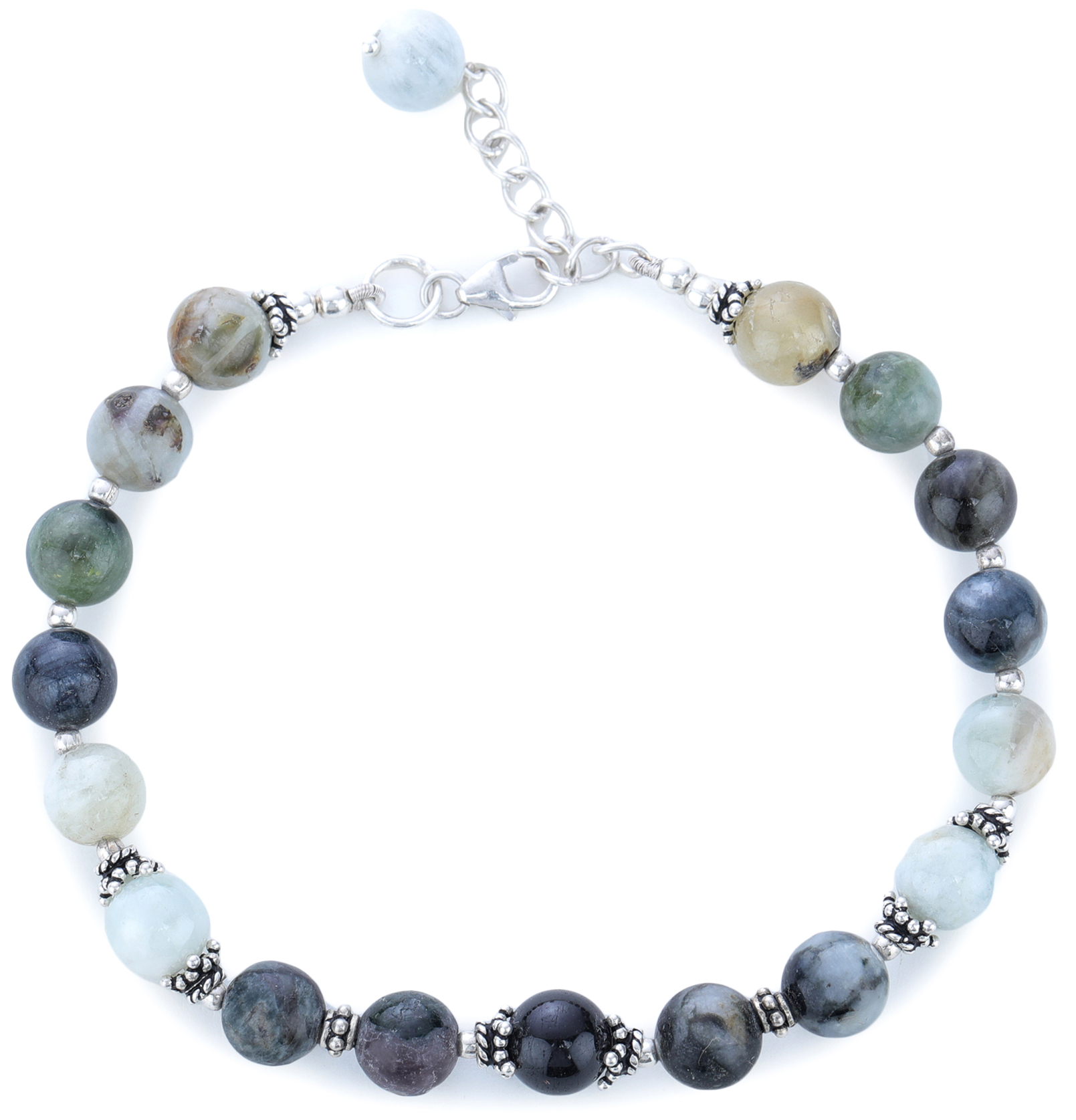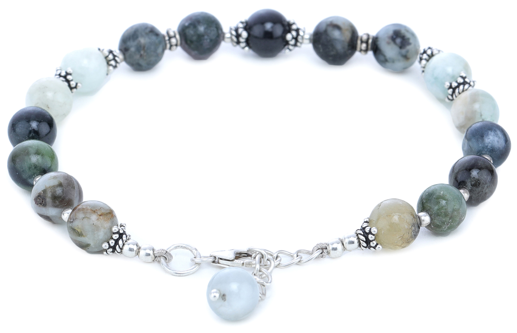 The smooth, rounded agate beads are interspersed with intricate sterling silver accents. These delicate details add a touch of refinement, elevating the natural charm of the stones. The sterling silver connectors not only enhance the overall aesthetic but also provide durability, ensuring that this bracelet will be a cherished addition to your jewelry collection for years to come. The meticulous attention to detail is evident in every aspect of the design, from the selection of the stones to the secure and elegant clasp.