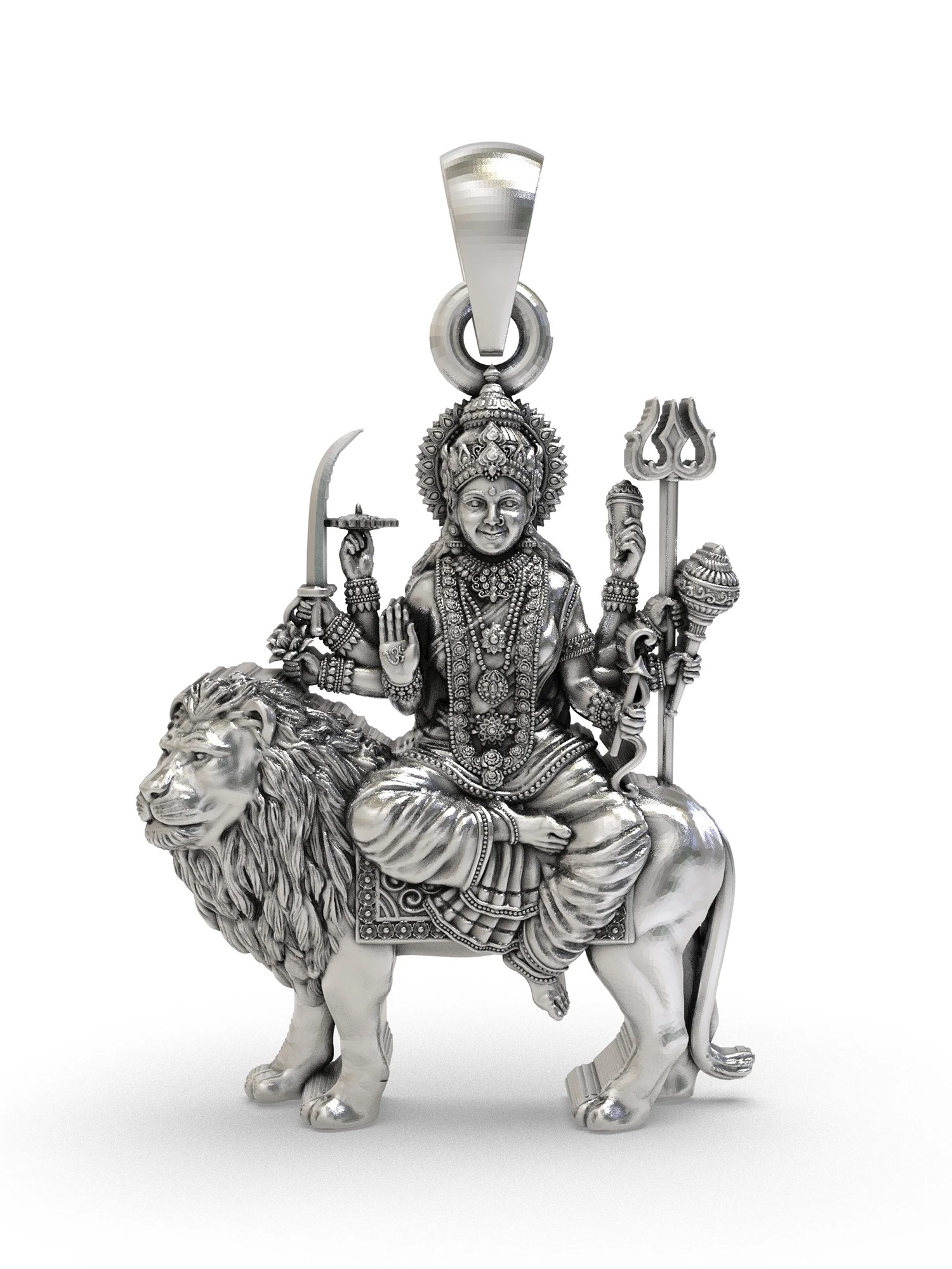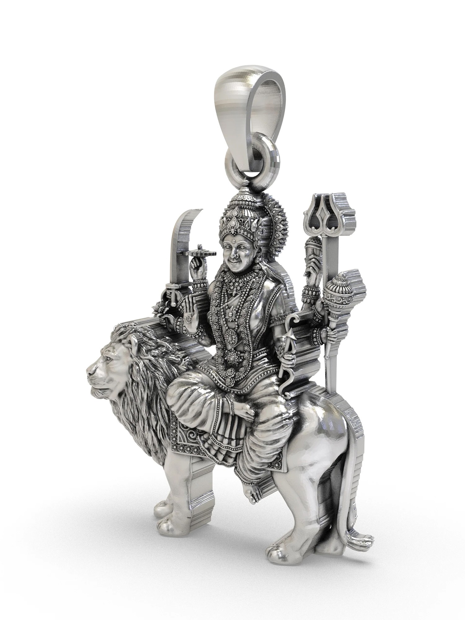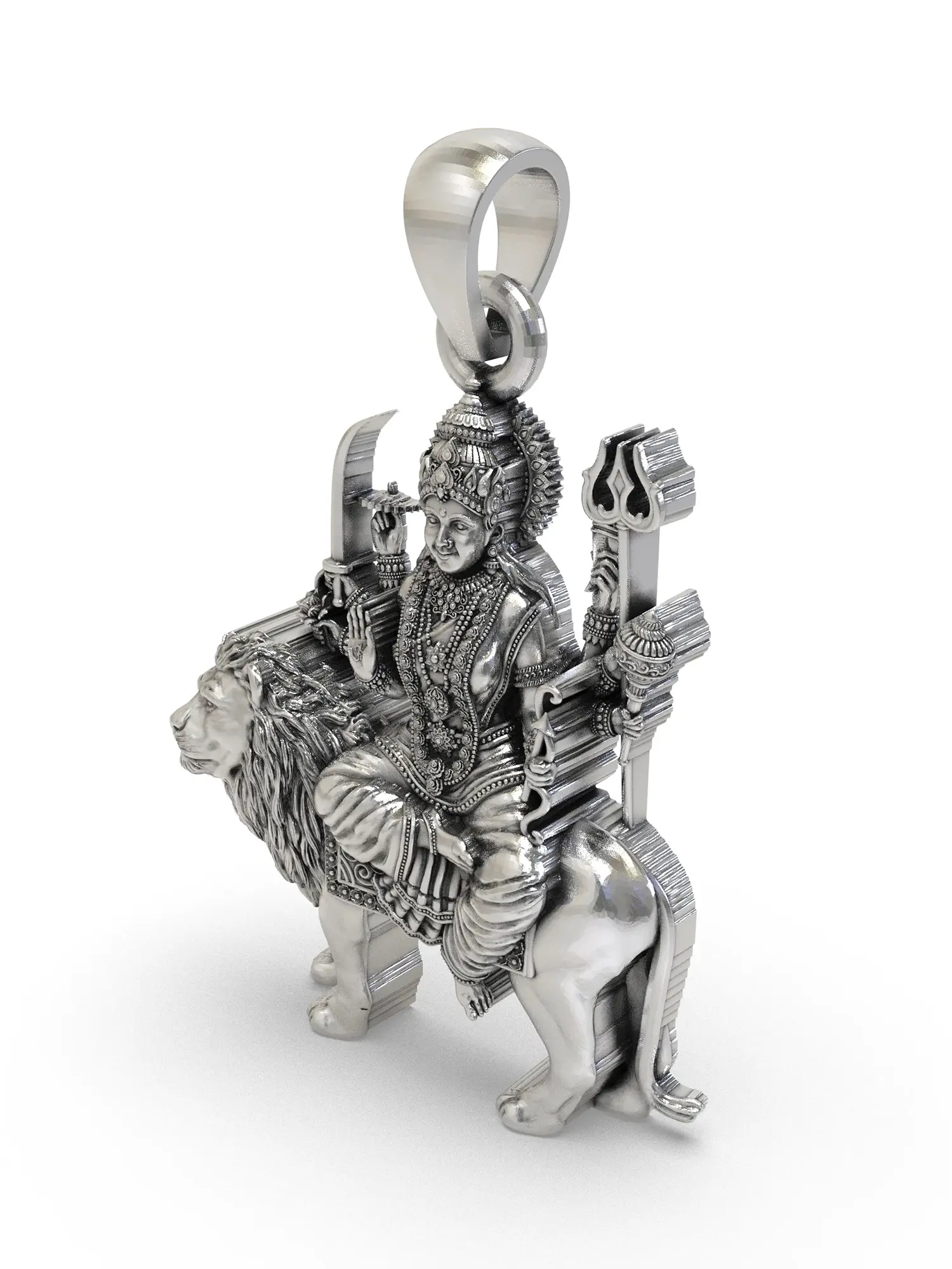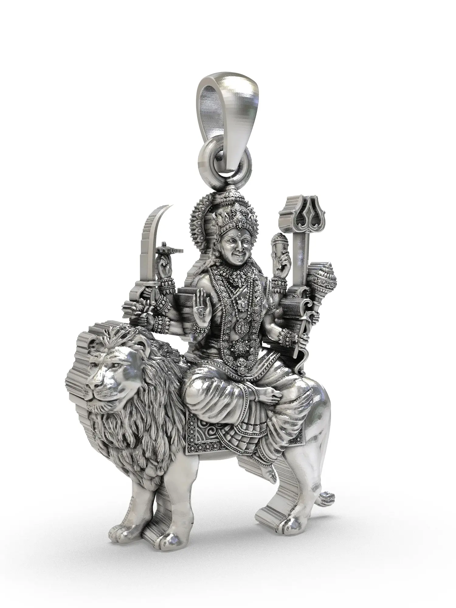 This exquisite pendant captures the powerful and benevolent form of Ambe Maa, also known as Goddess Durga, in her majestic ride upon a fierce lion. Crafted from lustrous sterling silver, this piece is more than just an adornment; it's a symbol of courage, protection, and maternal strength that has resonated for centuries. The intricate detailing of the goddess, from her serene facial expression to the fine ornamentation of her attire and jewelry, speaks of masterful artistry. Each curve of her form, the gentle drape of her clothing, and the delicate patterns adorning her are rendered with remarkable precision, reflecting a deep reverence for the divine.