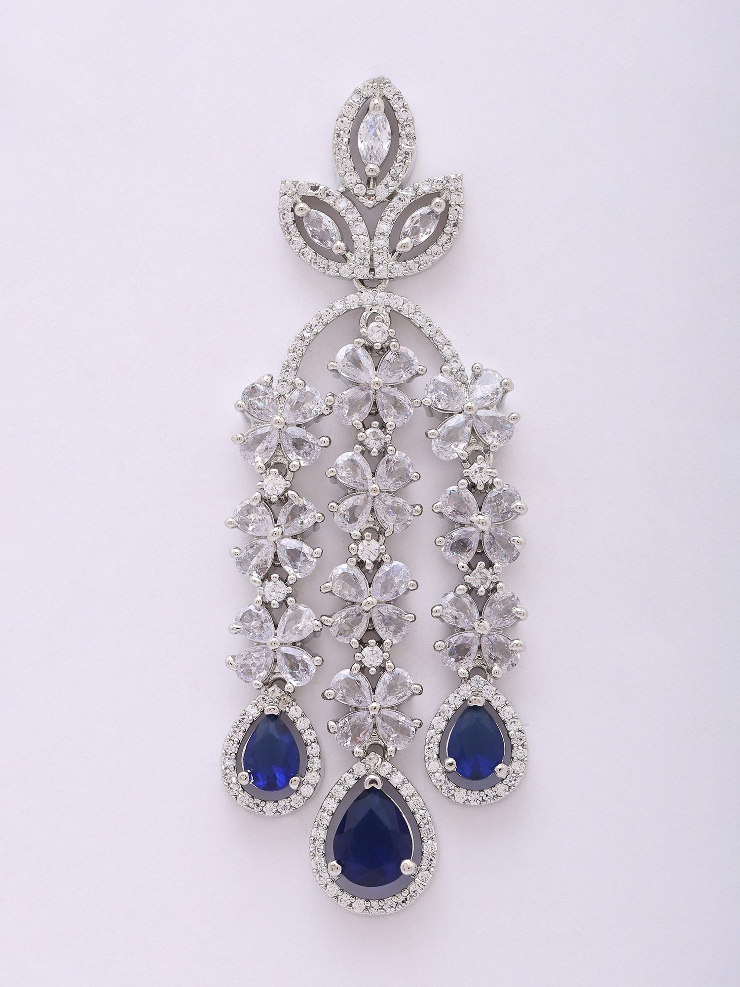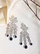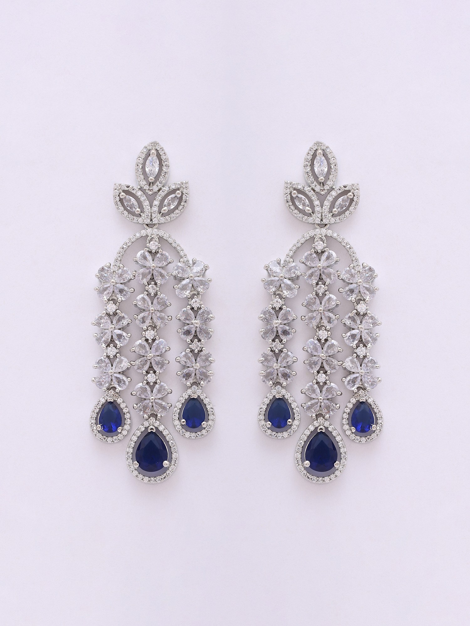 Crafted with meticulous attention to detail, each element of these statement earrings showcases exceptional artisanal skill. Brilliant American diamonds are expertly set to create intricate floral motifs, culminating in the rich allure of teardrop-shaped gemstones. The polished metal, designed to gleam, forms a delicate framework, ensuring a luxurious feel and enduring beauty.