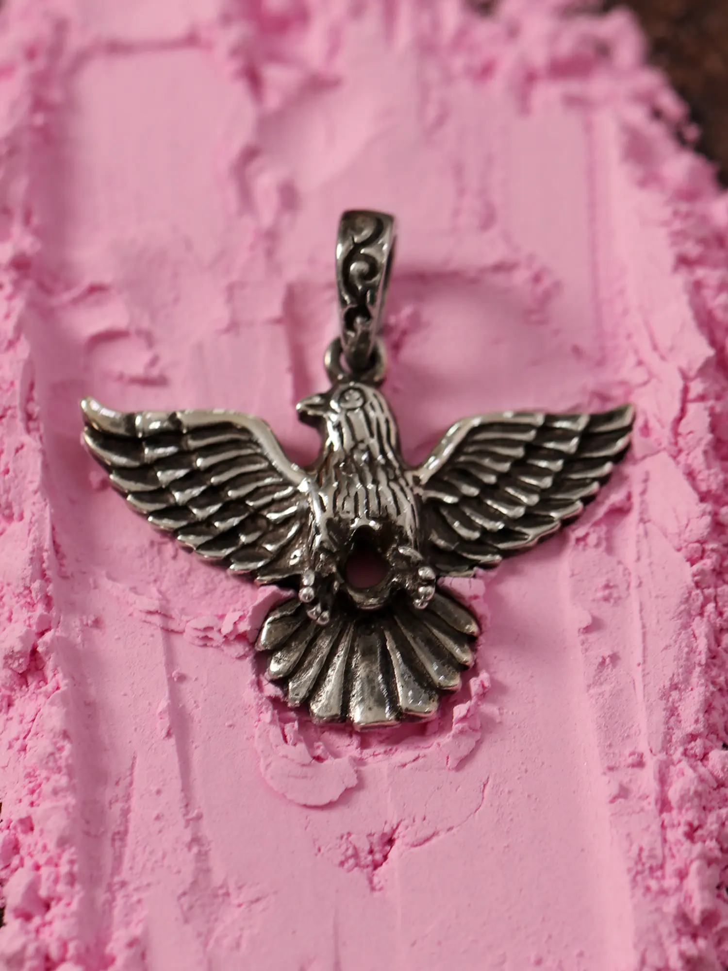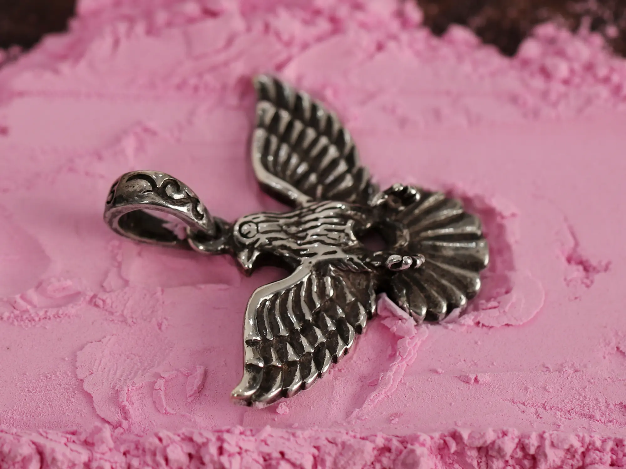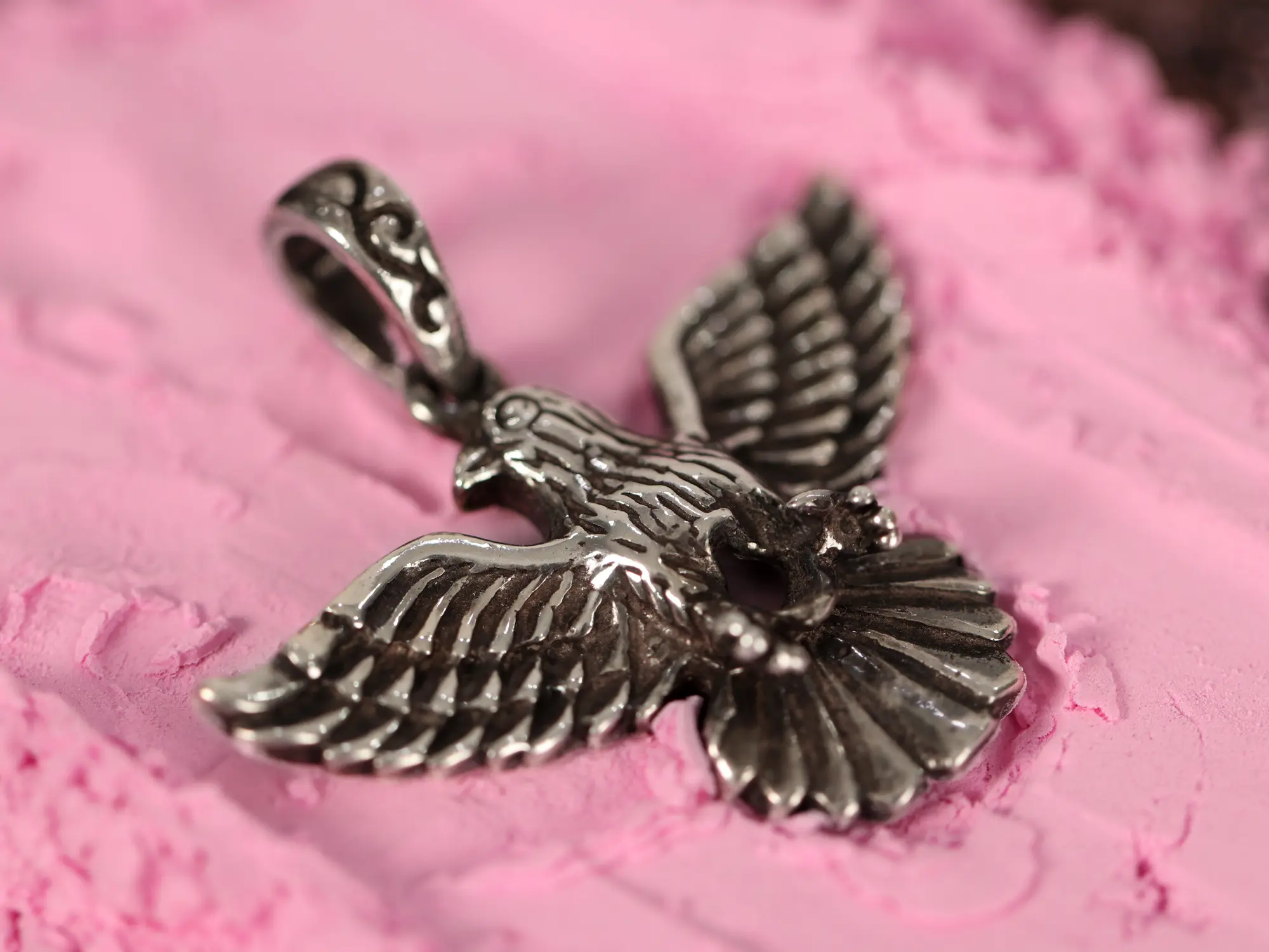 Crafted from high-quality sterling silver, this pendant is designed for lasting beauty and durability. The sterling silver maintains its lustrous sheen and can be easily cleaned to preserve its brilliance for years to come. The intricate detail on the eagle's feathers and body is testament to the superior artistry involved in its creation. The pendant features a sturdy bail that is designed to securely hold a chain, allowing for a smooth and comfortable wearing experience. The weight feels substantial in your hand, signifying the quality and attention to detail that went into its construction. Choose this pendant for its enduring quality and the confidence it inspires.