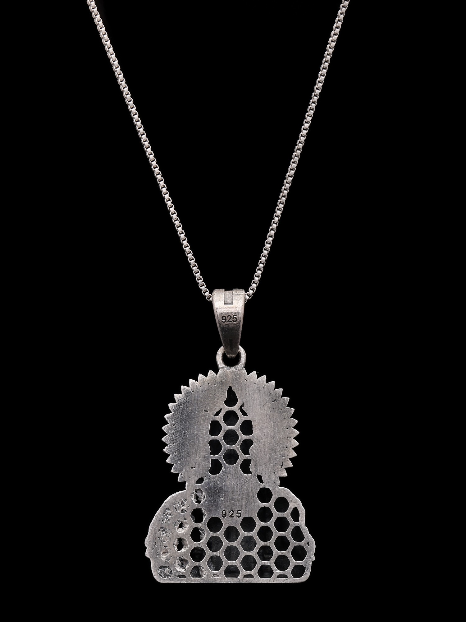 Crafted from sterling silver, this pendant possesses a lasting quality and a timeless appeal. Sterling silver has long been valued for its durability, luster, and ability to hold intricate designs. The antique finish lends a touch of vintage charm, highlighting the contours and details of the design while adding depth and character. The pendant's solid construction ensures it will be a treasured piece for years to come.