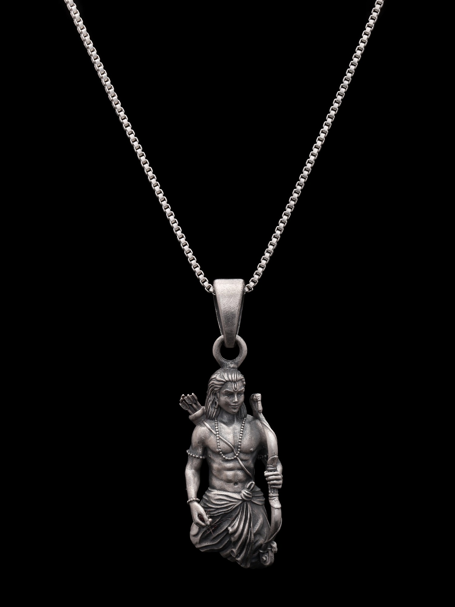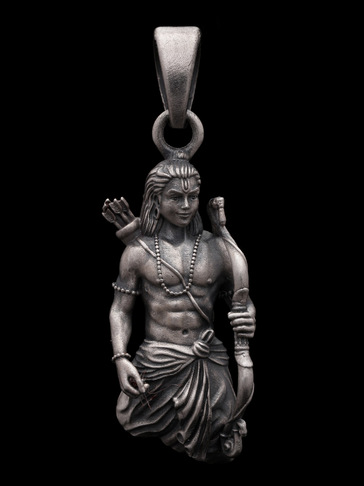 The pendant captures the essence of Lord Rama, depicting Him in a posture of strength and grace. The bow held firmly in His hand symbolizes His readiness to defend the righteous, while the gentle expression on His face radiates compassion and peace. Intricate detailing adorns the piece, from the texture of His clothing to the ornamentation of His accessories. The loop at the top of the pendant is designed for easy threading onto a chain of your choosing, allowing for effortless integration into your daily wear.