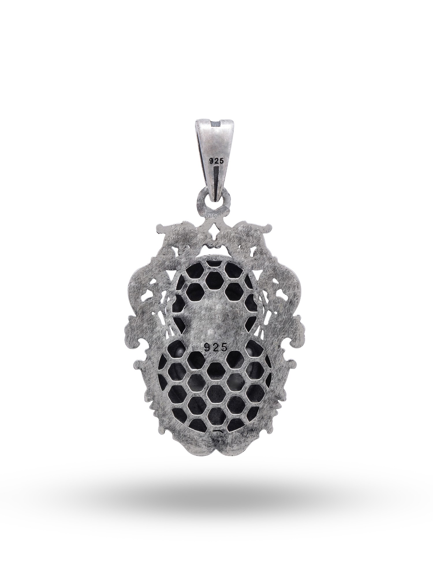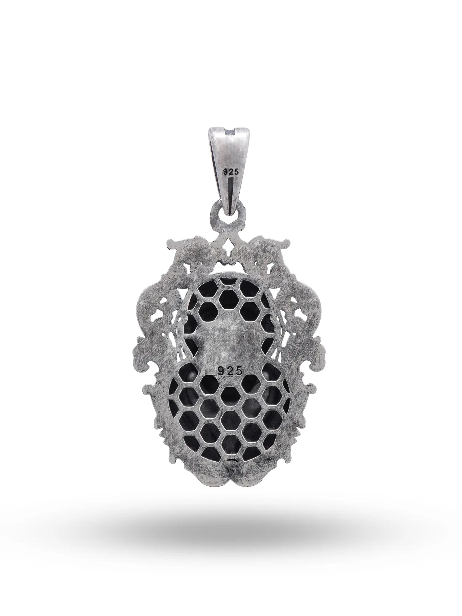 Every detail of this pendant speaks to the skilled artistry involved in its creation. The flowing lines of the decorative border create a frame of elegance and reverence. The antique finish enhances the depth and texture of the design, giving it a timeless and cherished feel. This piece is not only beautiful but also durable, ensuring that it can be treasured for years to come.