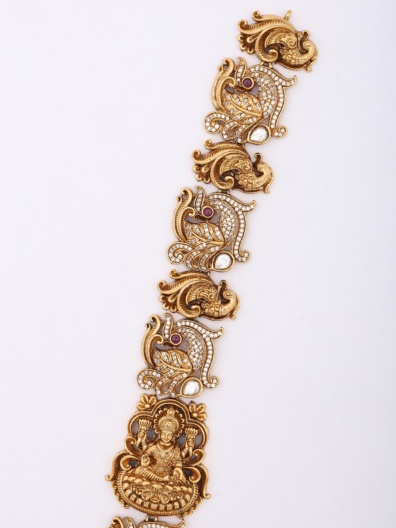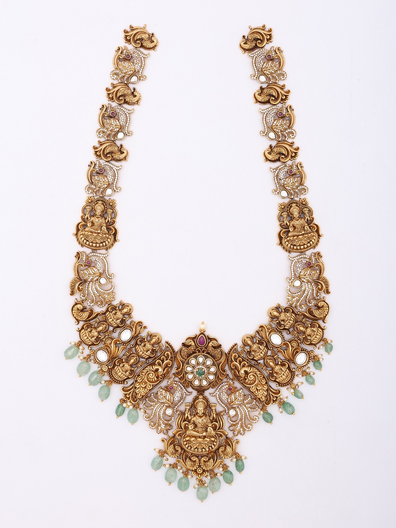 Drawing inspiration from traditional temple jewelry, this set embodies a rich cultural narrative. The divine motifs and architectural influences are reminiscent of sacred South Indian temples, where such ornate adornments were once exclusively worn during devotional ceremonies and royal celebrations. Wearing this set connects you to a lineage of beauty, spirituality, and esteemed tradition, imbuing your look with profound significance.