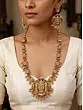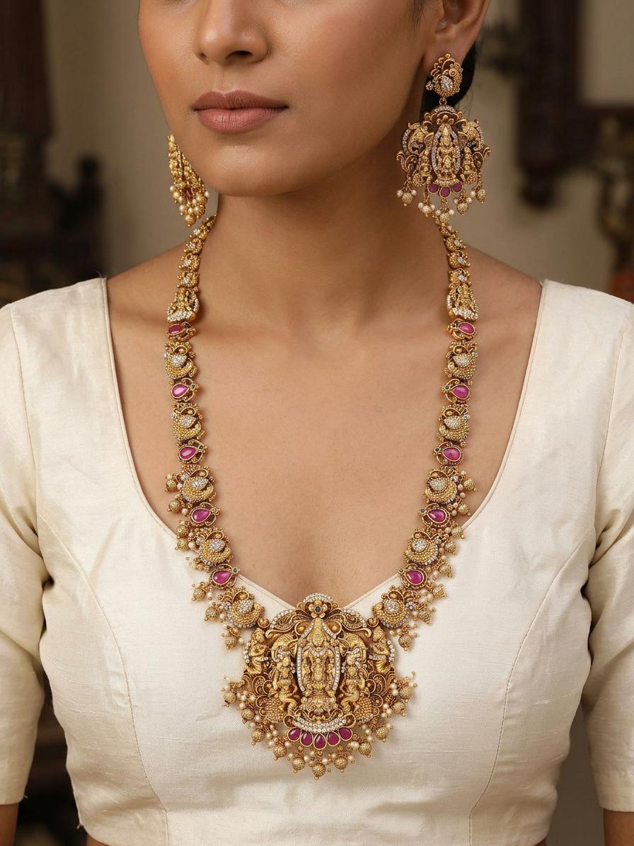This particular style draws inspiration from the rich tapestry of temple art and tradition. Its motifs and craftsmanship are deeply rooted in centuries-old practices, reflecting a spiritual heritage that is both profound and inspiring. Wearing this set connects you to an unbroken chain of artistry and devotion, allowing you to carry a piece of this sacred history with you, celebrating its enduring significance.