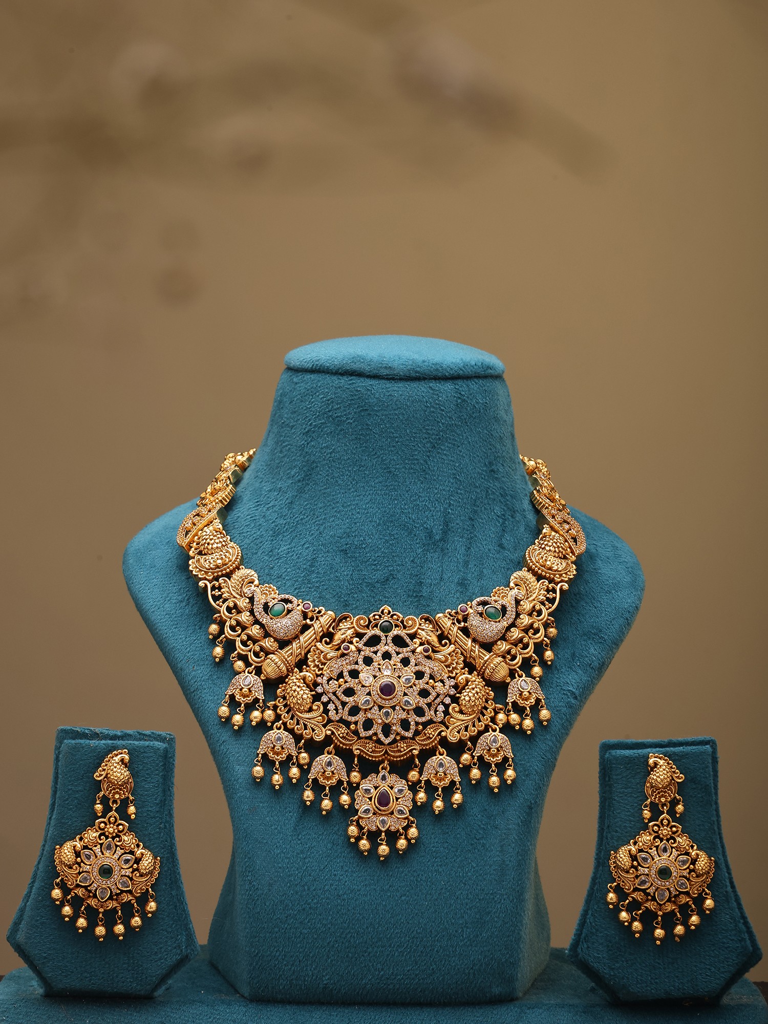Antique Finish Temple Necklace Set with Statement Earrings