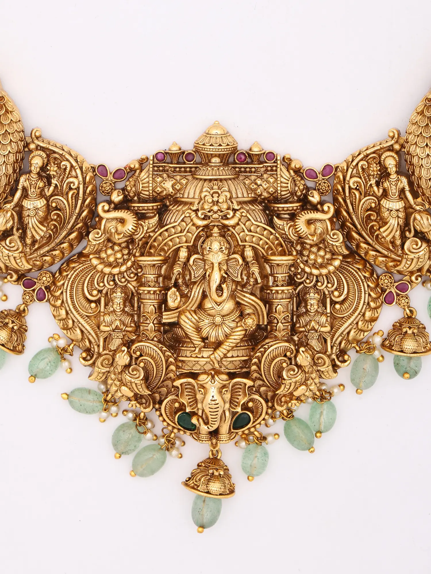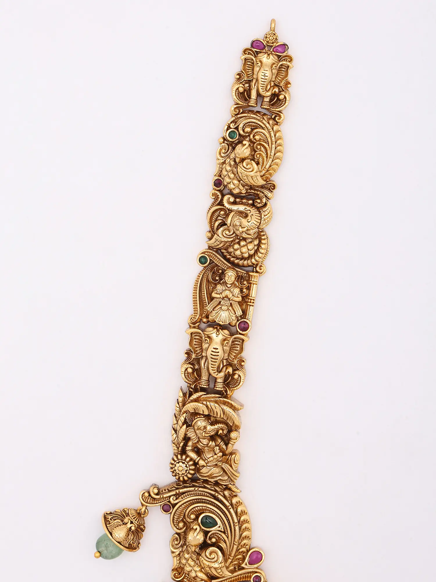 The necklace unfolds as a narrative tapestry, with the benevolent Lord Ganesha as its central divine figure, radiating wisdom and prosperity. You'll discover a captivating array of mythological scenes and auspicious symbols intricately woven throughout its impressive 10-inch height. Complementing this masterpiece, the matching earrings, each measuring 2.25 inches in height and 1.20 inches in width, echo the same divine aesthetic, adorned with delicate green stone drops.