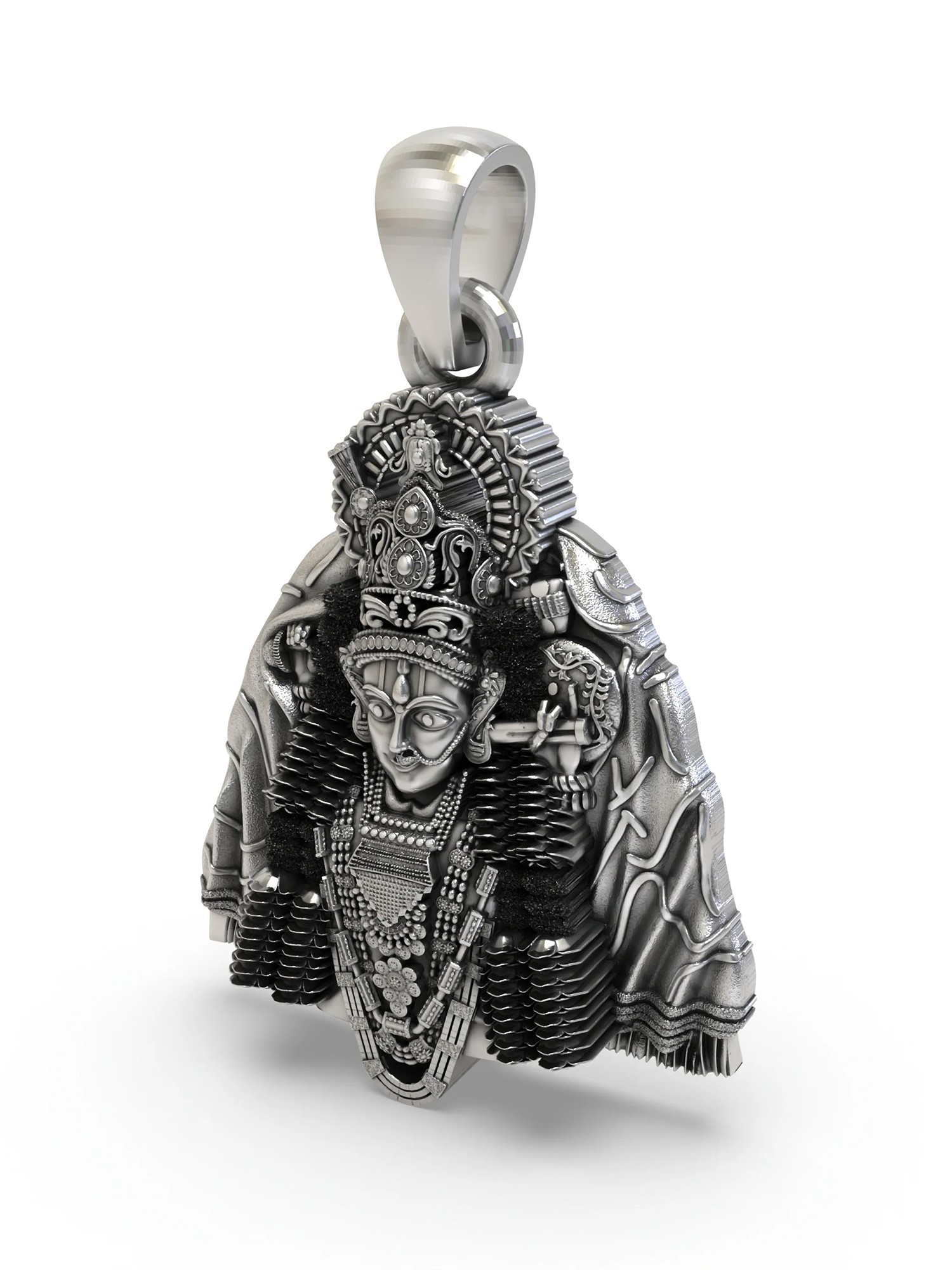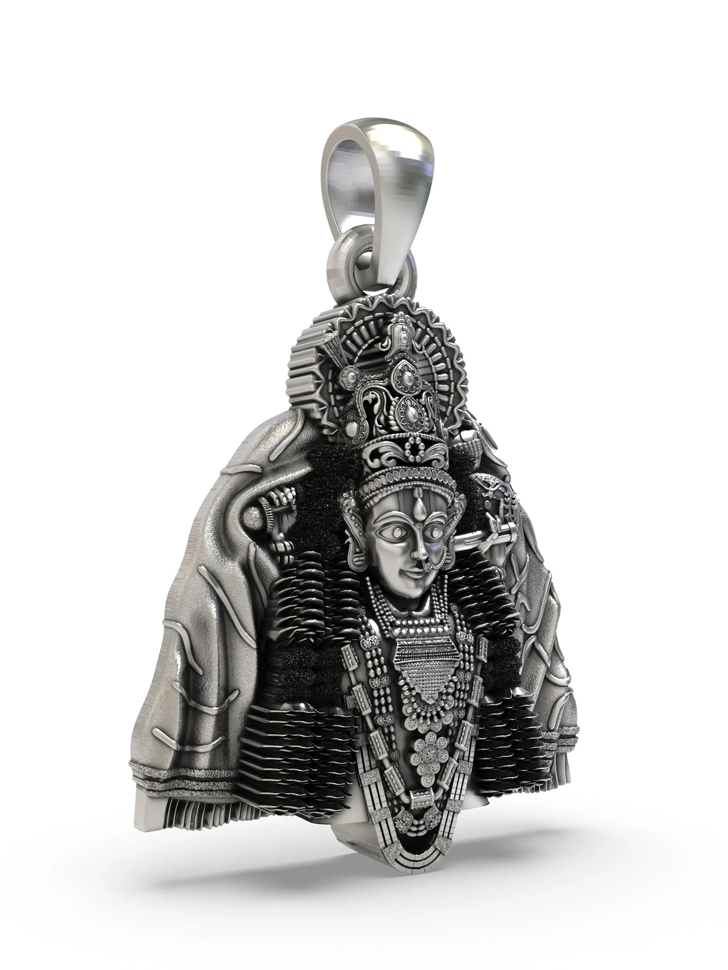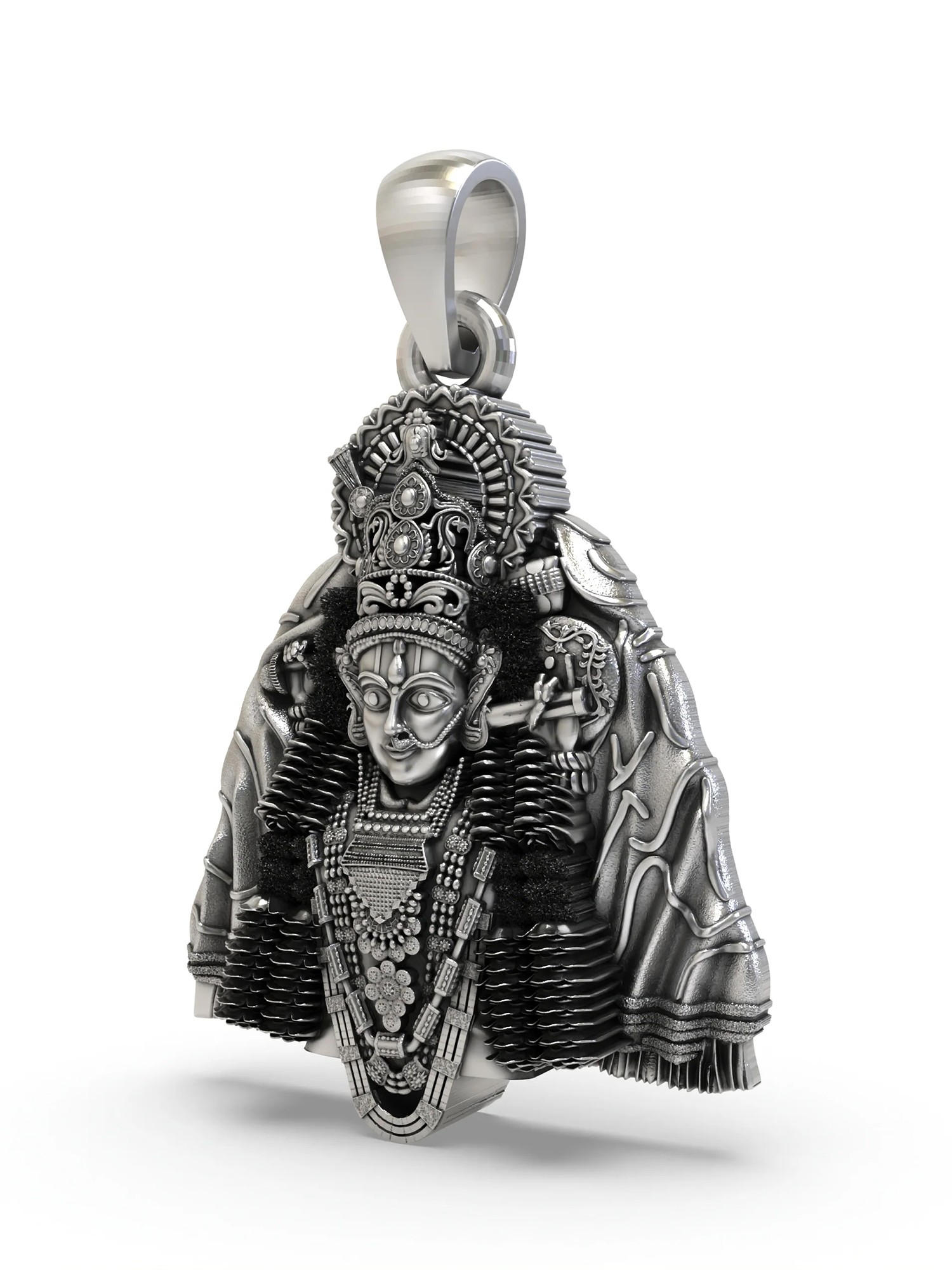 The pendant showcases a striking depiction of Ashapura Maa, adorned with elaborate jewelry and intricate drapery. Each element, from the serene expression on her face to the flowing layers of her attire, is rendered with exceptional skill. The delicate necklaces, multiple chains, and ornate headdress speak to a rich tradition of divine iconography, meticulously translated into precious metal. The use of sterling silver lends a timeless elegance and a subtle luster, enhancing the depth and character of the design. The contrasting textures, from the smooth expanse of the robes to the finely detailed ornamentation, create a visually captivating piece that draws the eye and invites contemplation.