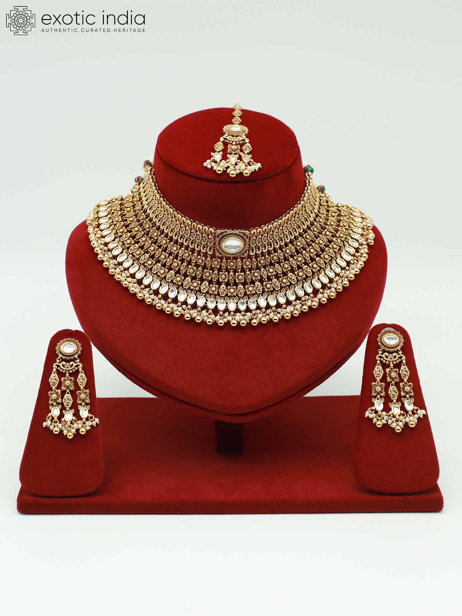 Embellished Carving Necklace Set With Attractive Mangtika And Earrings