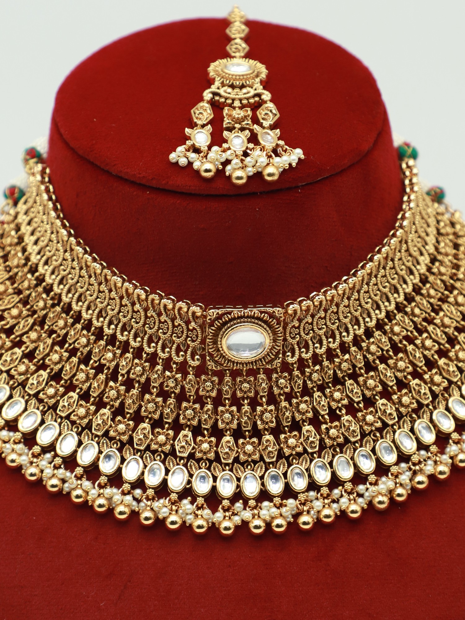 Choker Attractive Stone Studded Necklace With Matching Earrings And Mangtika