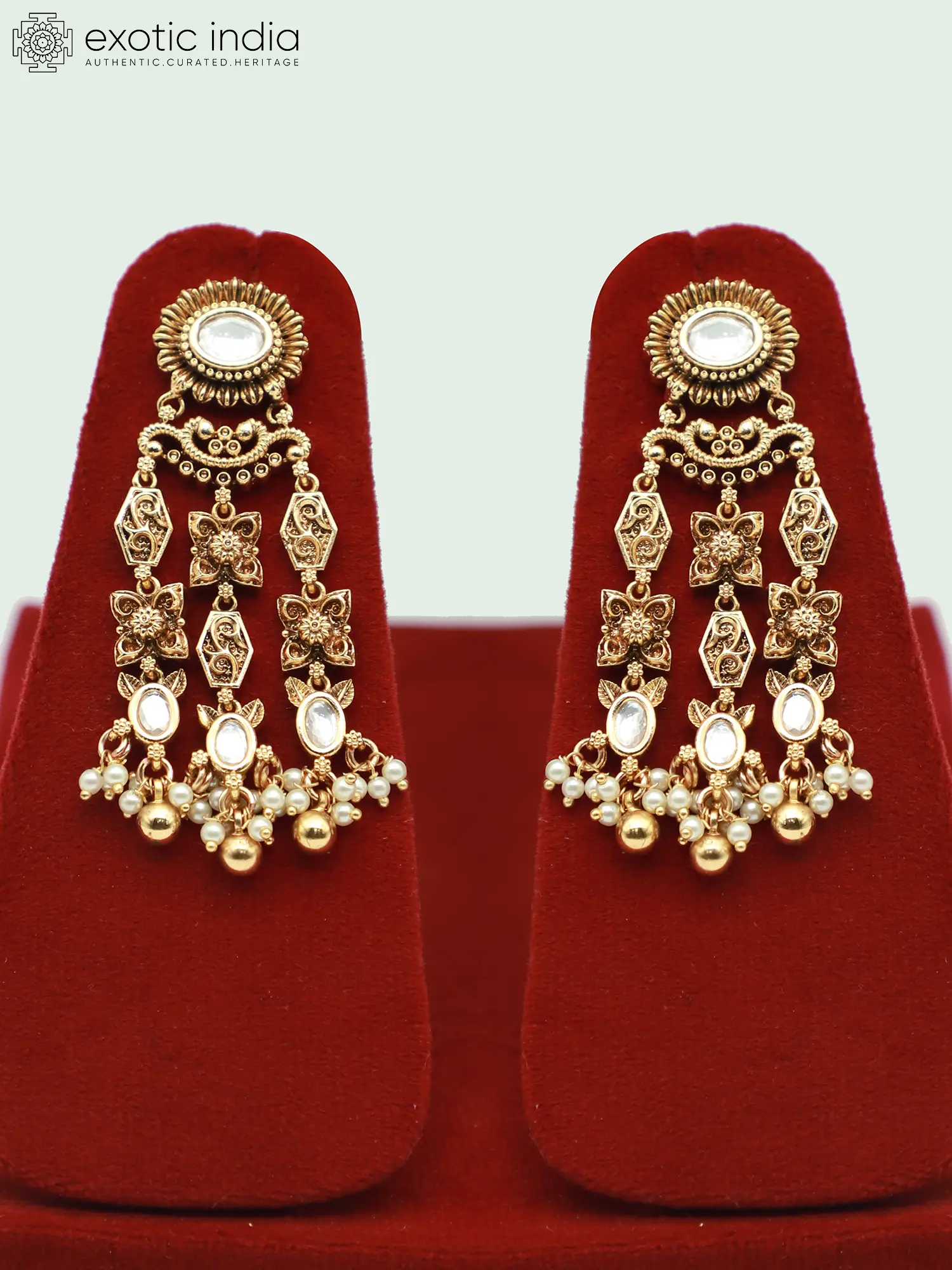 Attractive Kundan Stone Necklace Set In Brass With Mangtika And Hanging Beads Earrings For Bride