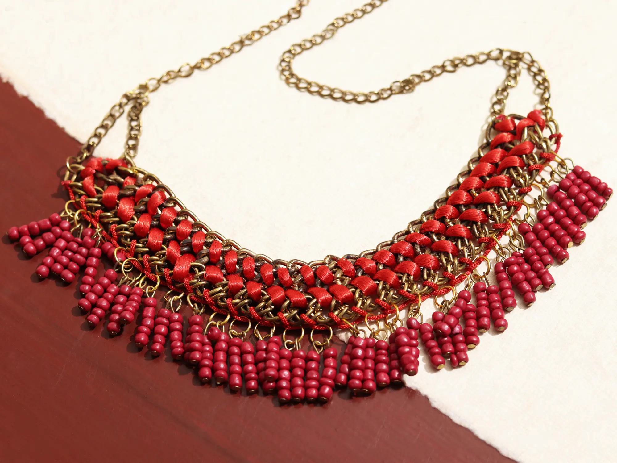 Adding a touch of bohemian charm, the necklace is adorned with cascading beaded pendants. Each pendant features a collection of colorful beads, carefully selected and arranged to complement the overall design. The combination of the metal base, colorful threads, and vibrant beads creates a harmonious blend of textures and hues, resulting in a truly unique and captivating piece of jewelry. This piece embodies the spirit of Indian fashion jewelry, offering a rich blend of traditional craftsmanship and contemporary design. Its 7-inch length sits comfortably around the neck, making it an ideal choice for adding a pop of color and personality to any outfit.