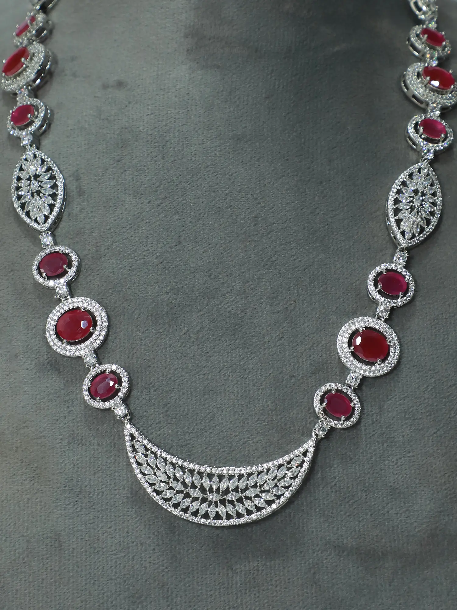 This set uses brilliant American diamonds which closely resemble their natural counterparts in appearance and sparkle. The stones are carefully selected and expertly set to maximize their brilliance, ensuring a dazzling effect that catches the eye from every angle. These stunning stones, combined with the overall design, give this set a look that is both opulent and refined.