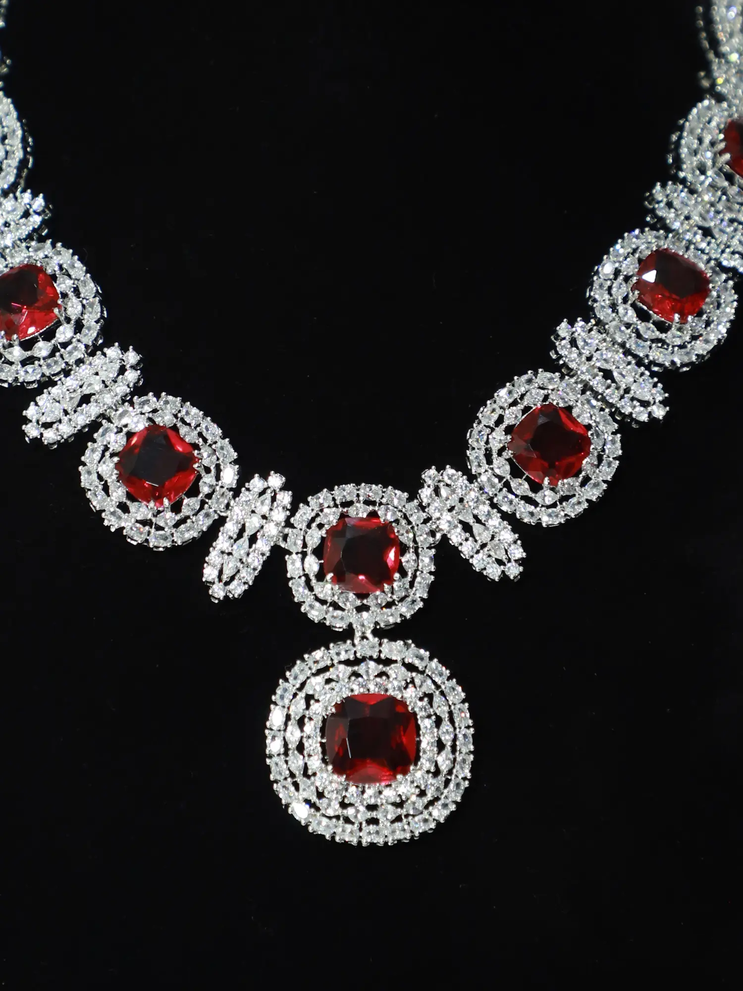 This exquisite necklace and earring set is a true masterpiece of design and craftsmanship. The rich, deep blue of the ruby stones is exquisitely complemented by the sparkling American diamonds, creating a look that is both elegant and captivating. Perfect for adding a touch of glamour to any outfit, this set is sure to turn heads wherever you go. The silver polish base provides a sophisticated backdrop that enhances the brilliance of the stones, making it a timeless piece you'll cherish for years to come.
