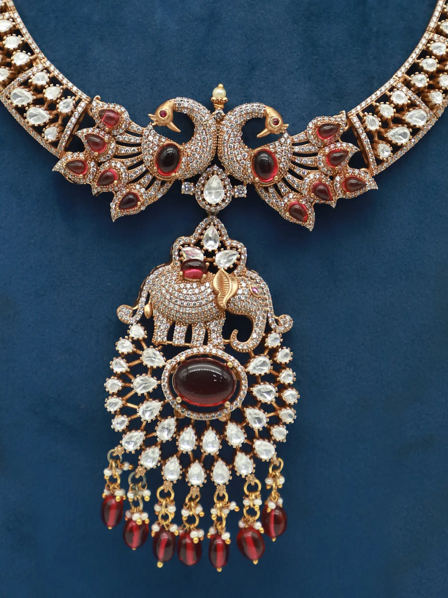 Crafted from high-quality brass, this set boasts durability and a lasting shine. The metalwork is artfully finished with a matt polish, giving it a sophisticated and refined appearance. The meticulous setting of the stones showcases the skill of the artisans, creating a symphony of sparkle and color. The elaborate peacock design is the focal point of the necklace, symbolizing beauty, grace, and prosperity. The addition of carefully placed colored stones further enhances the design, adding depth and vibrancy.