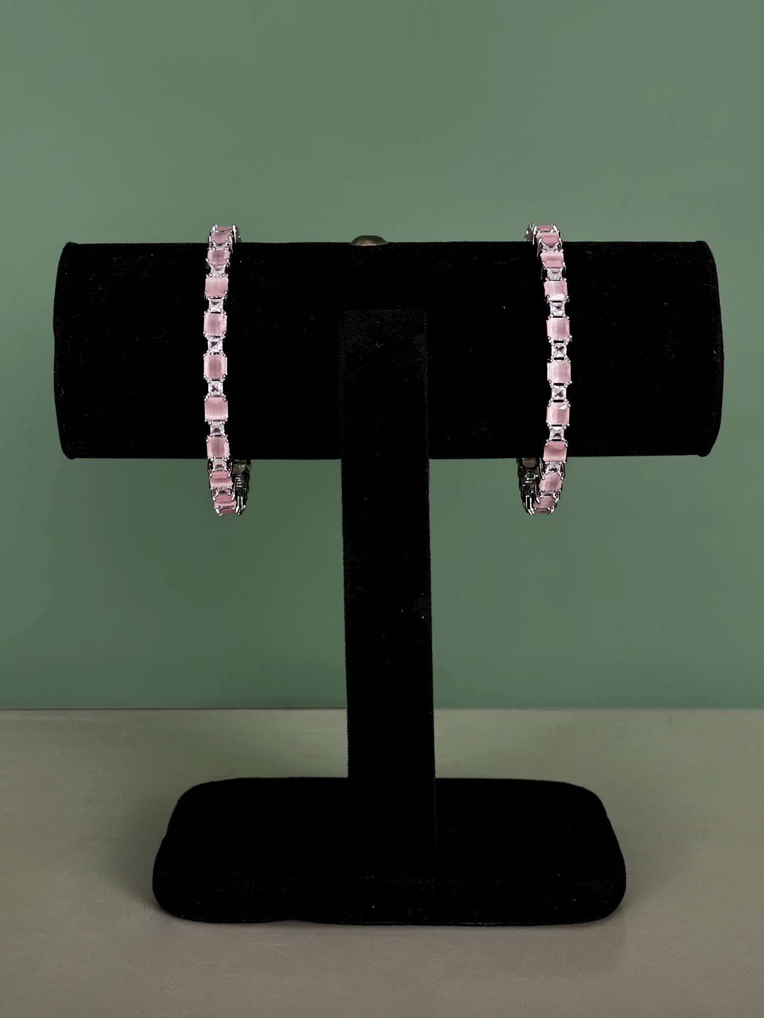 These exquisite pink and white square-shaped zircon bracelets will add a touch of refinement to your wristwear. Sparkling zircon stones decorate each bangle, which is painstakingly made with elaborate pink and white square motifs. These bangles are ideal for injecting a little sophistication into any ensemble because they have an ageless elegance and grace. Their delicate beauty will boost any ensemble, whether worn singly for a subtle statement or piled together for a bolder effect.