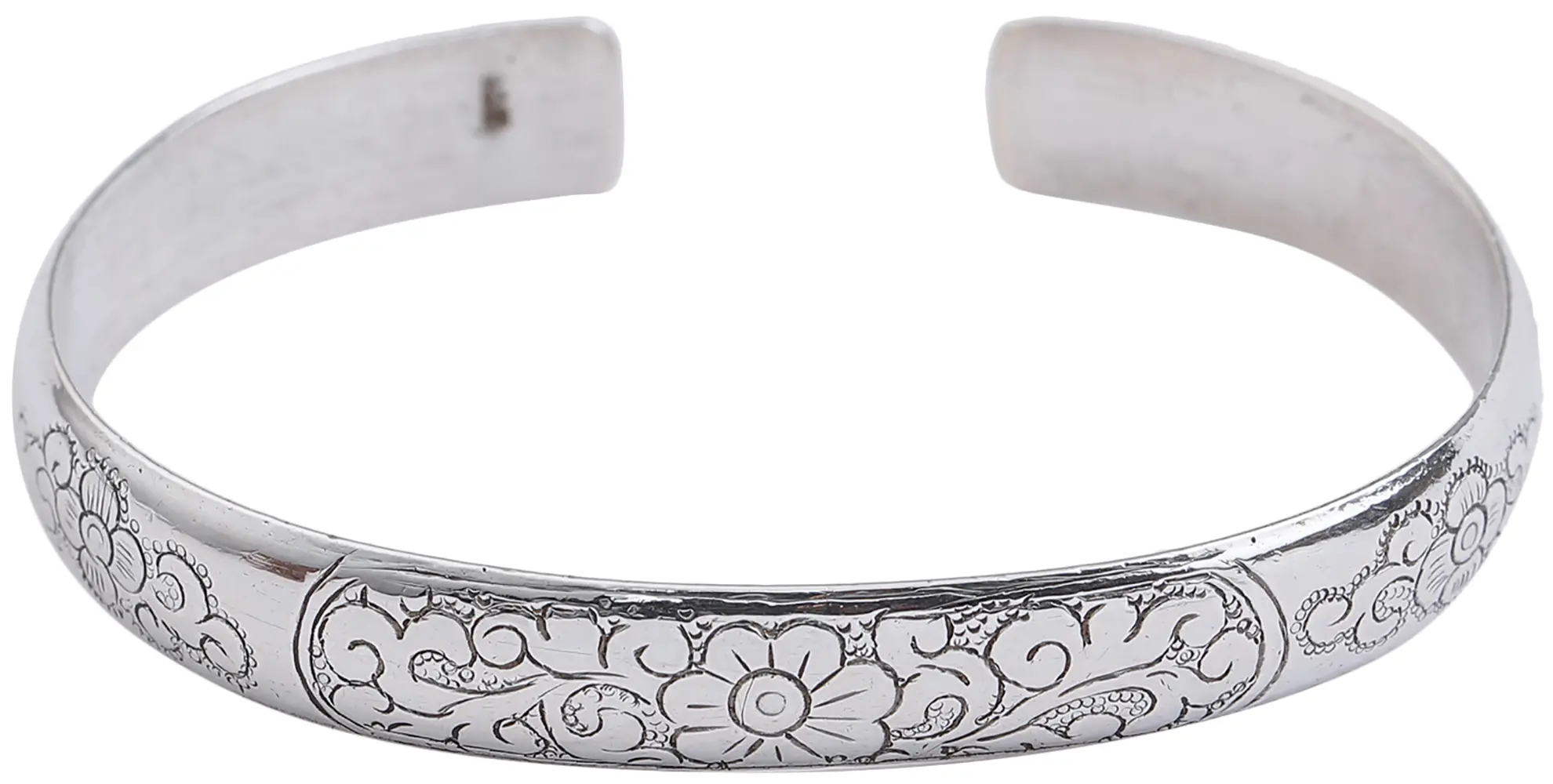 Discover a piece that whispers of ancient artistry and enduring beauty. This exquisite cuff bracelet, meticulously crafted in Nepal, is a testament to the skill of master silversmiths. Its smooth, polished sterling silver surface is adorned with a captivating floral motif, intricately engraved to bring the delicate petals and flowing vines to life. The classic design evokes a sense of heritage, making it a truly special addition to any jewelry collection.