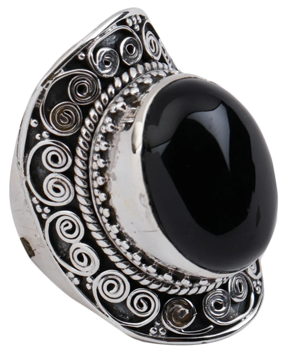 The bold yet elegant design of this ring makes it incredibly versatile. It’s a statement piece that can elevate a simple outfit, adding a touch of drama and personality. Whether you're dressing for a formal event, a sophisticated evening out, or simply want to add a touch of luxury to your everyday wear, this ring is the perfect accessory. It also makes for a thoughtful and impressive gift, symbolizing depth, protection, and grounding – qualities often associated with black onyx. Embrace the allure of classic design and the beauty of natural stone with this unforgettable sterling silver ring.