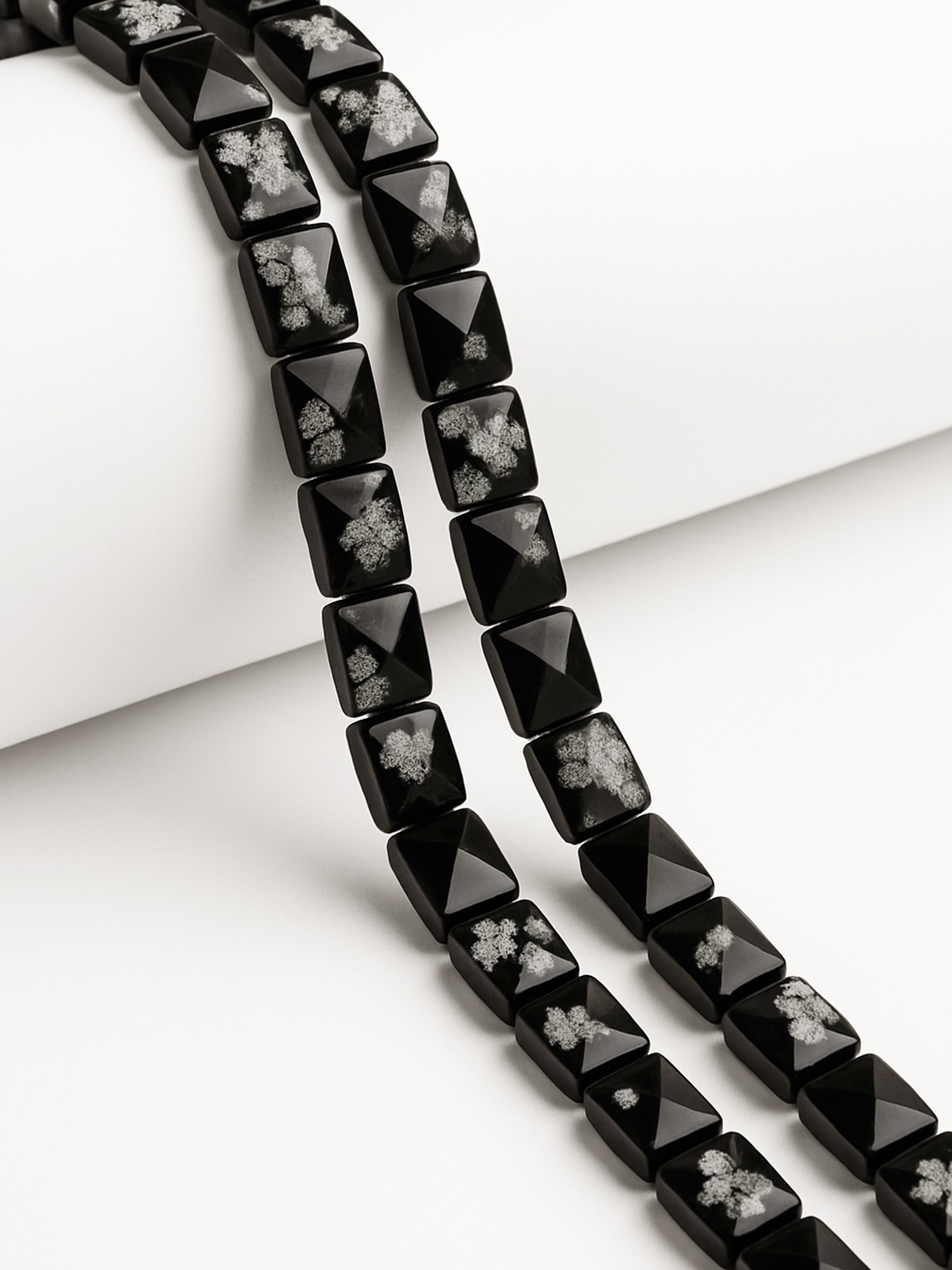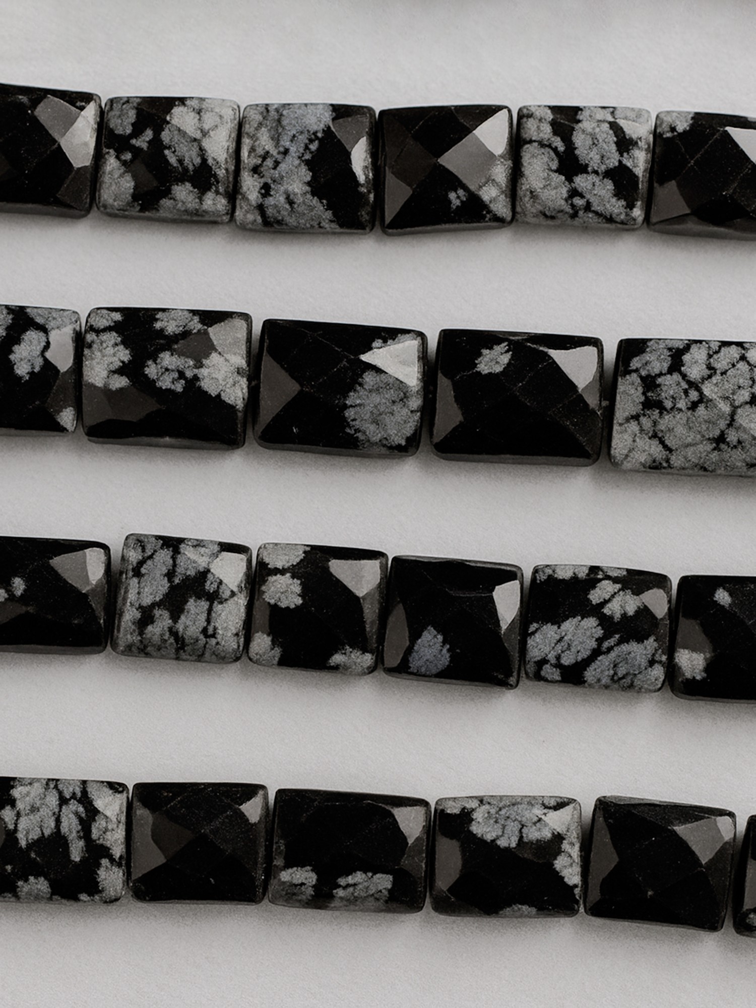 Black Snowflake Obsidian Faceted Chewing Gum beads offer unique usability in jewelry design. Their faceted surface adds depth and dimension to pieces, creating a striking visual contrast against smooth or round beads. The black base with snowflake-like white patterns adds intrigue and elegance to bracelets, necklaces, and earrings. These beads are versatile, suitable for both casual and formal wear, and can be combined with various metals and gemstones for a personalized touch. Their bold yet sophisticated appearance makes them a versatile choice for any jewelry collection.