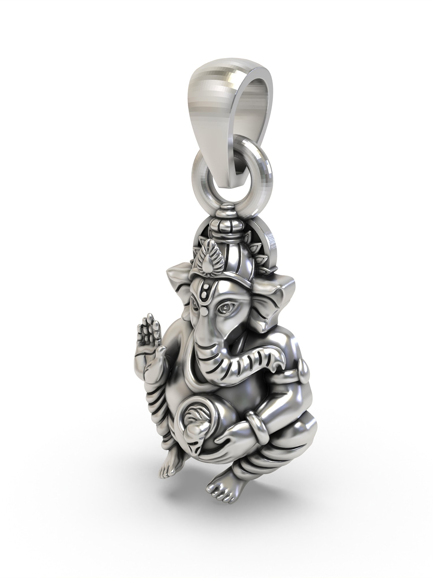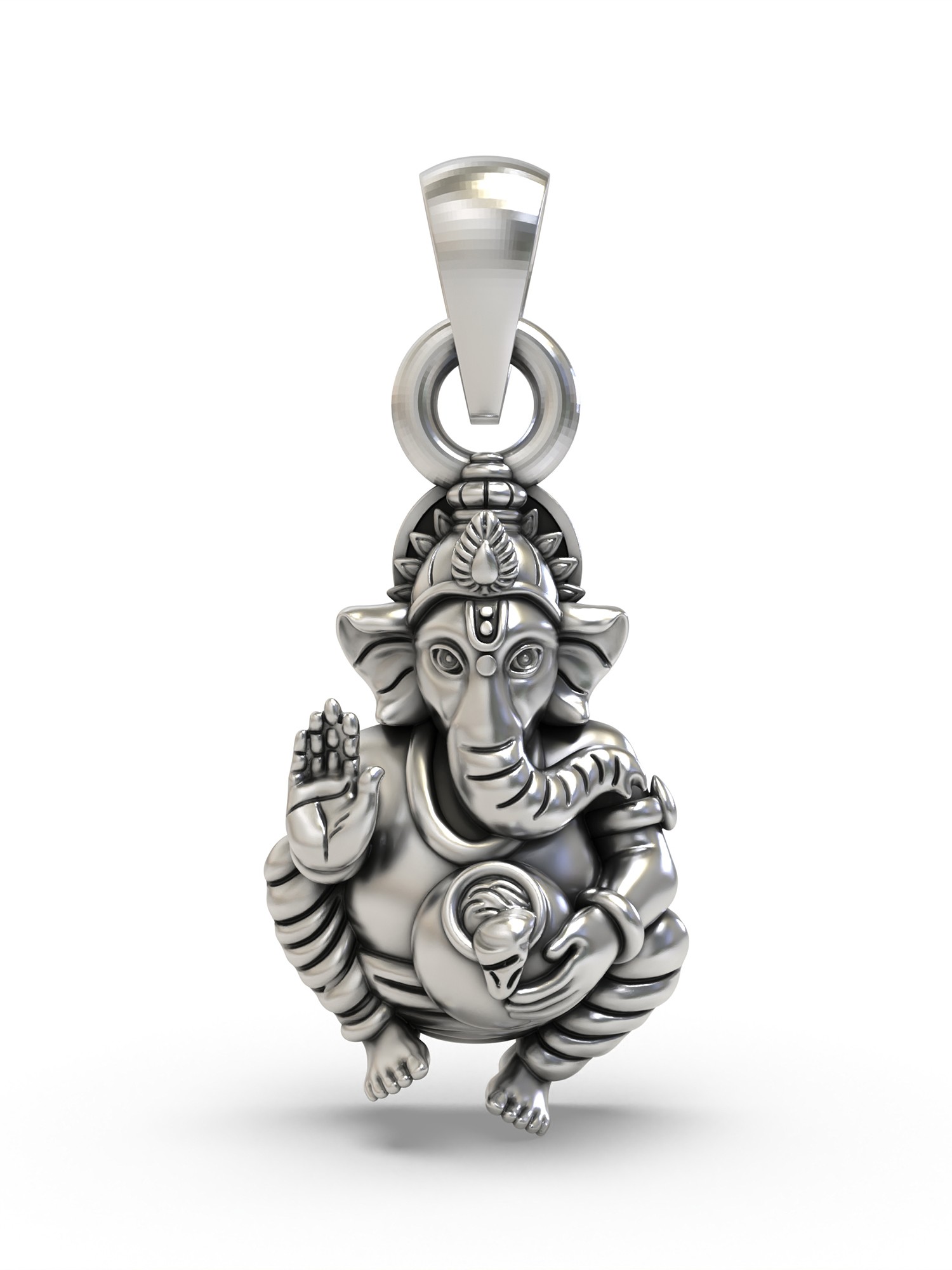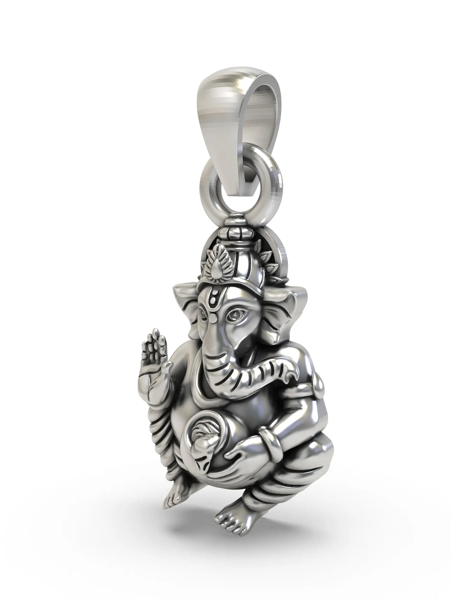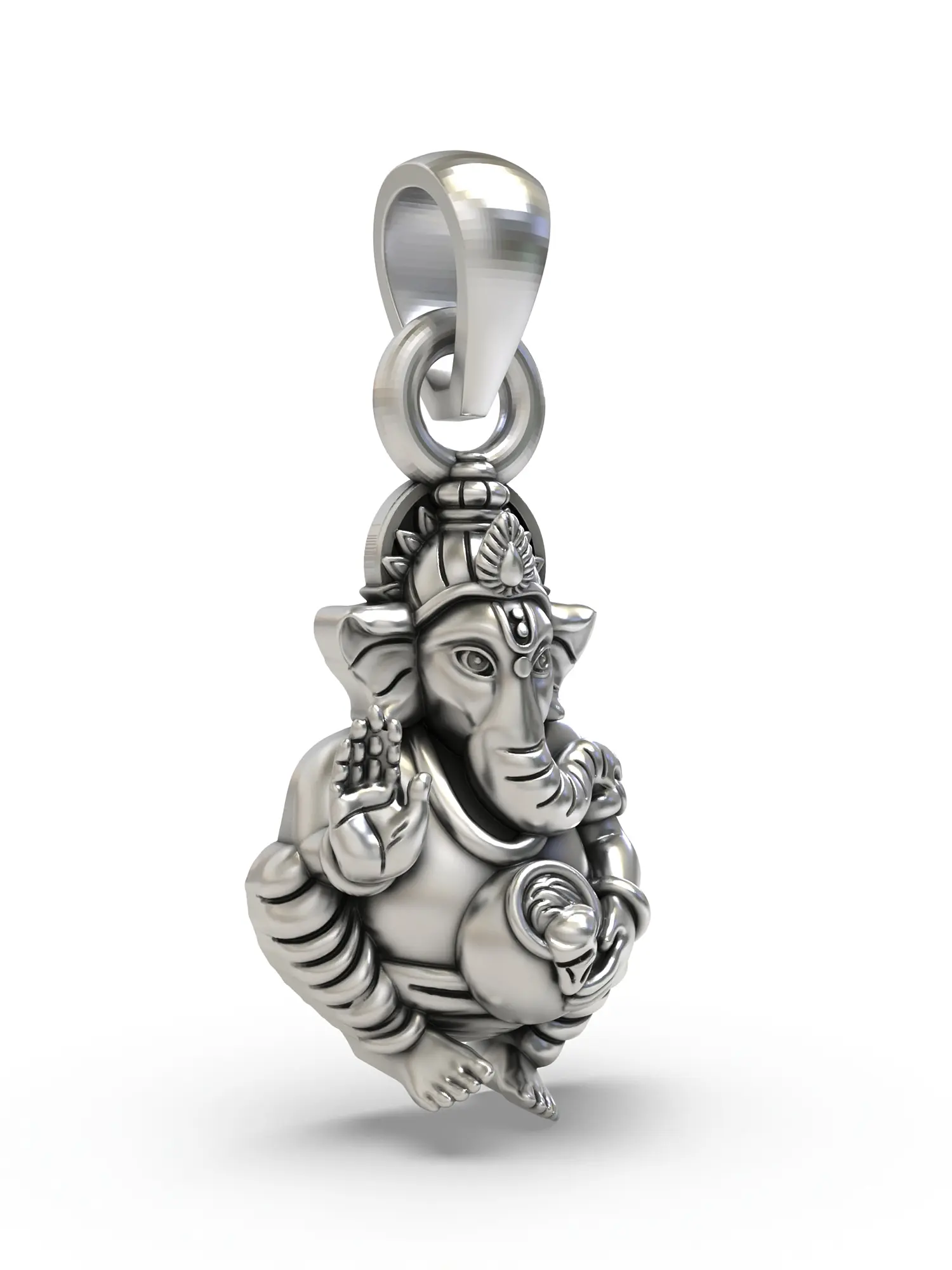 Every detail of this pendant has been carefully considered, from the graceful curve of Ganesha's trunk to the intricate design of his headwear. Expertly crafted from gleaming sterling silver, the pendant showcases the deity in a seated pose, his hand raised in a gesture of blessing. The smooth, polished finish enhances the pendant's visual appeal, making it a stunning piece that will catch the eye. The pendant's design captures Ganesha's benevolent spirit, creating a piece of jewelry that is both beautiful and spiritually significant.