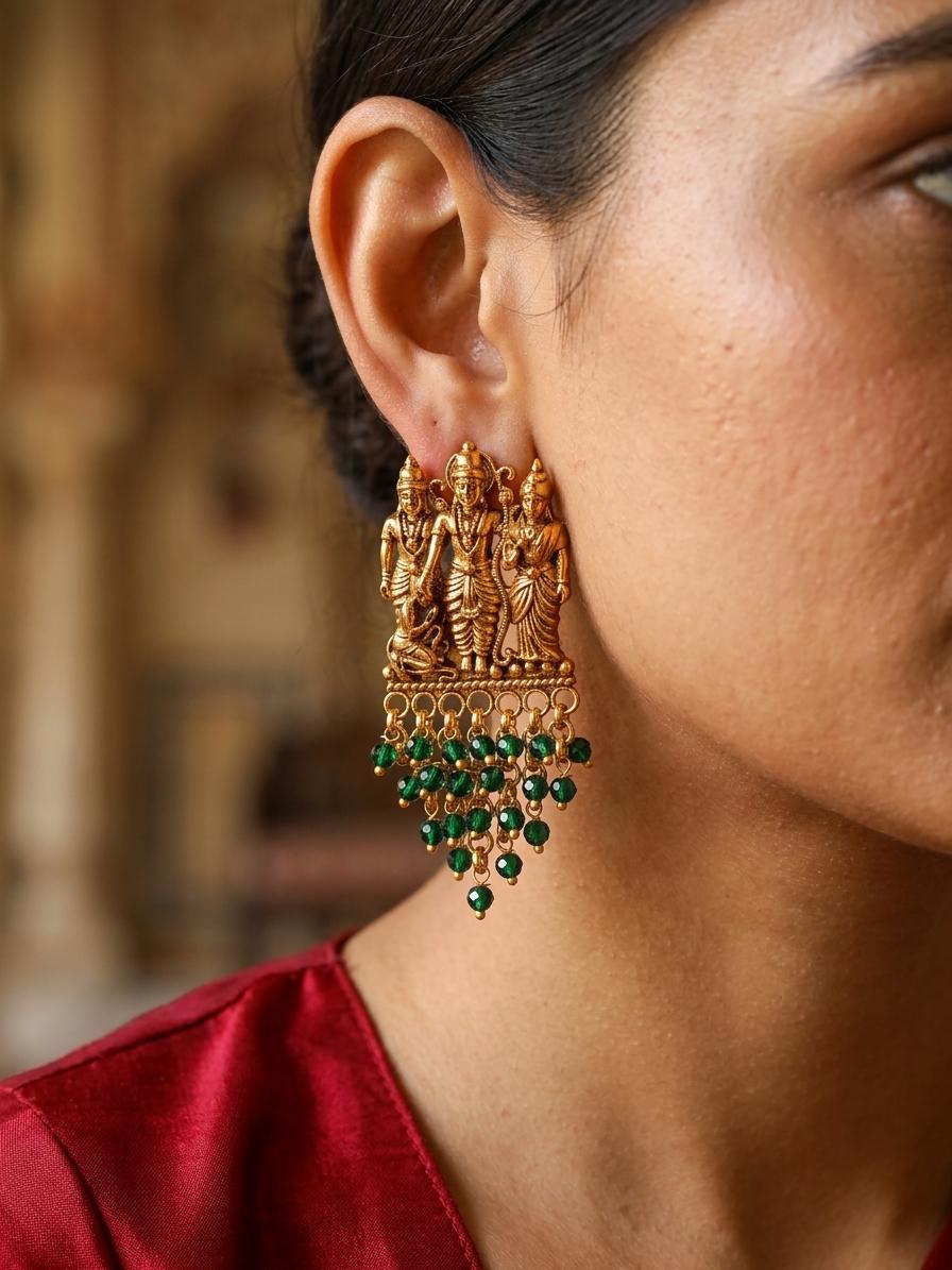 The Ram Darbar motif is not merely a surface design; it’s a sculptural masterpiece. Notice the fine lines etched into the clothing, the subtle expressions on the faces of the figures, and the overall harmony of the composition. It’s a testament to the artistry and attention to detail involved in creating these earrings. Further enhancing their beauty is the cascading fringe of vibrant green beads that hang delicately beneath the Ram Darbar scene. These lustrous beads add a touch of sparkle and movement, complementing the golden hue of the brass and creating a captivating interplay of light and texture. The contrast between the rich gold and the striking green creates a visually stunning effect.