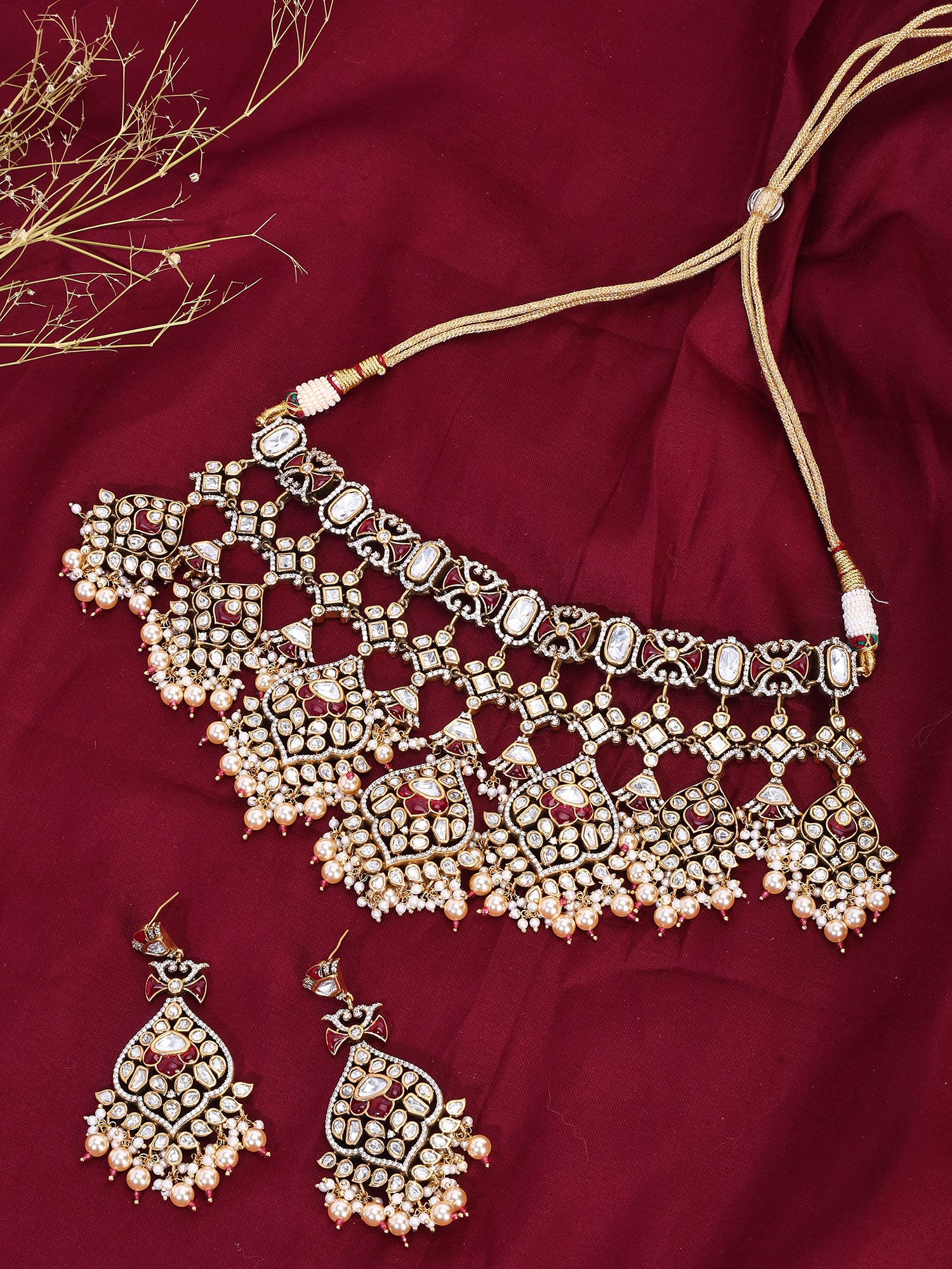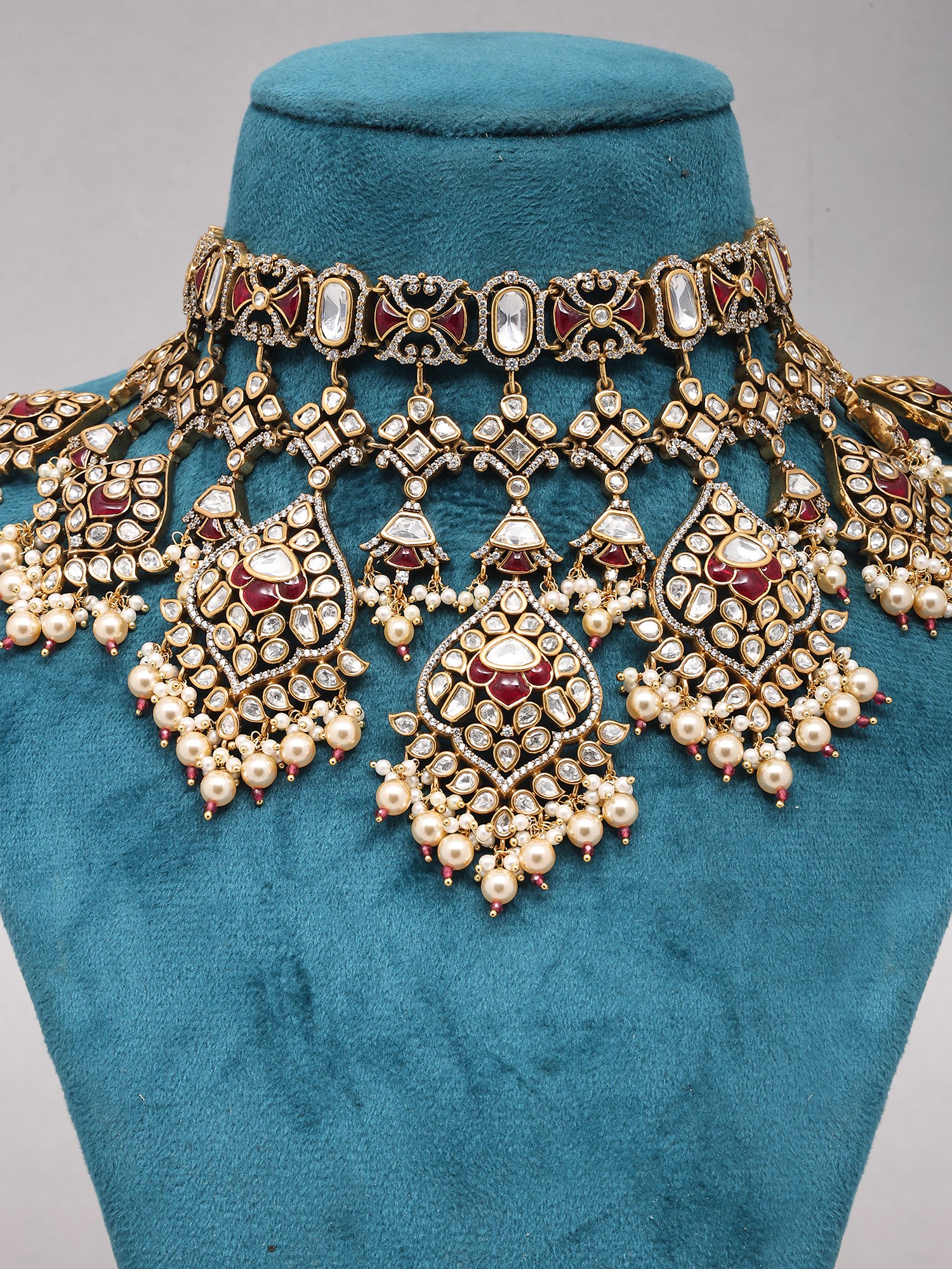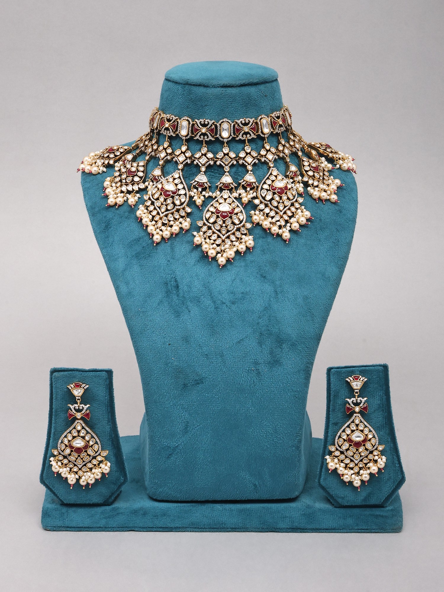 Bridal Choker Necklace Set with Kundan Stones and Pearl Drops