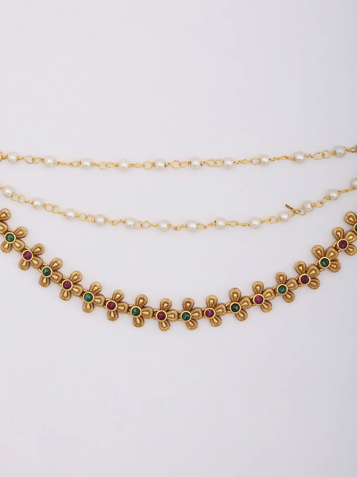Discover a design that flows with captivating grace, extending approximately 6.5 inches in height to frame your features beautifully. Delicate strands of lustrous pearls cascade from finely wrought chains, offering a sophisticated contrast to the meticulously crafted floral embellishments. Each flower, graced with two complementary colored stones, forms a rhythmic pattern that catches the light with every subtle movement. The secure clasp ensures comfortable wear, allowing the artistry to take center stage.