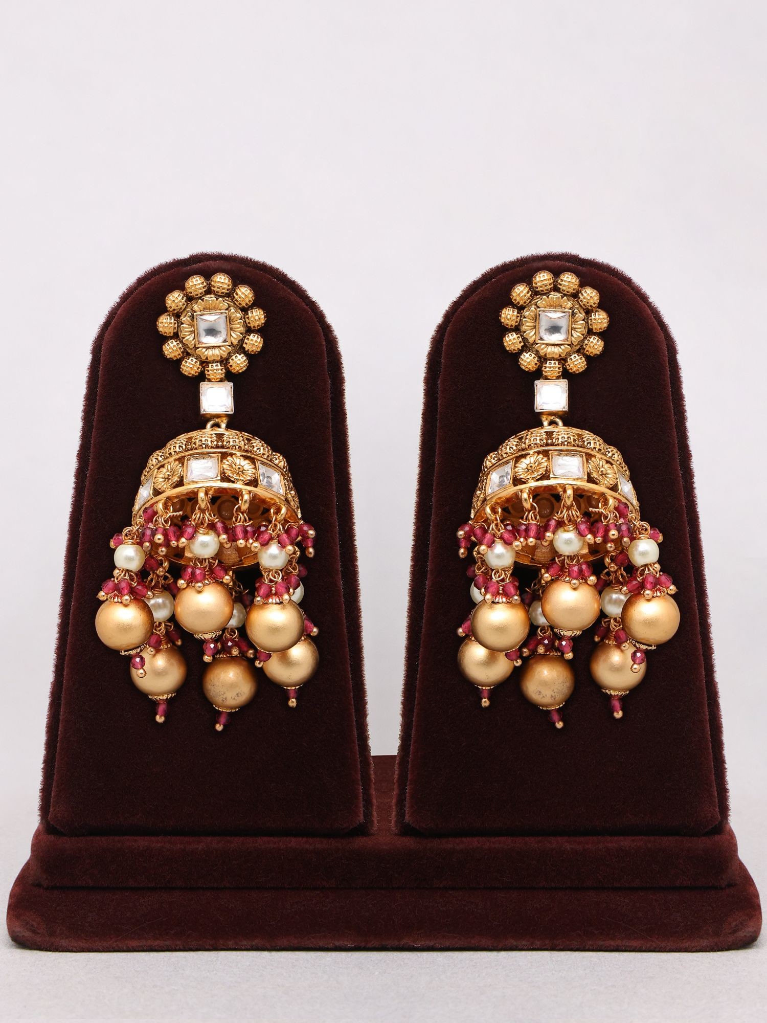 • Adorned with rich gold-toned beads and subtle red stone accents.