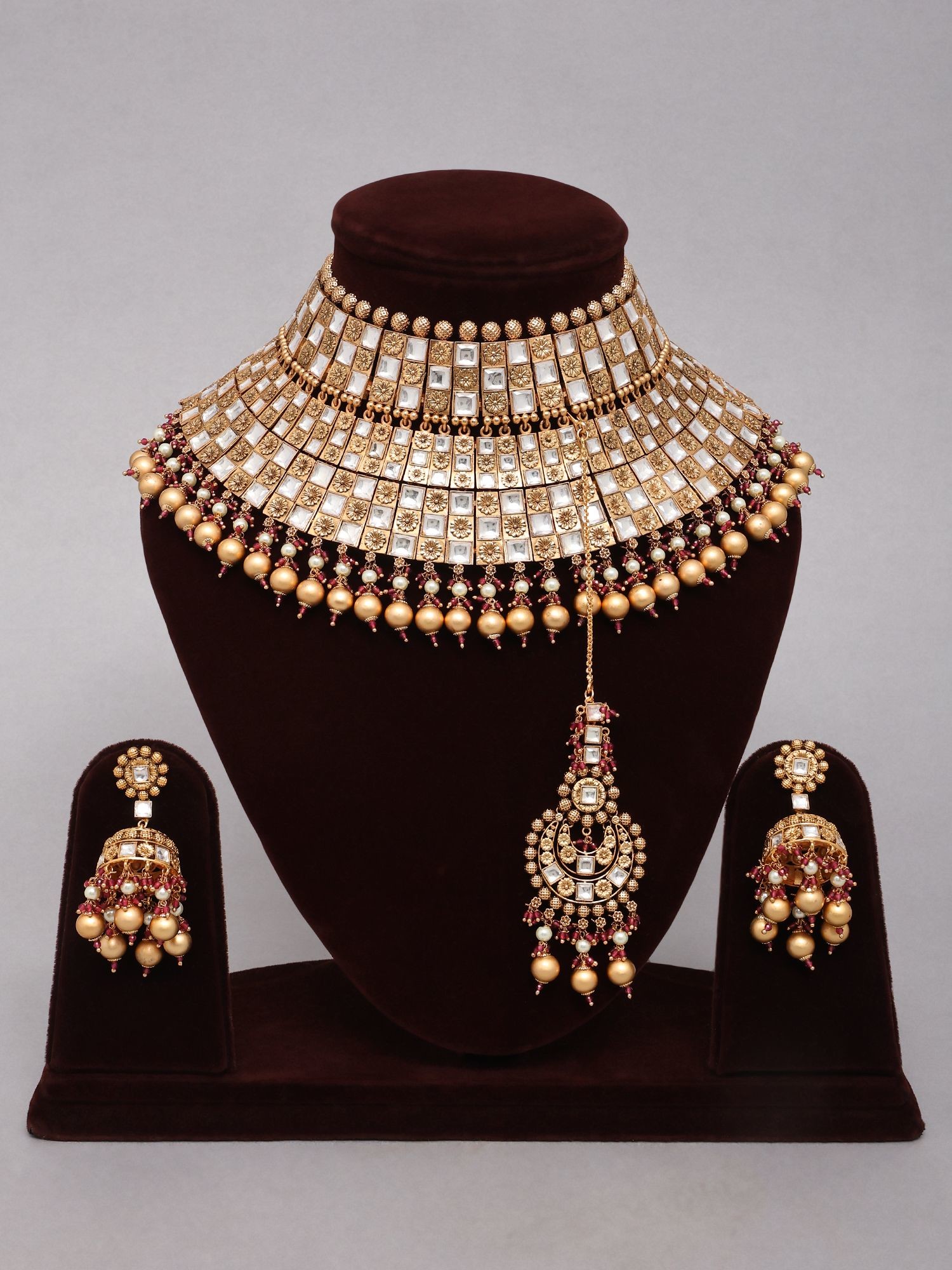 Bridal Kundan Choker Necklace Set with Square Embellishments and Maang Tikka