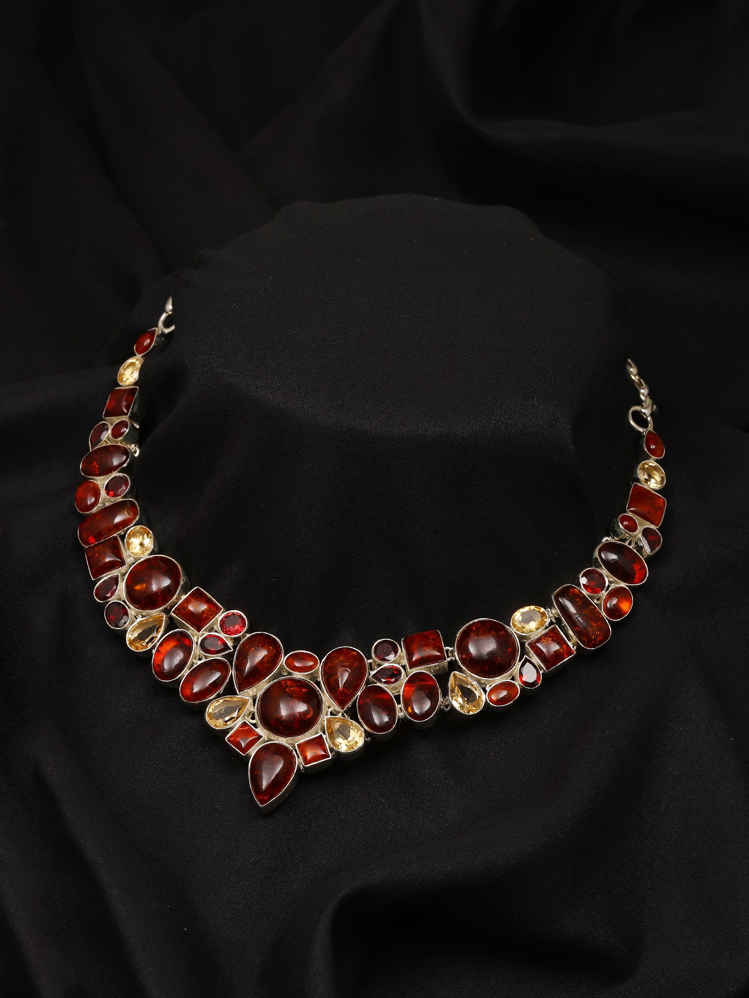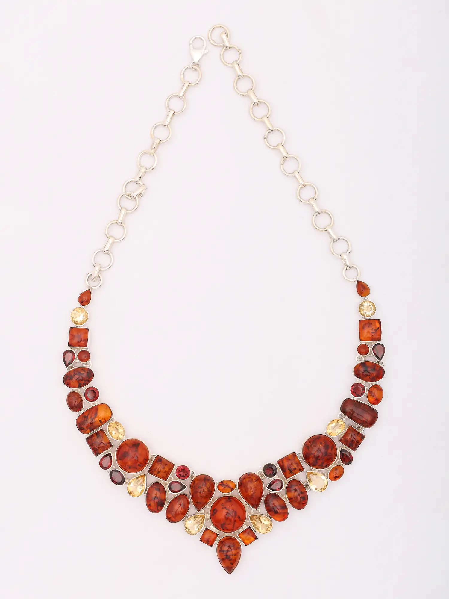 Discover a captivating piece that captures the warmth of ancient forests and the brilliance of sunlight. This exquisite necklace is a true statement of natural beauty and artisanal craftsmanship. Each element is meticulously chosen to create a harmonious blend of color and texture, designed to draw the eye and ignite conversation. The rich, deep hues of the amber cabochons, reminiscent of liquid gold and burnt caramel, are beautifully complemented by the vibrant, sun-kissed sparkle of citrine. Adding further depth and a touch of passionate fire are the deep red garnets, their faceted surfaces catching and reflecting light with every subtle movement.