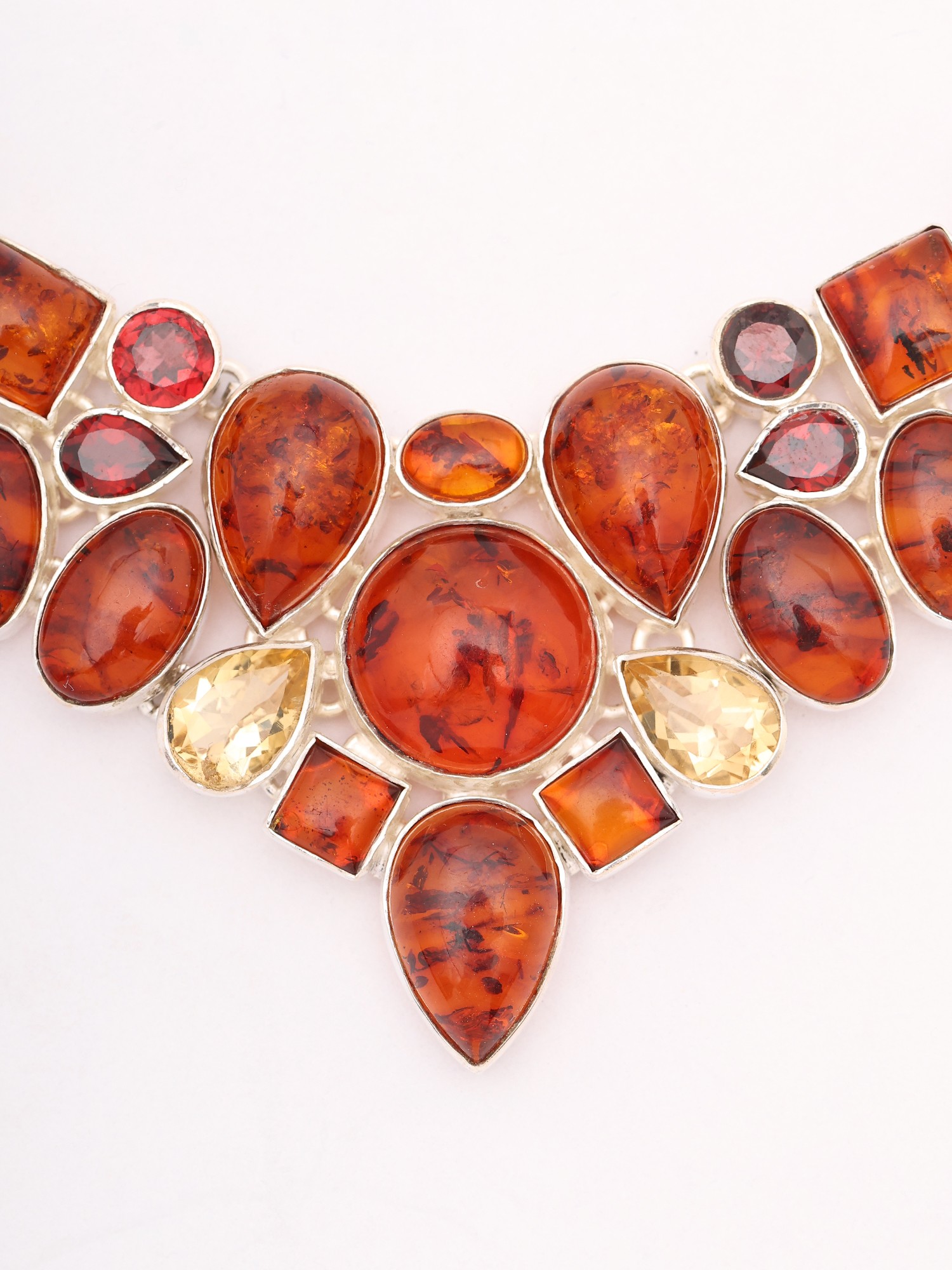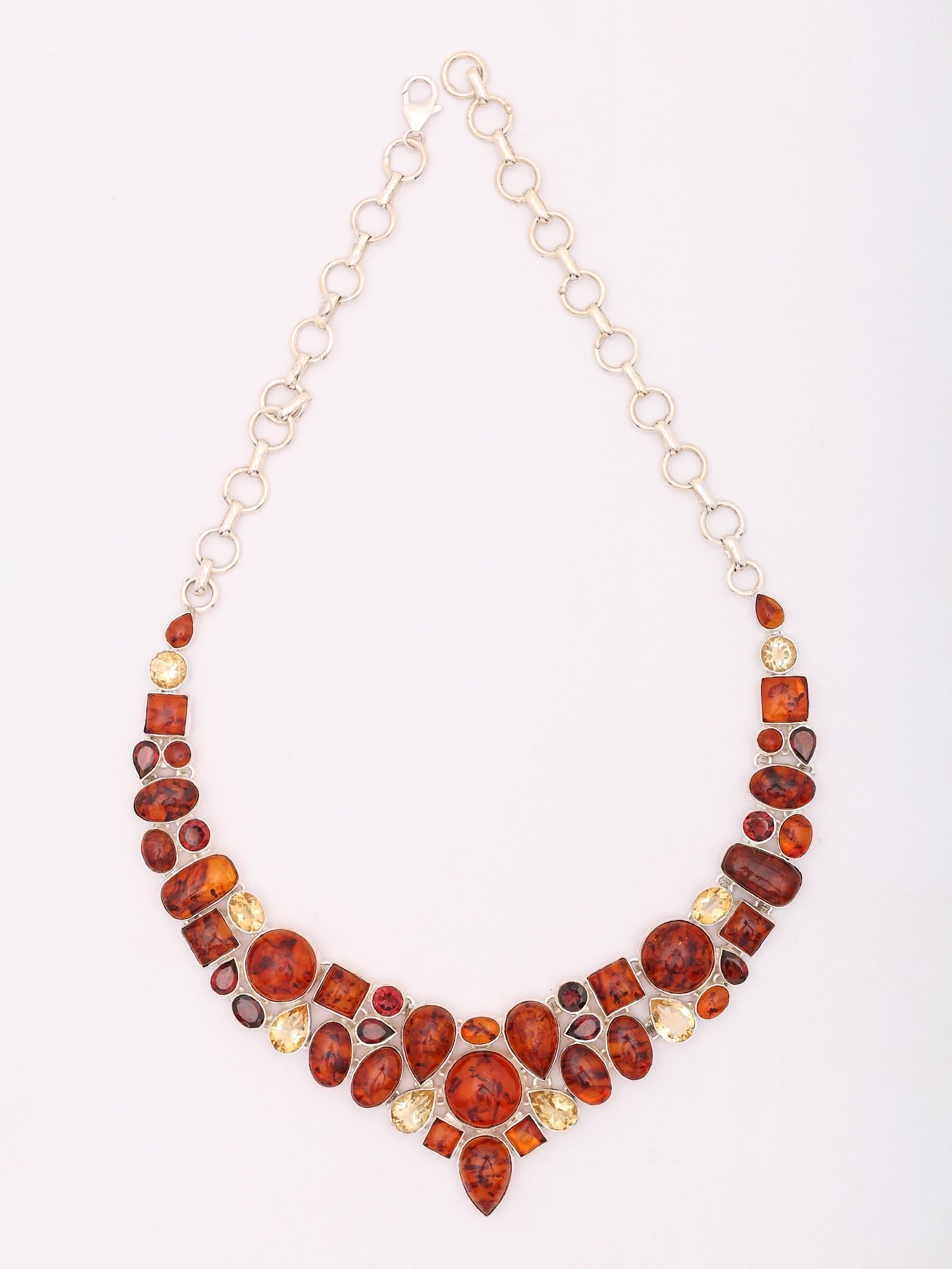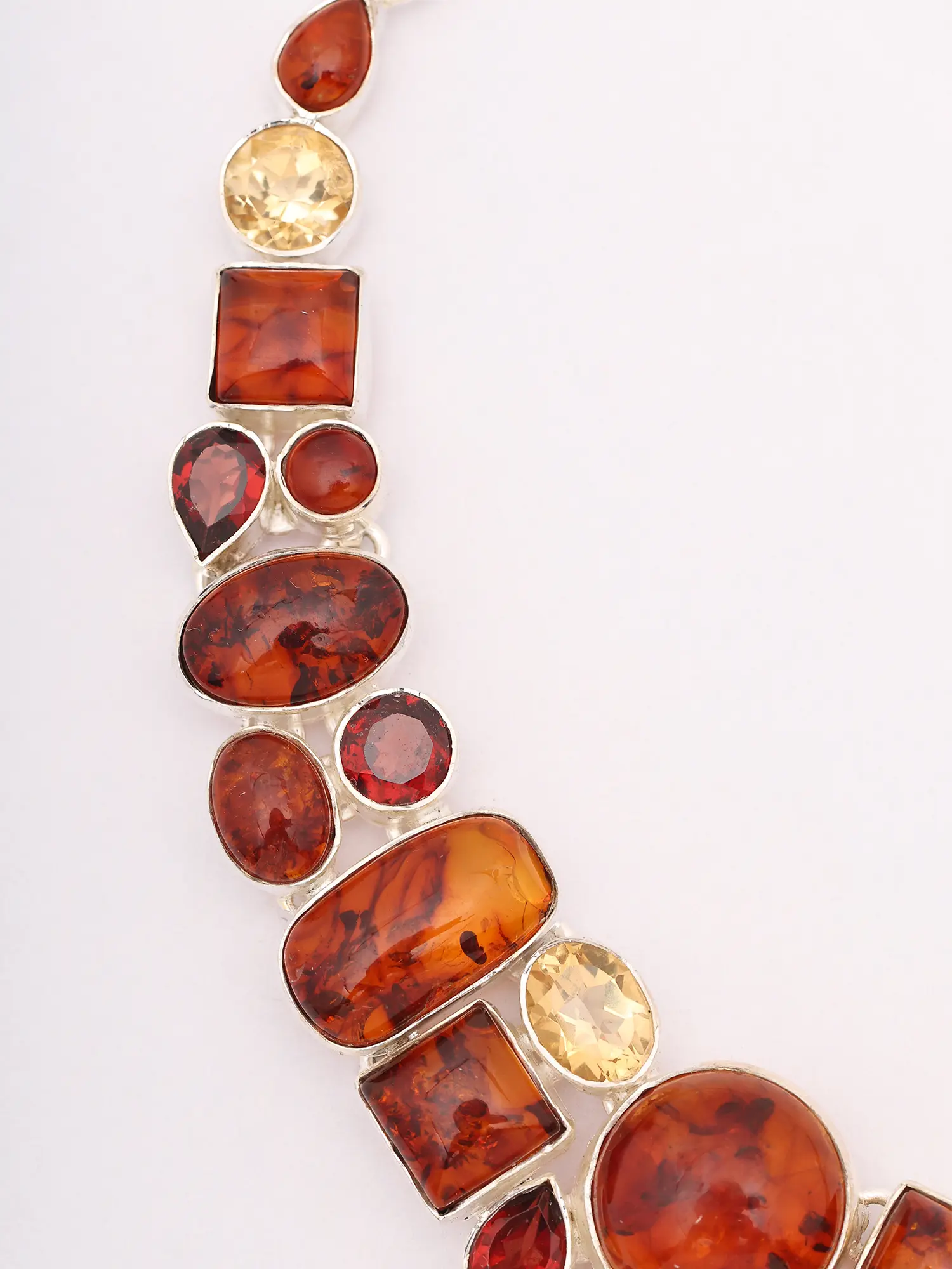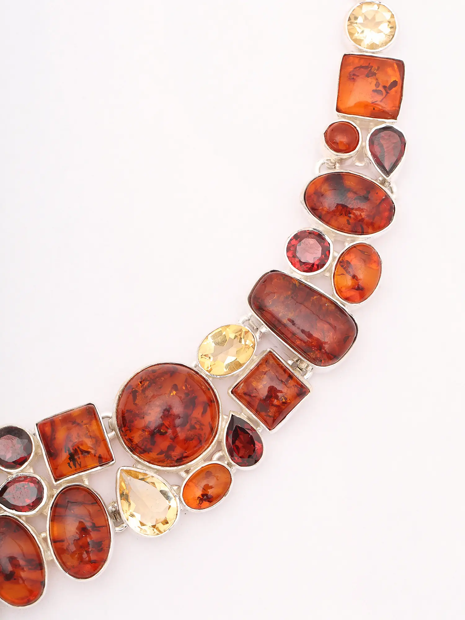 The luxurious warmth of the amber, citrine, and garnet is expertly set within a framework of gleaming sterling silver. This precious metal provides a cool, elegant contrast, allowing the vibrant gemstones to truly shine. The sterling silver setting is designed to enhance the organic beauty of each stone, with a smooth, polished finish that feels luxurious against the skin. The interplay of shapes – from the smooth, rounded cabochons to the sharper, geometric cuts – creates a dynamic visual rhythm, making this necklace a work of art to be admired from every angle. It's a piece that speaks of timeless style and an appreciation for the earth's most treasured gifts.