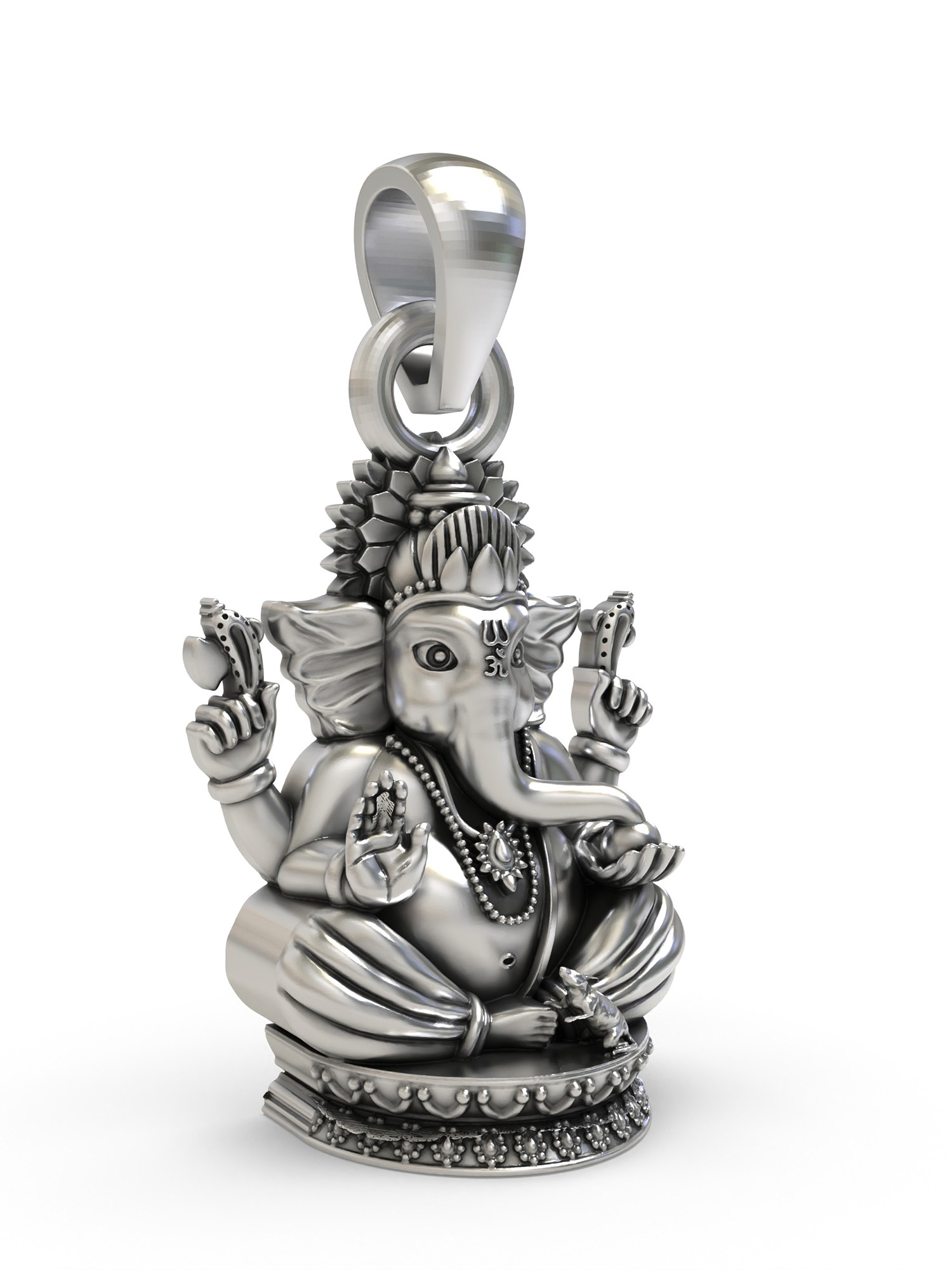 This pendant is meticulously sculpted from sterling silver, lending it a refined look and ensuring durability. The intricate detailing captures the essence of Ganesha, from his large ears that hear your prayers to his benevolent eyes and trunk. In his four hands, he holds symbols of his power and blessings. The design is three-dimensional, offering a captivating presence whether worn daily or on special occasions. A smooth, polished finish enhances the piece's elegance, making it a versatile addition to any jewelry collection.